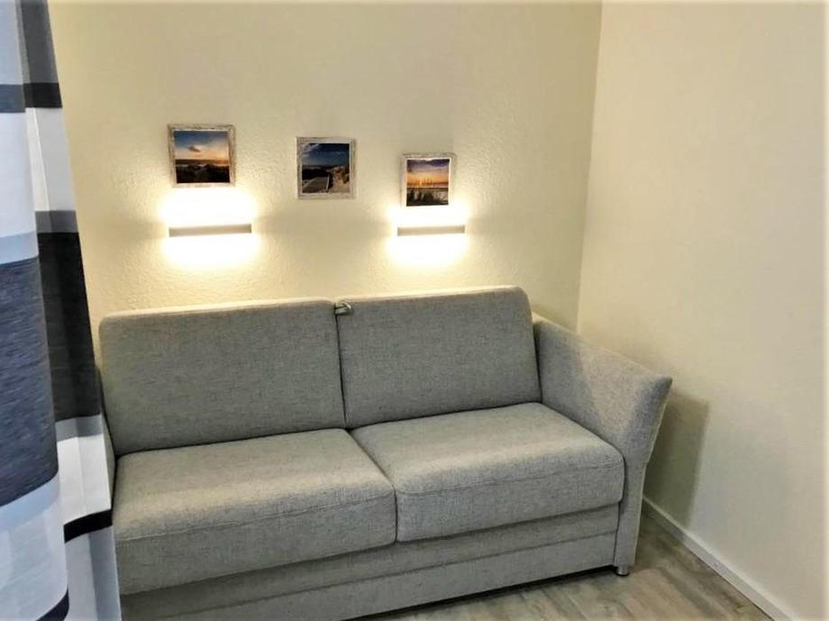 Ein gemütlicher Alkoven bietet zusätzlichen Rückzugsraum. Das Schlafsofa im Wohnbereich schafft weitere Schlafmöglichkeiten für Gäste.