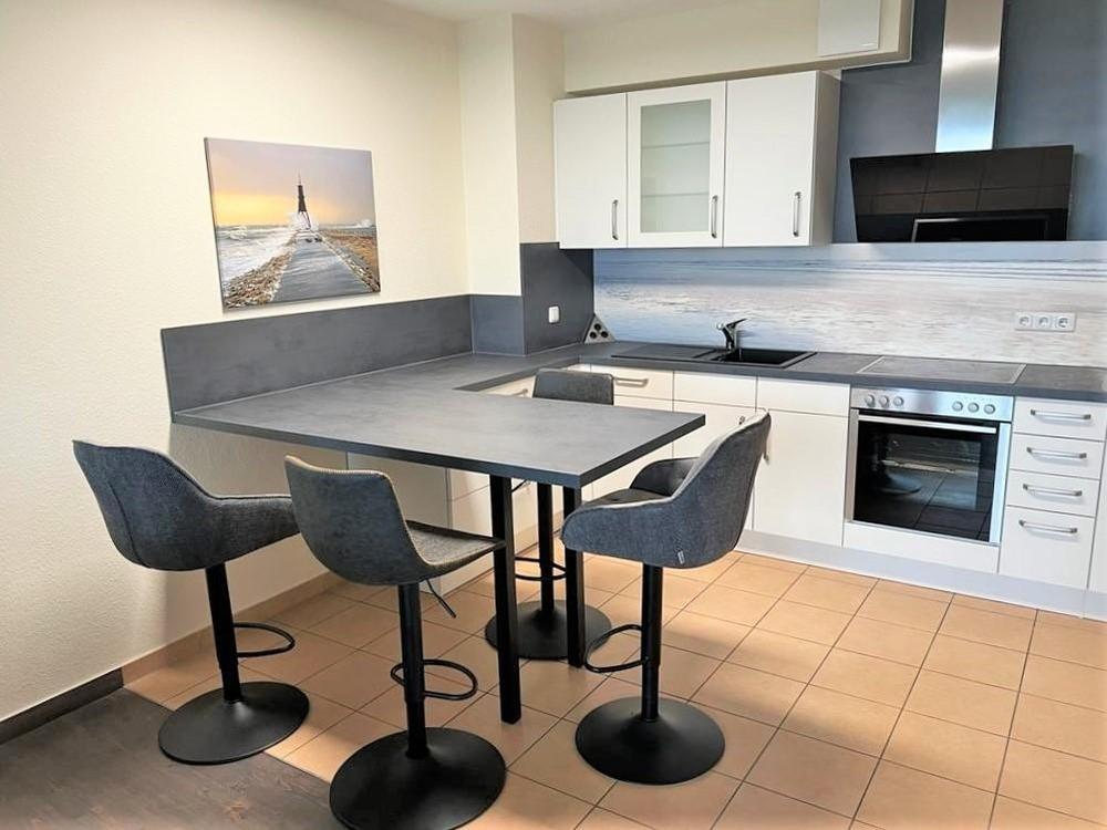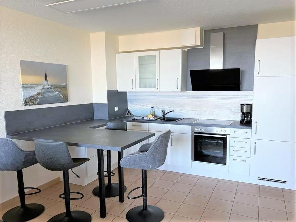 Im großzügigen Wohnbereich erwartet Sie eine komfortable Sitzgruppe mit direktem Meerblick. Die offene Küche mit erhöhtem Esstisch ist bestens ausgestattet und ideal für gemeinsame Kochabende. Zur Ausstattung gehören: