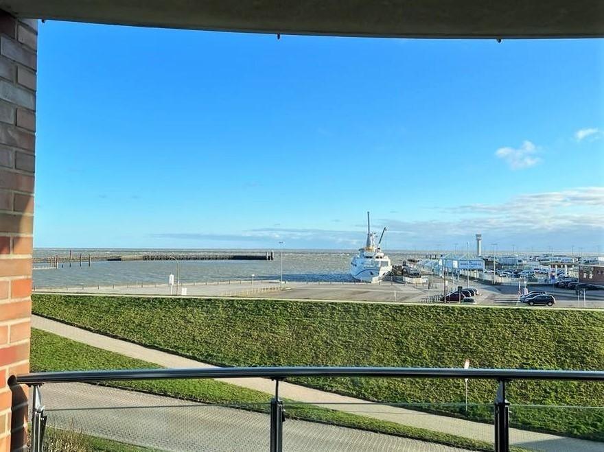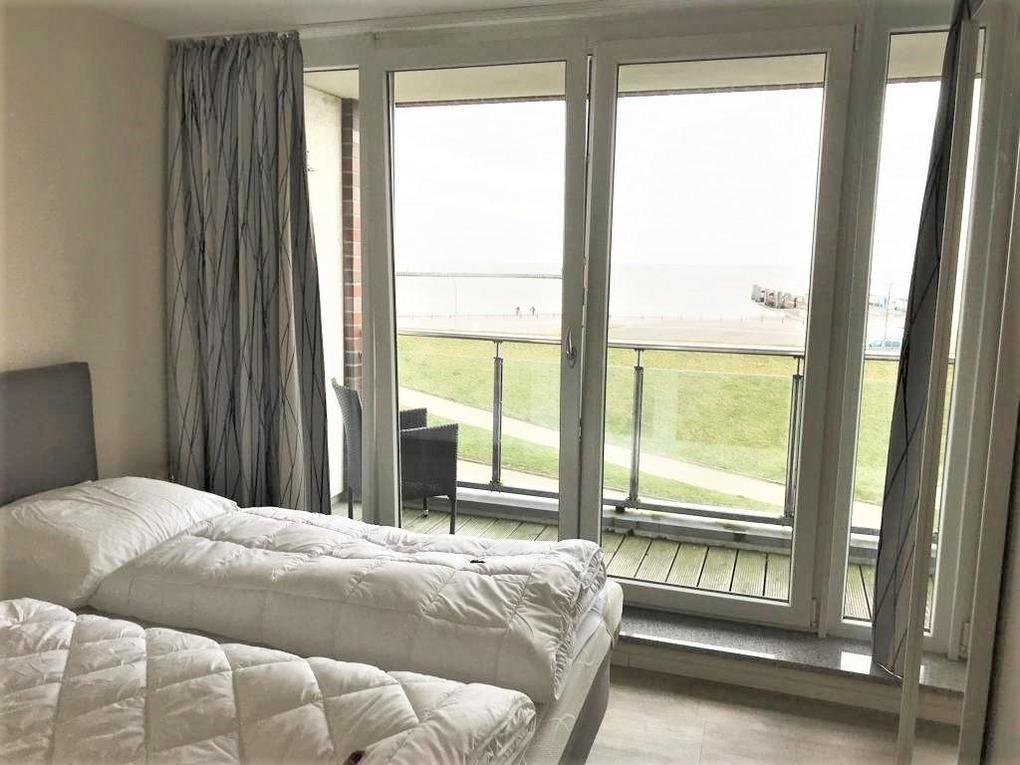 Sowohl vom Wohn- als auch vom Schlafzimmer haben Sie Zugang zum Balkon. Hier laden bequeme Möbel dazu ein, die frische Nordseeluft und den maritimen Ausblick in vollen Zügen zu genießen.