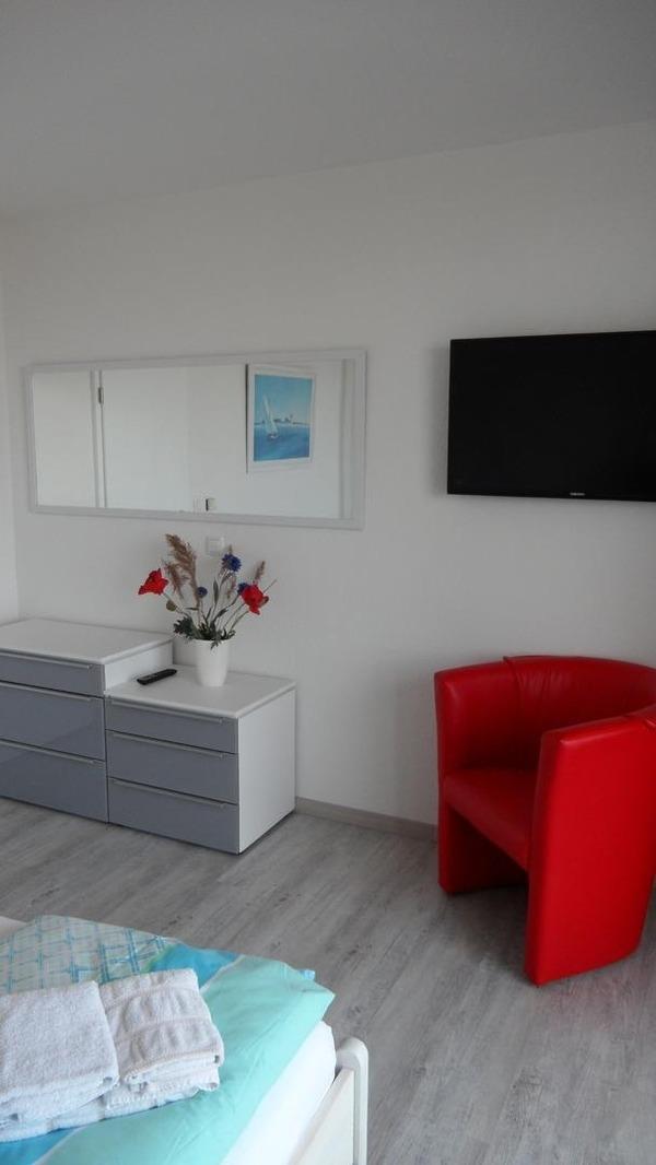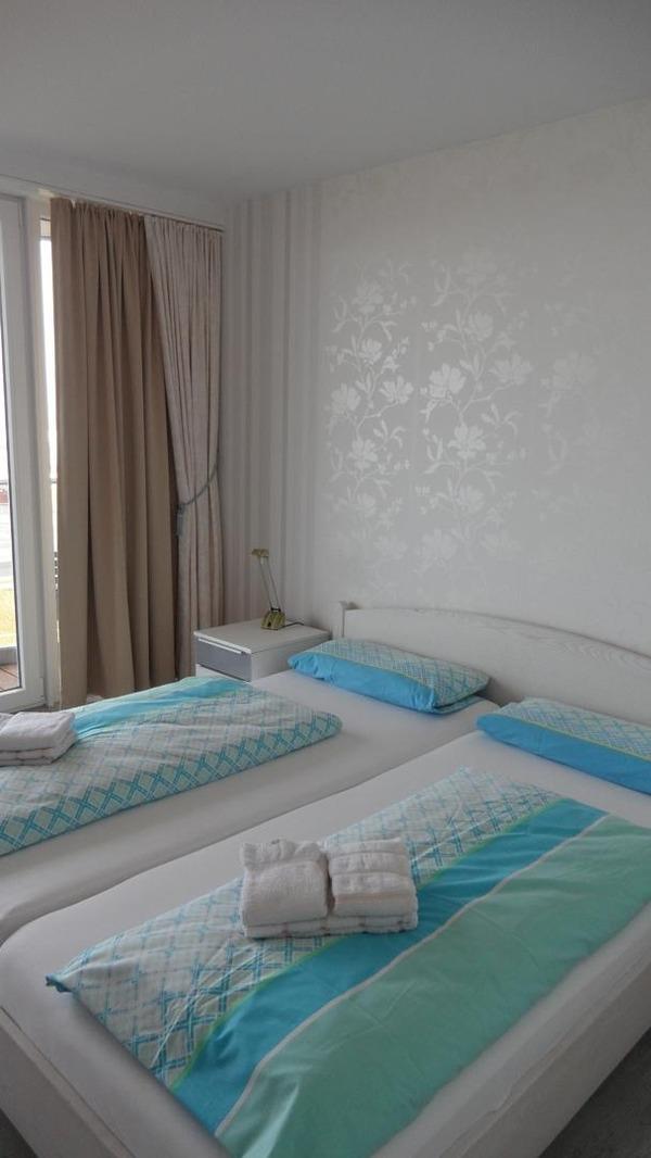 Genießen Sie den beeindruckenden Blick auf die Elbemündung von Ihrem großzügigen Balkon aus. Beobachten Sie vorbeiziehende Schiffe, spüren Sie die frische Meeresluft und lassen Sie bei einem Glas Wein die Seele baumeln. Das Doppelschlafzimmer verfügt über zwei bequeme Betten (2 x 90 x 200 cm), ein separates Schrankzimmer sorgt für zusätzlichen Stauraum, und das Schlafsofa im Wohnbereich bietet eine Schlafmöglichkeit für zwei weitere Personen.