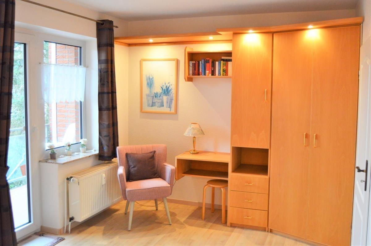 Das großzügige Schlafzimmer ist mit einem komfortablen Doppelbett, einem geräumigen Kleiderschrank mit integriertem Schreibtisch sowie einer gemütlichen Leseecke ausgestattet. Der Südbalkon bietet beste Sonnenlage und lädt zum Verweilen ein.