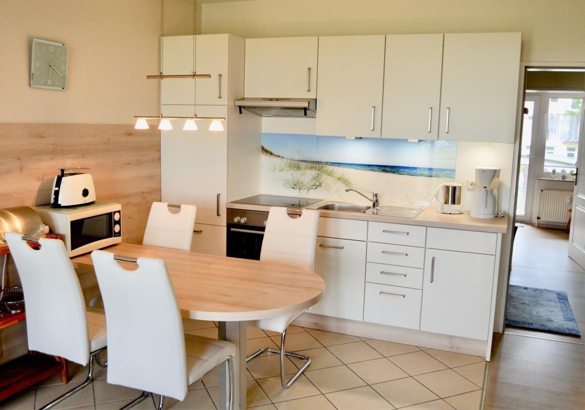 Im Wohnzimmer können Sie es sich im Relax-Sessel gemütlich machen und dabei das maritime Treiben im Hafen beobachten. Zusätzlich stehen Ihnen eine Couch sowie ein Schlafsofa (1,40 m Liegefläche für 1 Person) zur Verfügung.Die integrierte Küche verfügt über ein Cerankochfeld mit Backofen, Kühlschrank mit Gefrierfach, Mikrowelle, Kaffeemaschine und Toaster – perfekt für Ihre Selbstverpflegung im Urlaub.