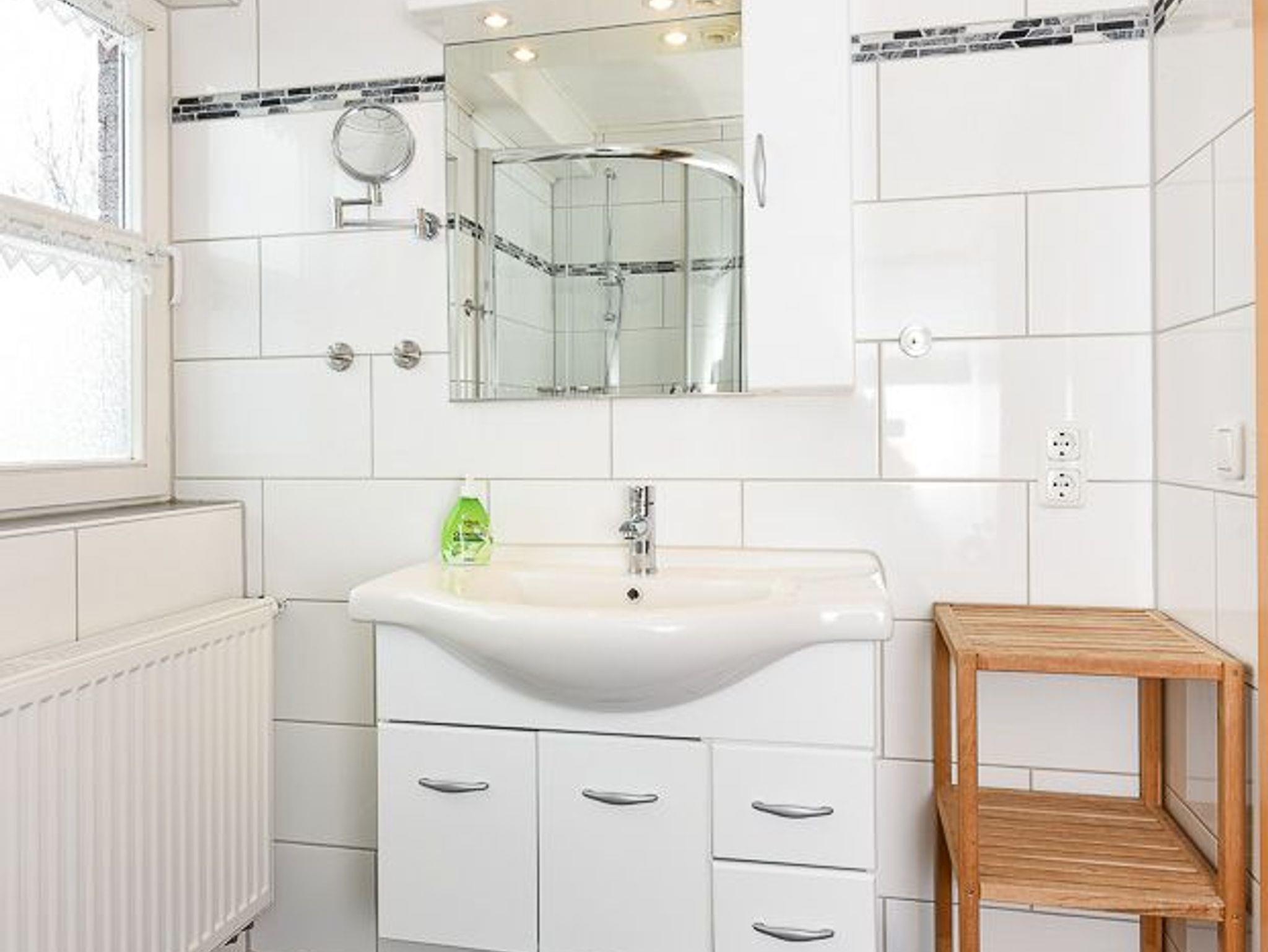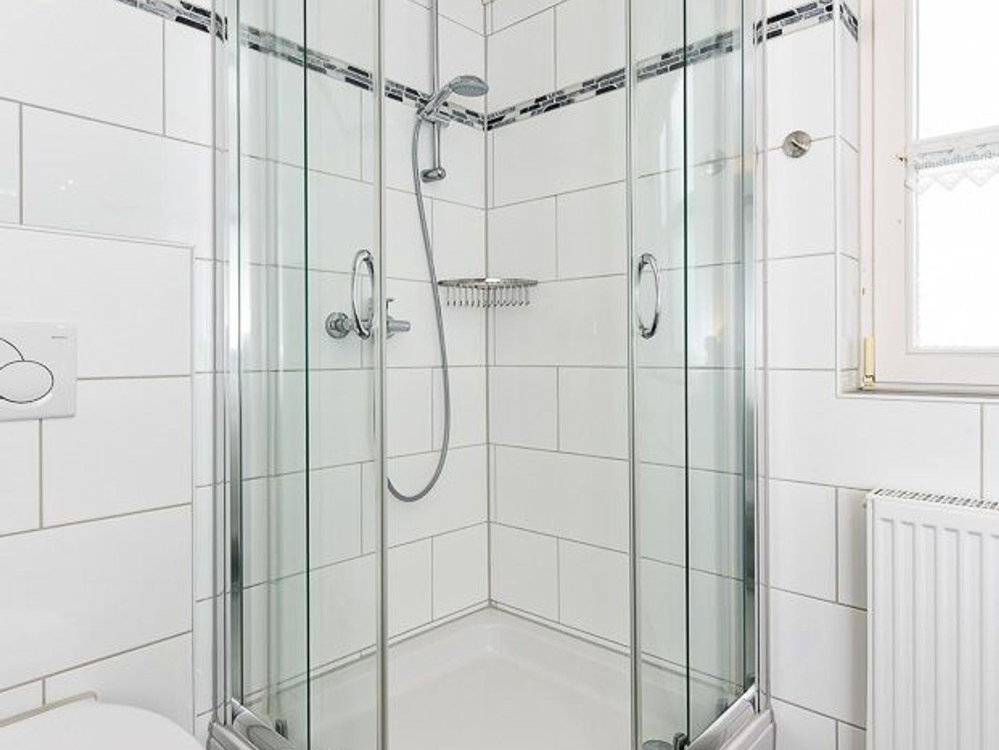 Badezimmer mit Dusche, Waschtisch und WC, Terrasse (Sitzgruppe im Garten), optimal für 2 bis 4 Personen.