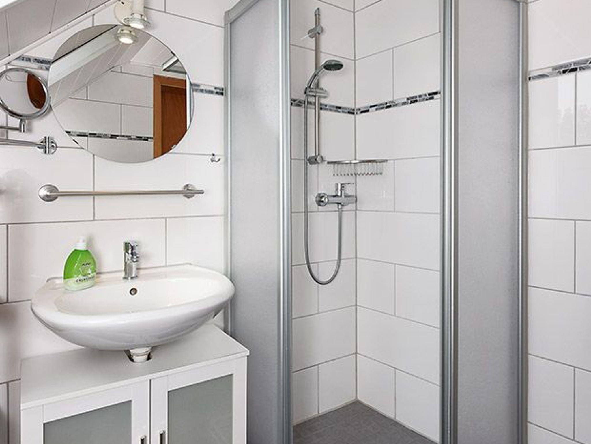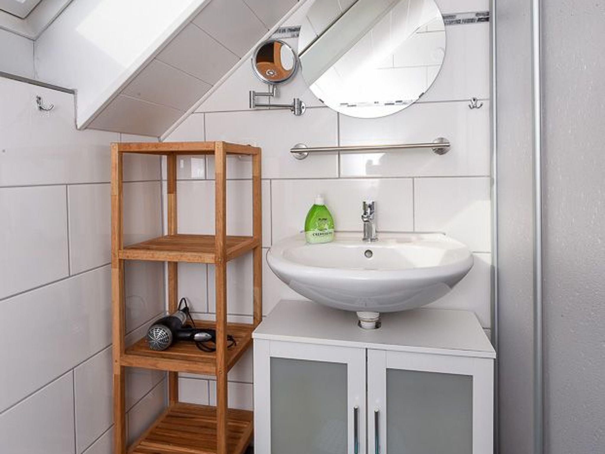 Badezimmer mit Dusche, Waschtisch und WC, Obergeschoss, Terrasse (Sitzgruppe im Garten), optimal für 2 bis 4 Personen.