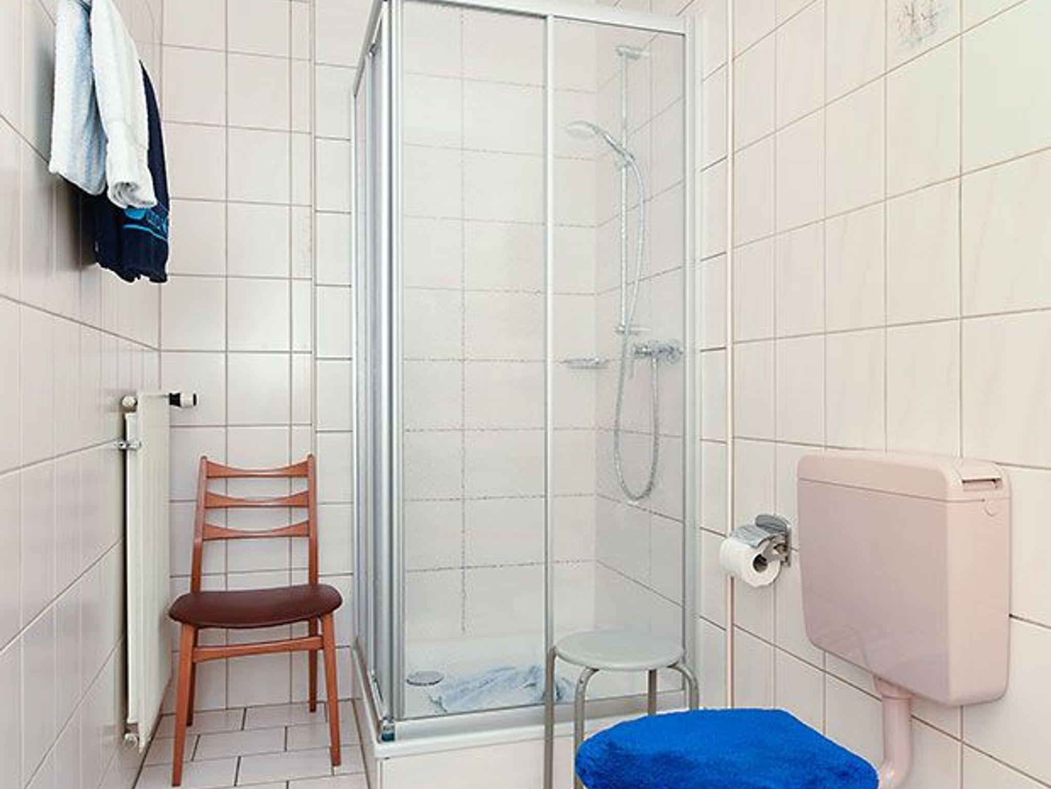 Zimmer, Badezimmer mit Dusche, Waschtisch und WC, Obergeschoss, optimal für 2 bis 3 Personen.