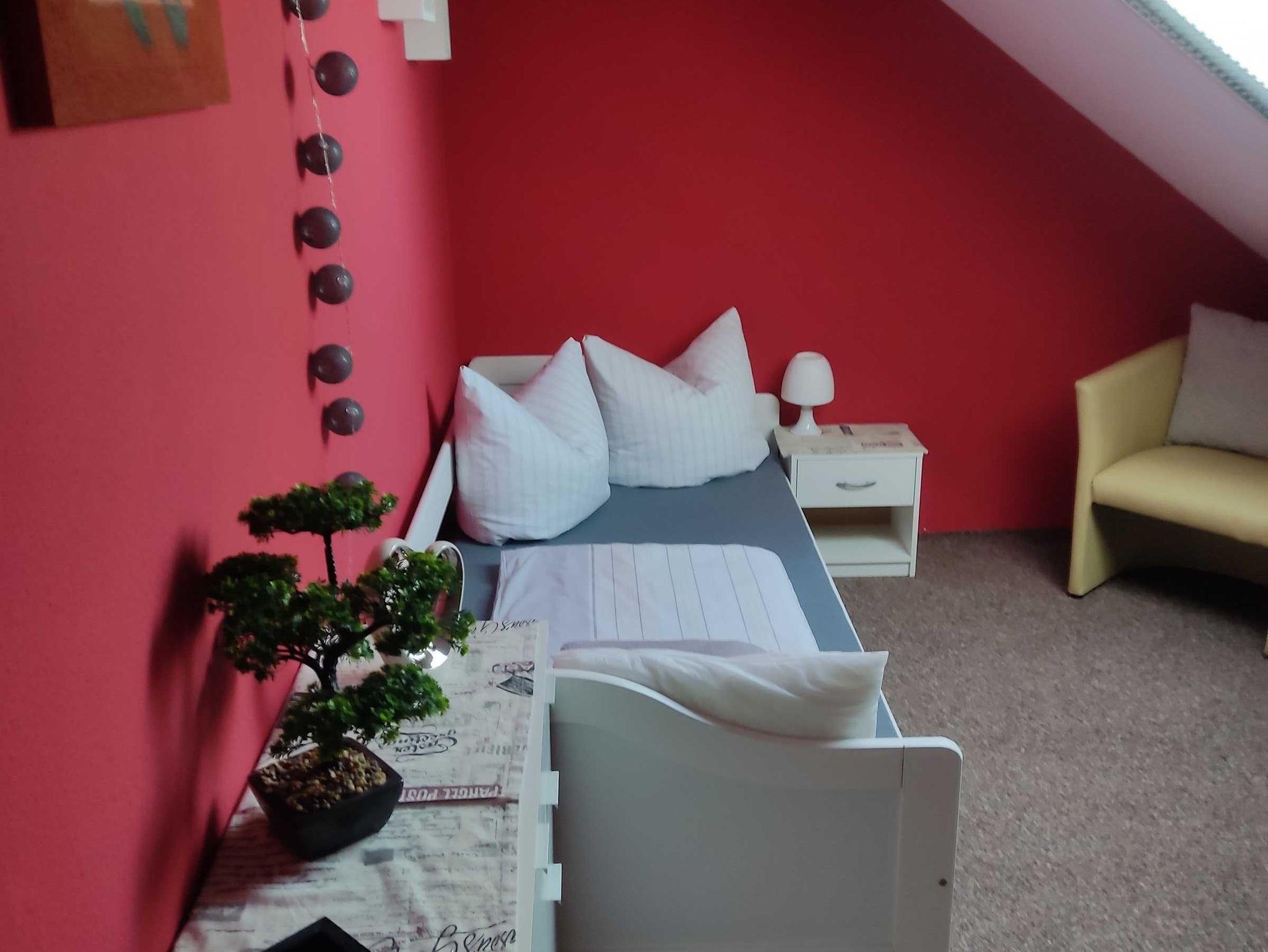 Unsere Dachgeschoss Ferienwohnung mit seinen 80 m² verfügt über einen Wohnraum mit Sitzecke, einen Flachbild TV, einem Esstisch sowie zwei Relaxsesseln.