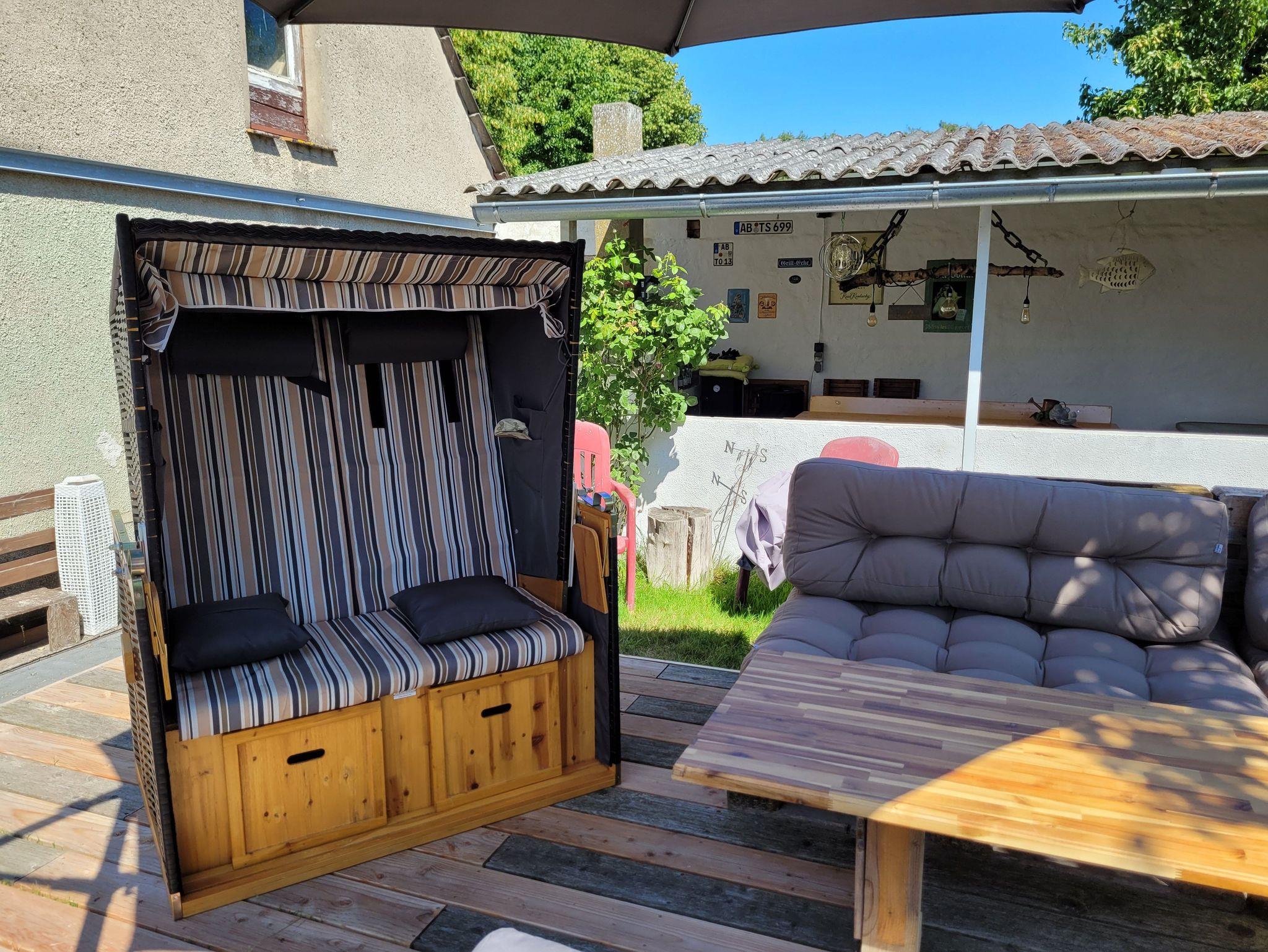 Im Garten steht eine gemütliche Terrasse mit Sitzmöbel und ein Strandkorb zur Verfügung. Sollte das Wetter mal etwas ungemütlich werden, kann zusätzlich eine überdachte Terrasse genutzt werden. Für Grillabende steht ein großer Grill bereit.