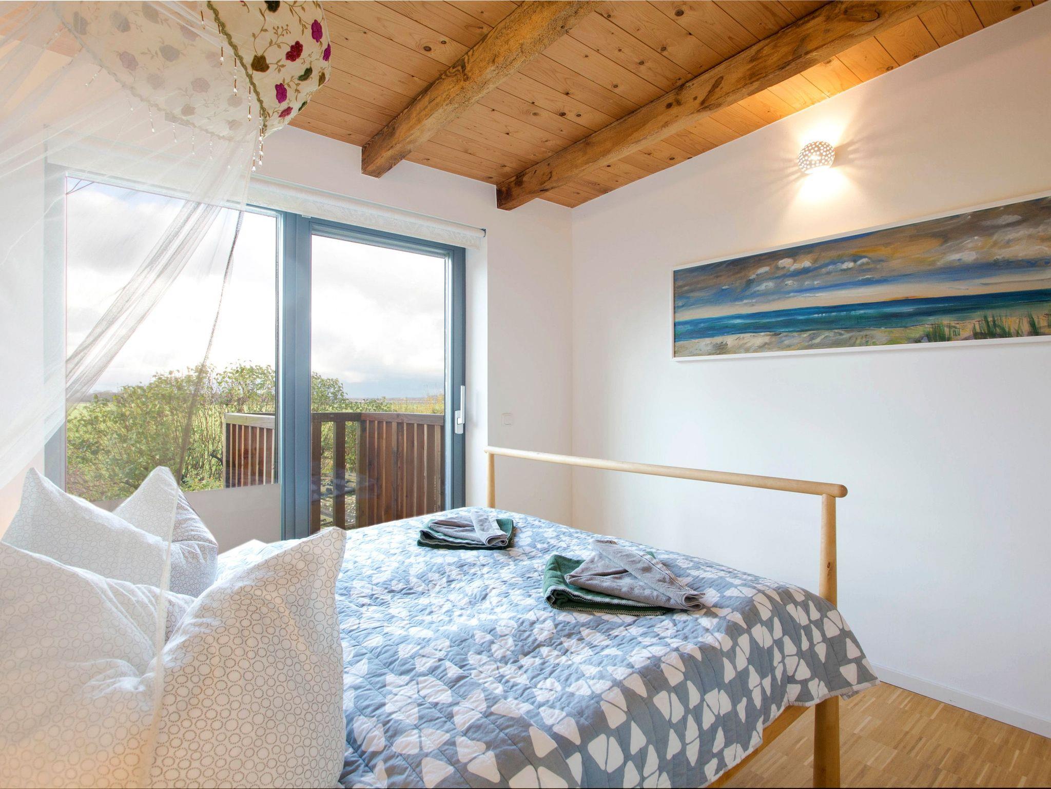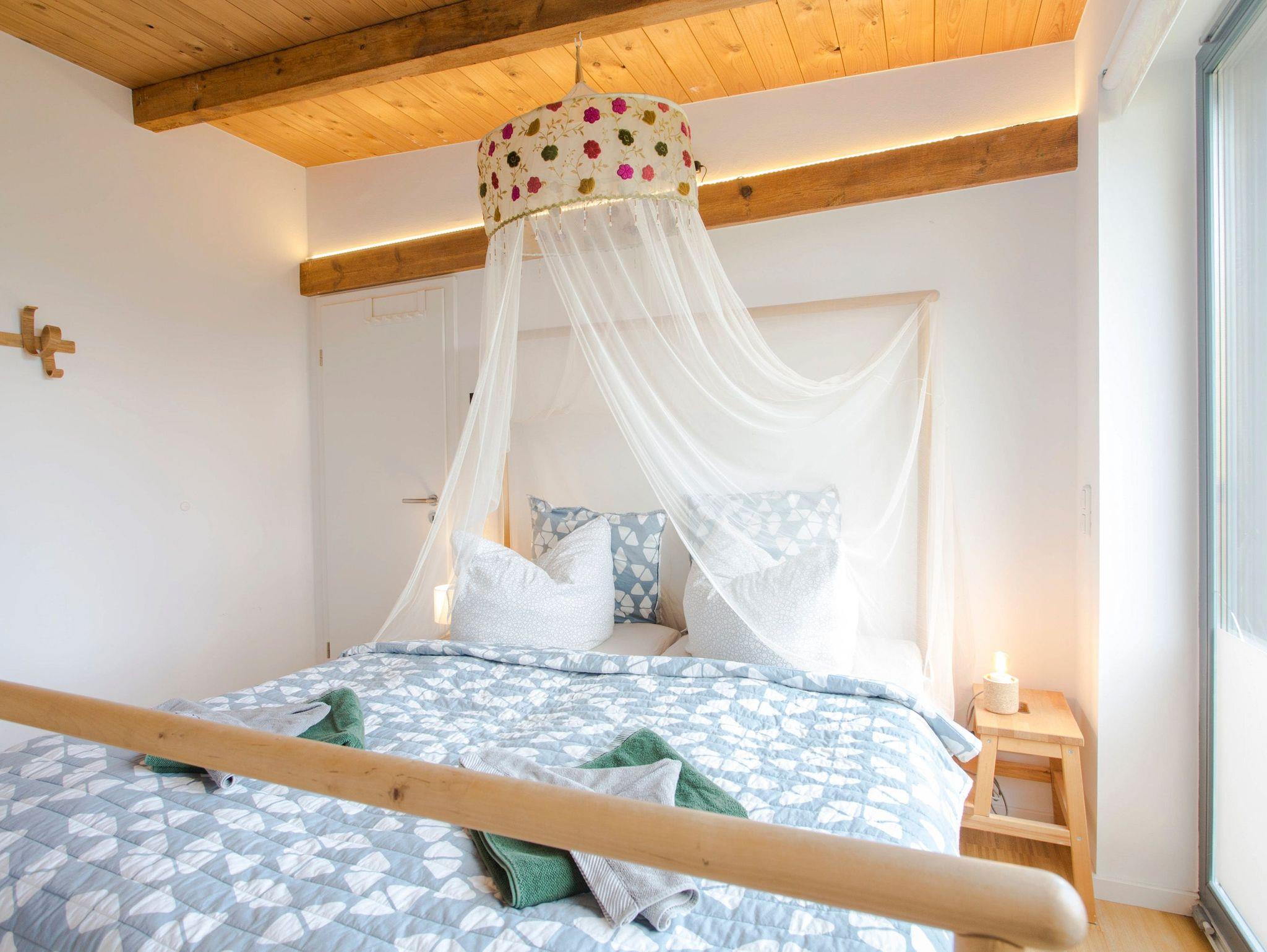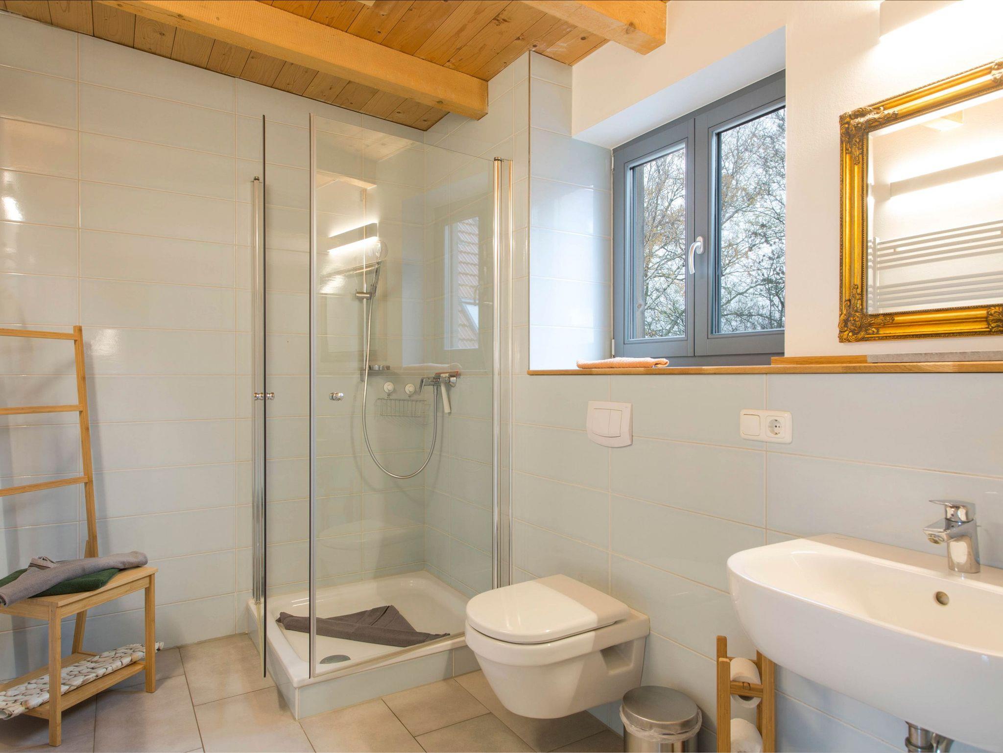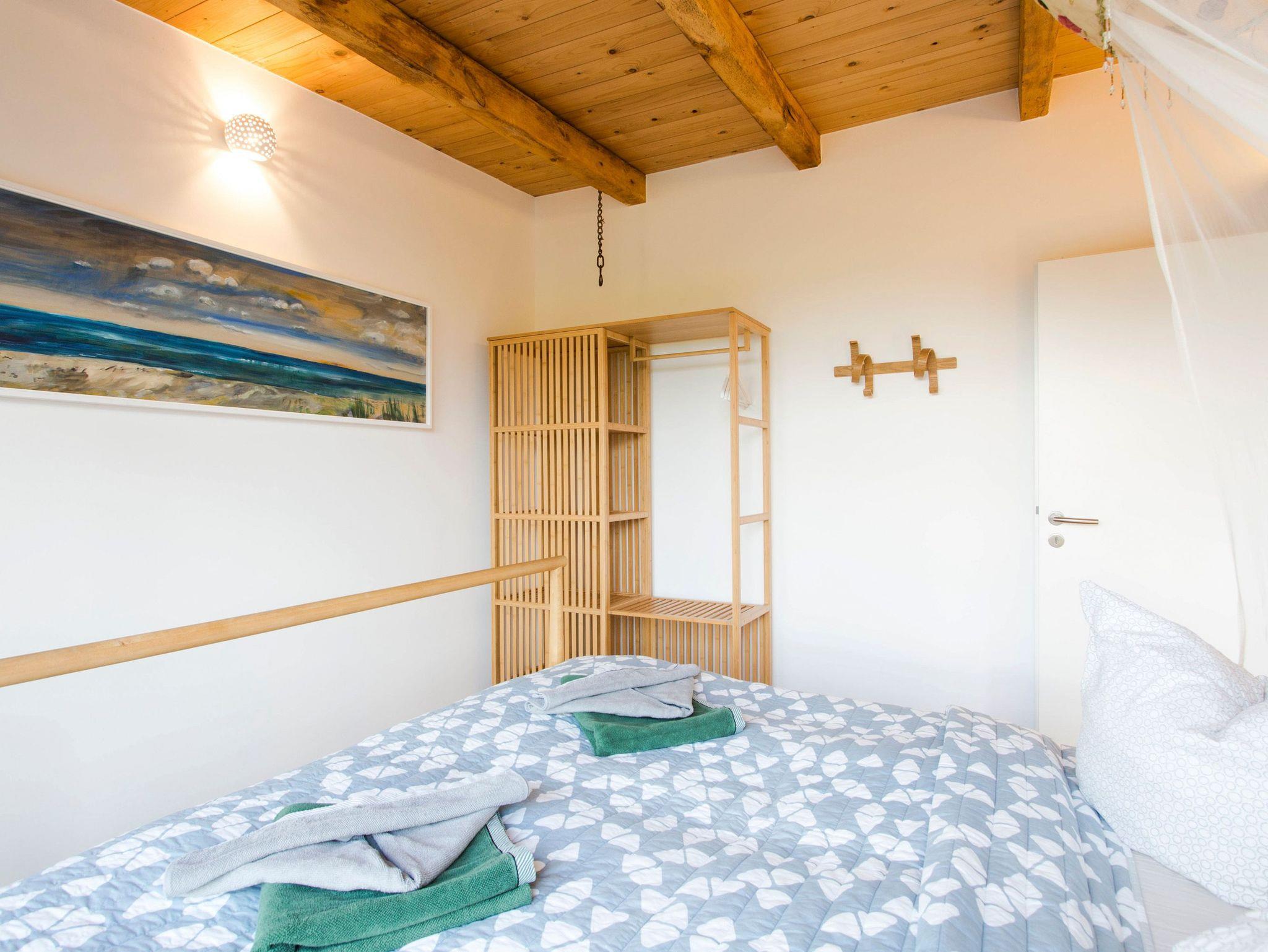 Das Scheunenloft Westblick im ehemaligen Heuboden des Stalls bietet auf 96 m² für bis zu 6 Personen genügend Platz. Das Herzstück ist das Wohnzimmer mit offener Küche und einem atemberaubenden Panoramablick über die Wiesen bis hin zum Bodden. Auf dem gemütlichen Schlafsofa (2x80x200) können sie gemeinsame Abende verbringen oder die nächsten Ausflüge planen. Die modern und offen gestaltete Küche ist voll ausgestattet mit einem Kühlschrank, Backofen, Induktionskochfeld, Geschirrspüler und Utensilien des täglichen Bedarfs. Die beiden Schlafzimmer verfügen einmal über ein Doppelbett (160x200, getrennte Matratzen) und einmal über ein Etagenbett (90x200, 140x200). Im Bad befindet sich eine Dusche, Waschbecken und WC.