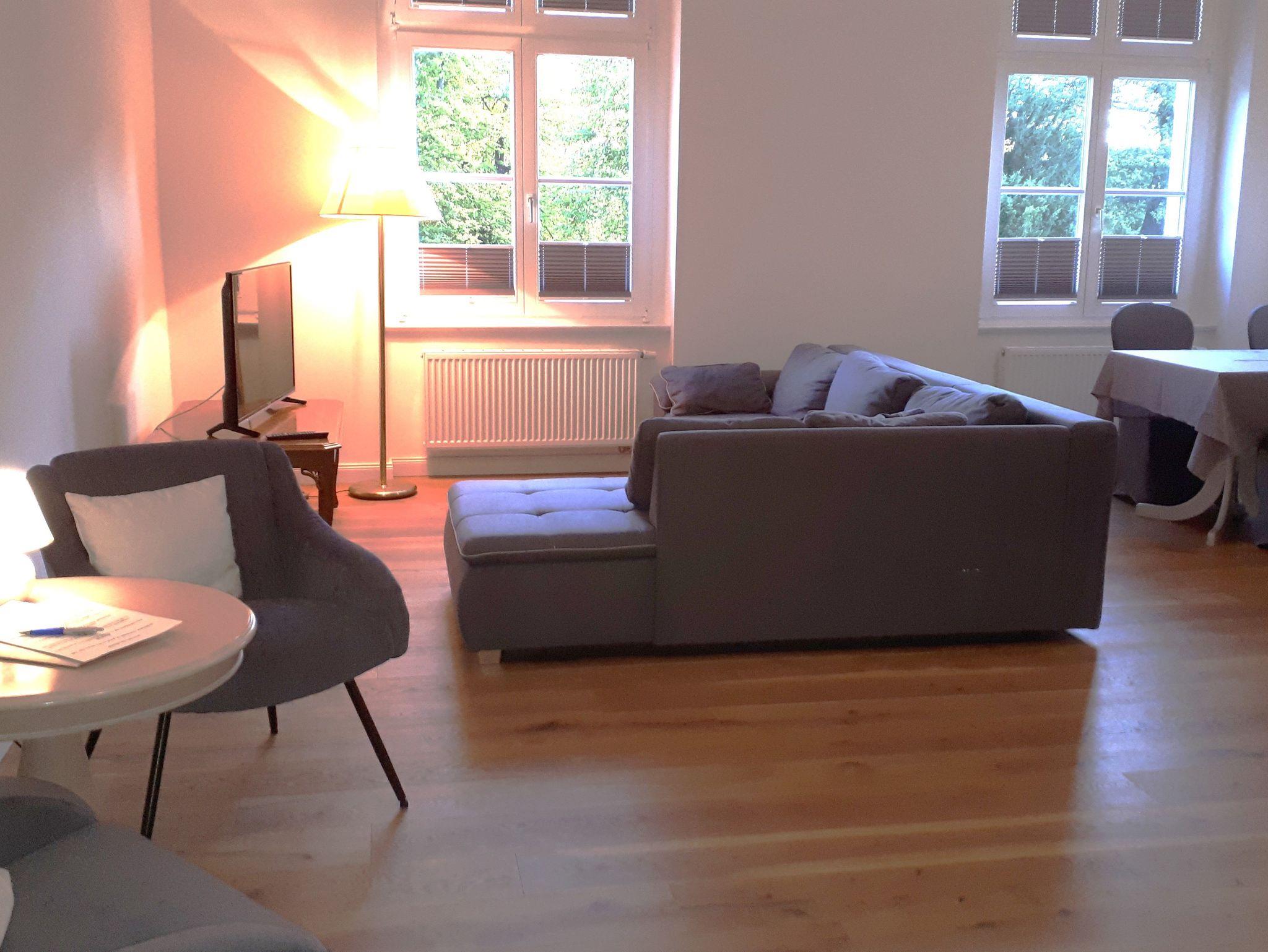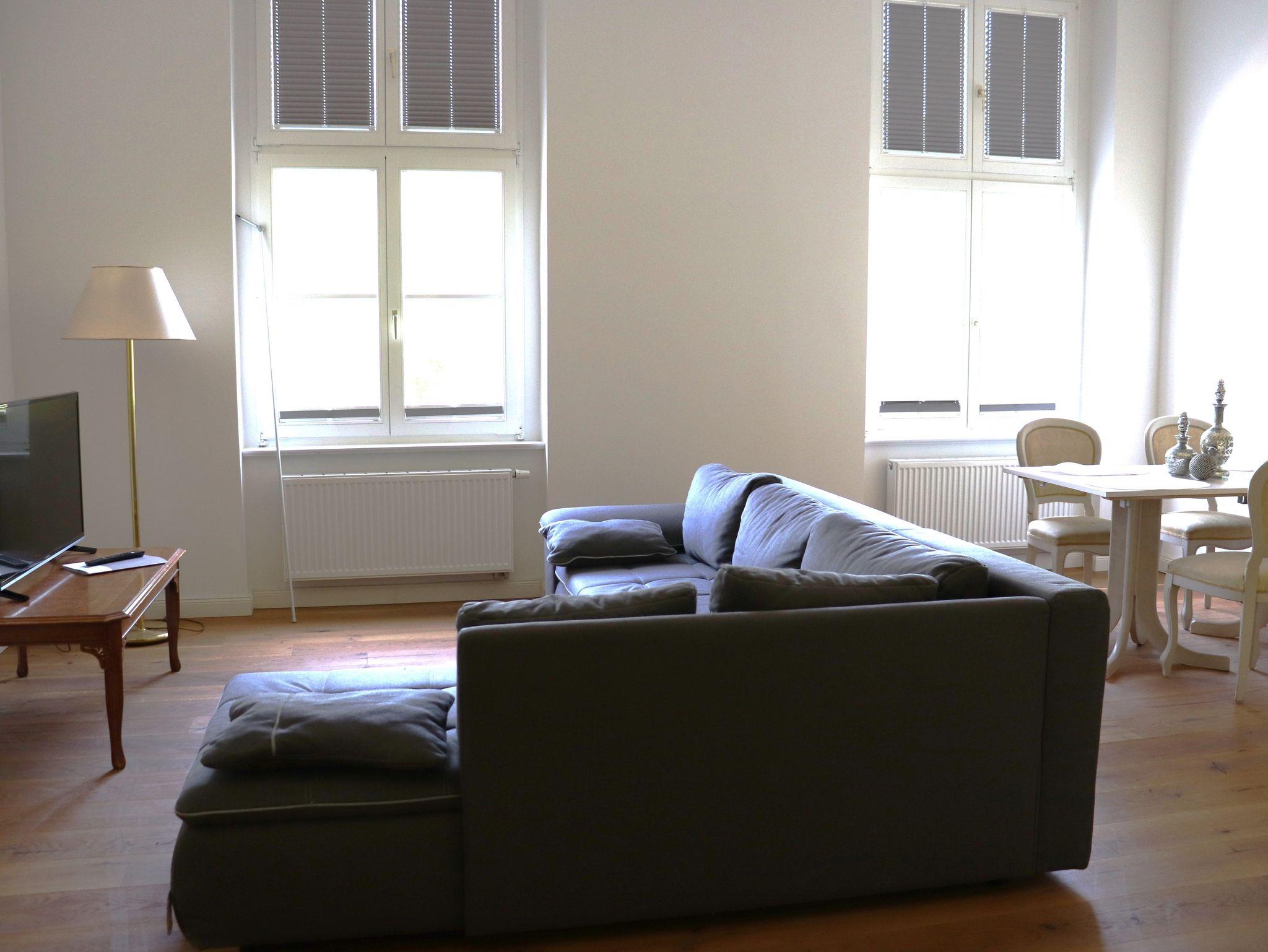 Das Wohnzimmer ist mit einer großen Eck-Schlafcouch (1,60 Meter breit) sowie einer hochwertigen, modernen Küchenzeile inklusive Geschirrspülmaschine, Nespresso Kaffeemaschine und weiteren Küchenutensilien ausgestattet. Die Wohnung verfügt über 2 neue, moderne Bäder mit bodentiefen Duschen.