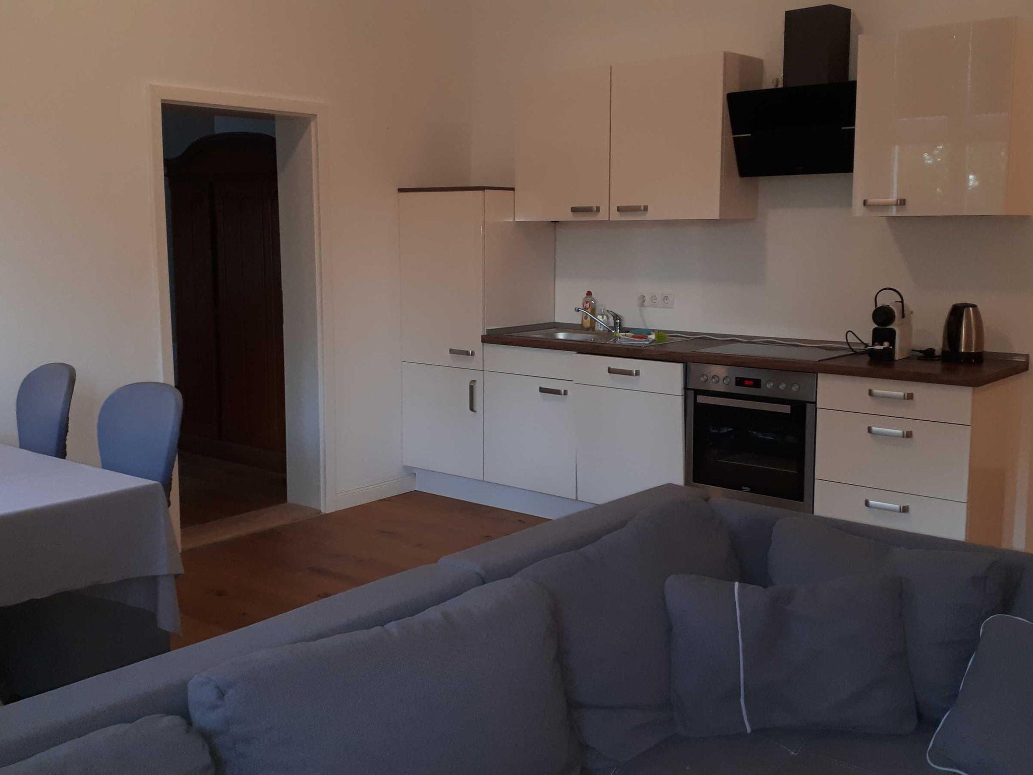 Alle Wohnungen sind ausgestattet mit einer modernen Küchenzeile, einem Kühlschrank und einer Backofen-/Mikrowellen-Kombination. In Anlehnung an das Gesamtkonzept der Kontraste ist das klassische Schloss innen hochmodern eingerichtet. So gibt es auch für Feriengäste sowohl modern, als auch klassisch ausgestattete Apartments.