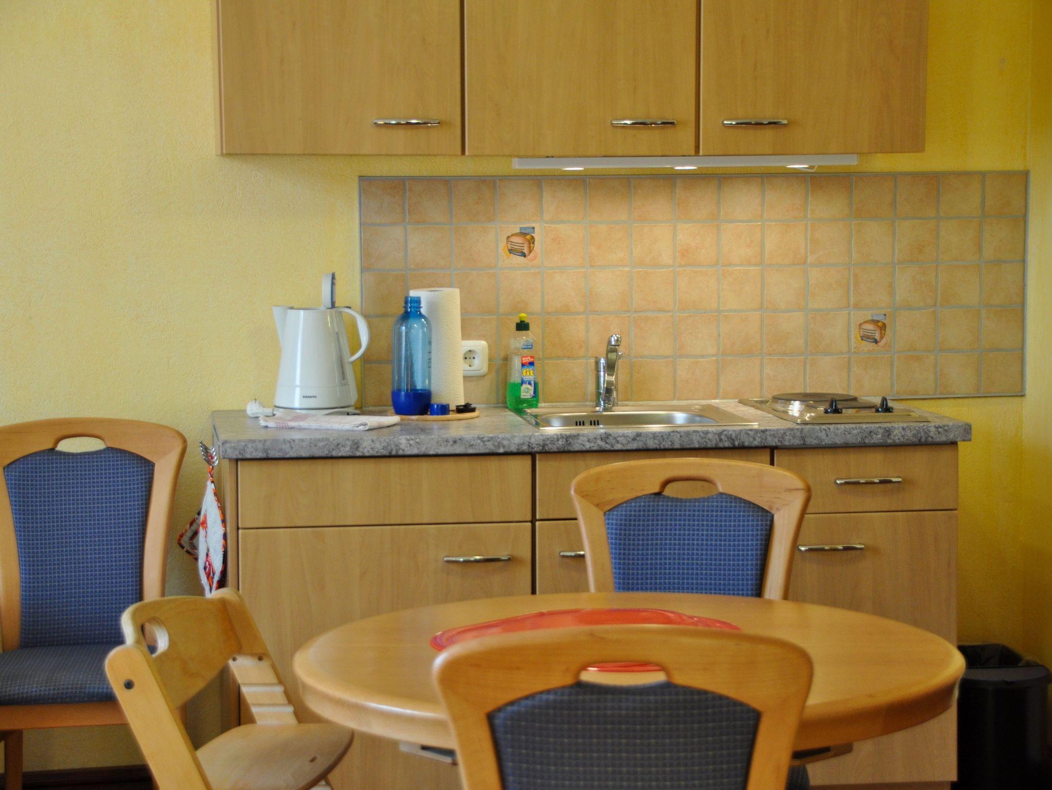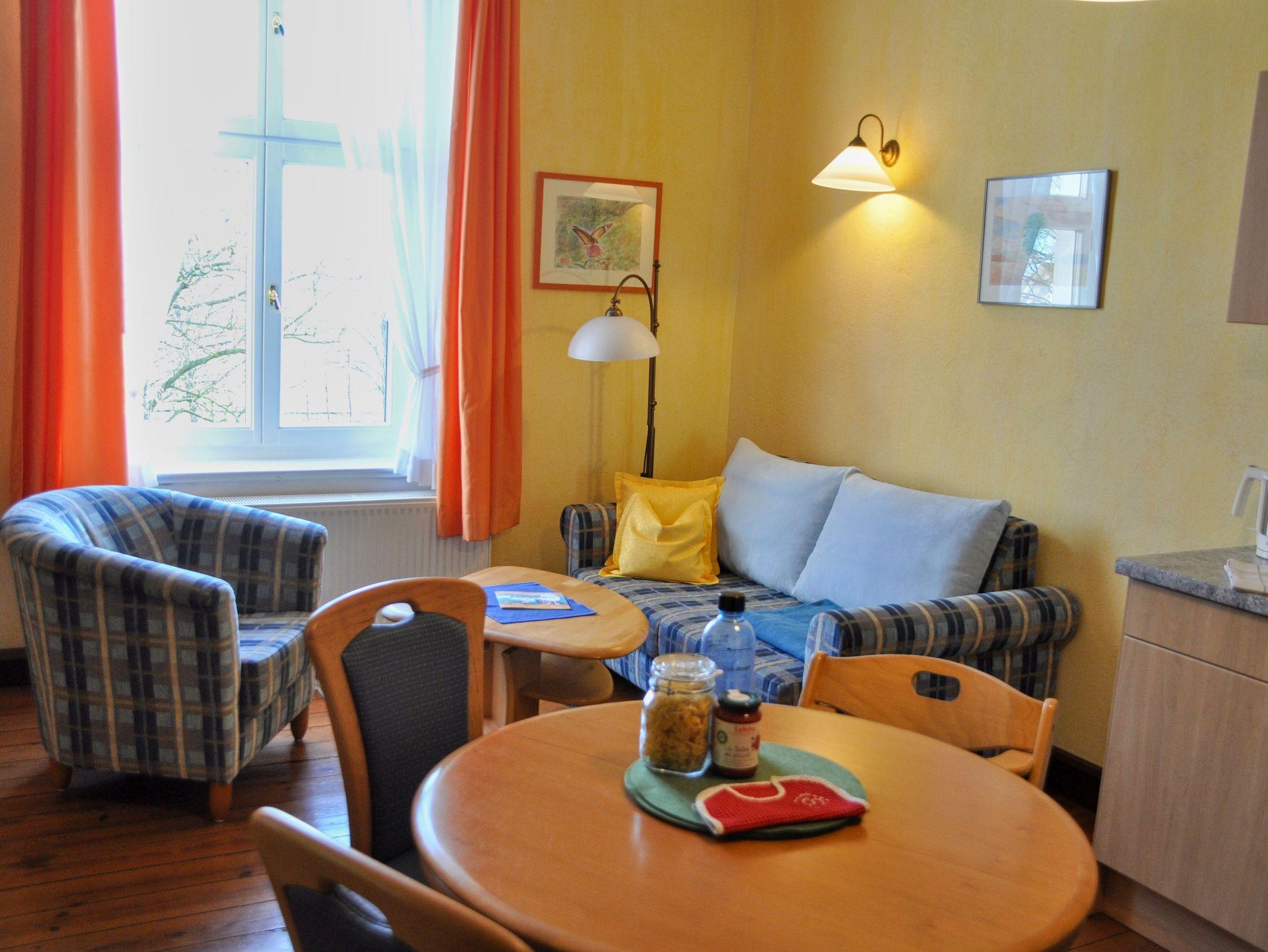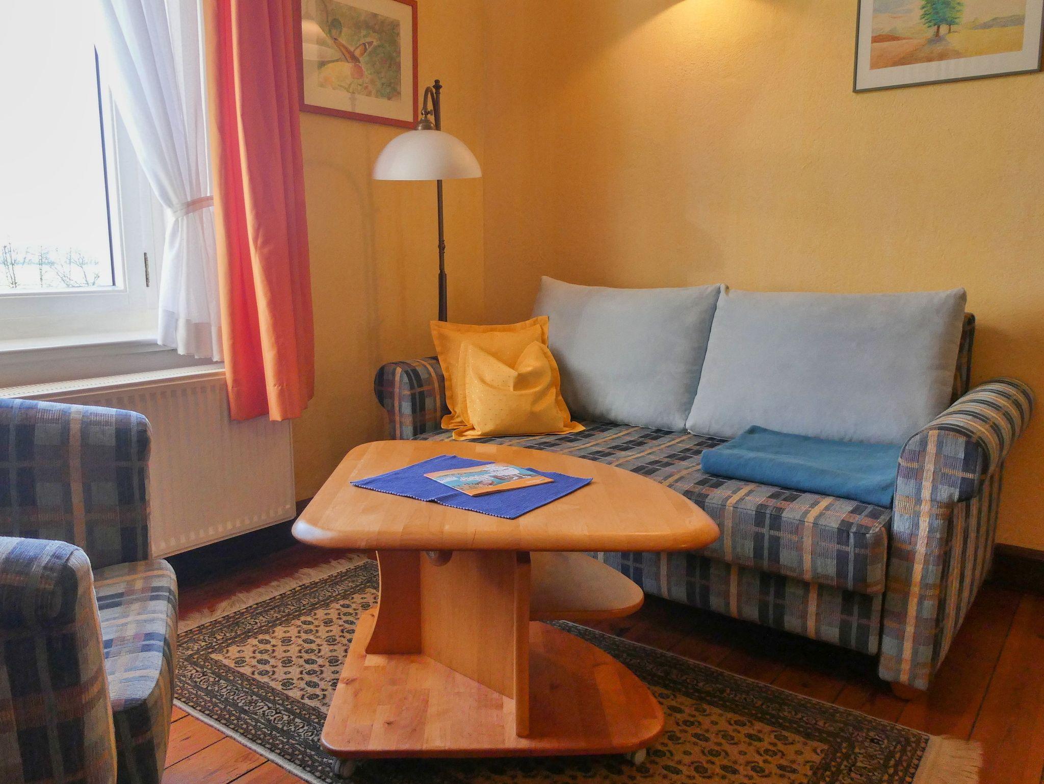 Kuschelige 2-Zimmer-Wohnung im 1. OG. Wohnzimmer mit Sitzecke, Esstisch, Pantryküche und Schlafsofa. Babybett (60 x 120cm) falls erforderlich. Geräumiges Bad mit Badewanne. Gesamt-Wohnfläche: 36 m².