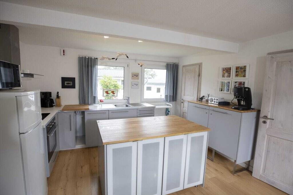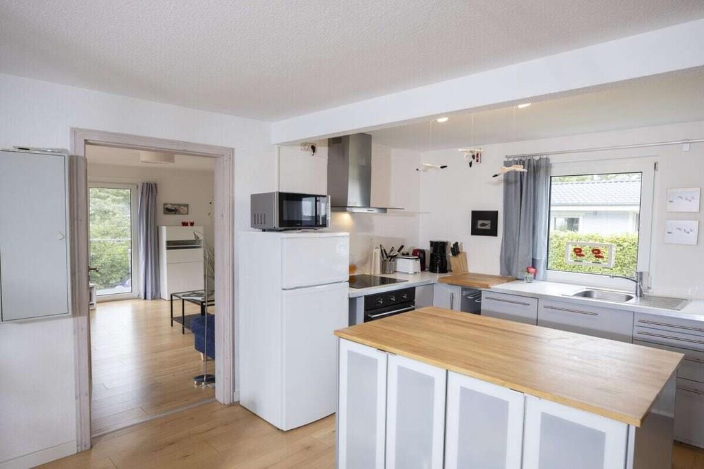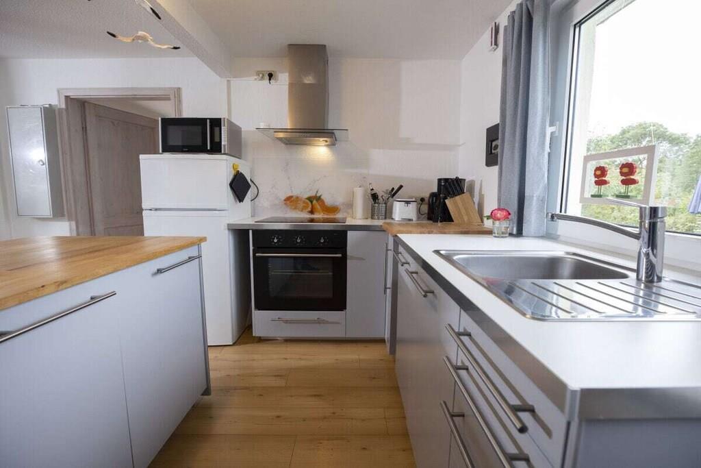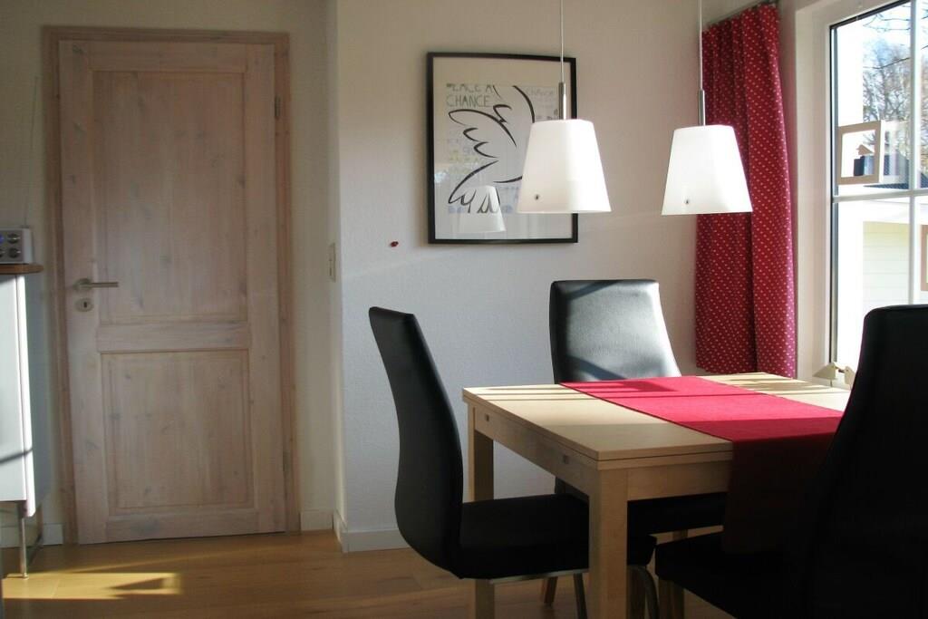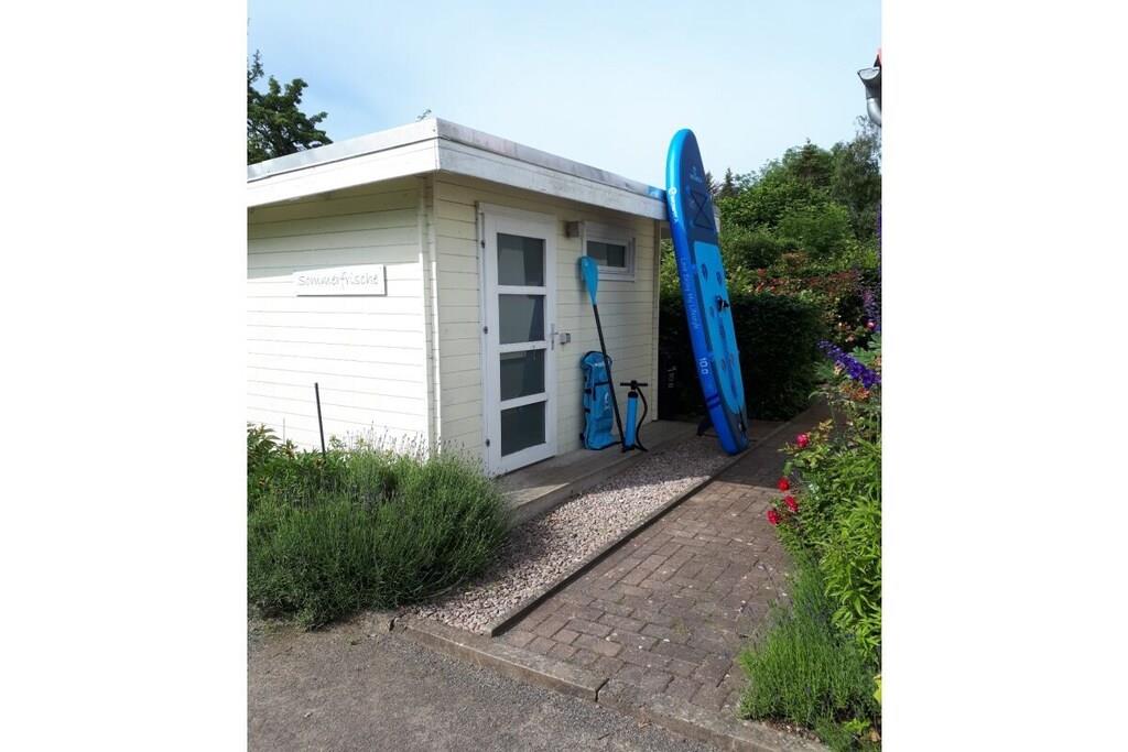 Unser Ferienbungalow "Sommerfrische" bietet Ihnen in schöner Natur, Ruhe und Erholung mit Boddenblick. Jetzt im Herbst können die Kraniche wunderbar beobachtet werden! Es handelt sich um einen ca. 50 qm großen freistehenden Bungalow, mit einer modernen Einrichtung. Von der Terrasse haben Sie einen schönen Blick auf den Bodden. Hier finden Sie mit maximal zwei Personen (plus Kind) ausreichend Platz zur freien Entfaltung. Das Ferienhaus verfügt über ein Schlafzimmer mit Doppelbett (180 cm x 200 cm), Duschbad und Küche (komplett eingerichtet mit Spülmaschine). Von der Küche abgetrennt ist ein offener Essplatz und davon geht ein Wohnzimmer mit Zugang zur Terrasse ab. Das Schlafsofa ist zur Übernachtung von einem Kind geeignet. Die Espressomaschine macht leckeren Kaffee! Elektroheizkörper erwärmen das Haus bei jeder(!) Witterung. Mit unserem Stand-up-Paddleboard können Sie den Bodden erkunden. Wir freuen uns auf ihren Besuch!