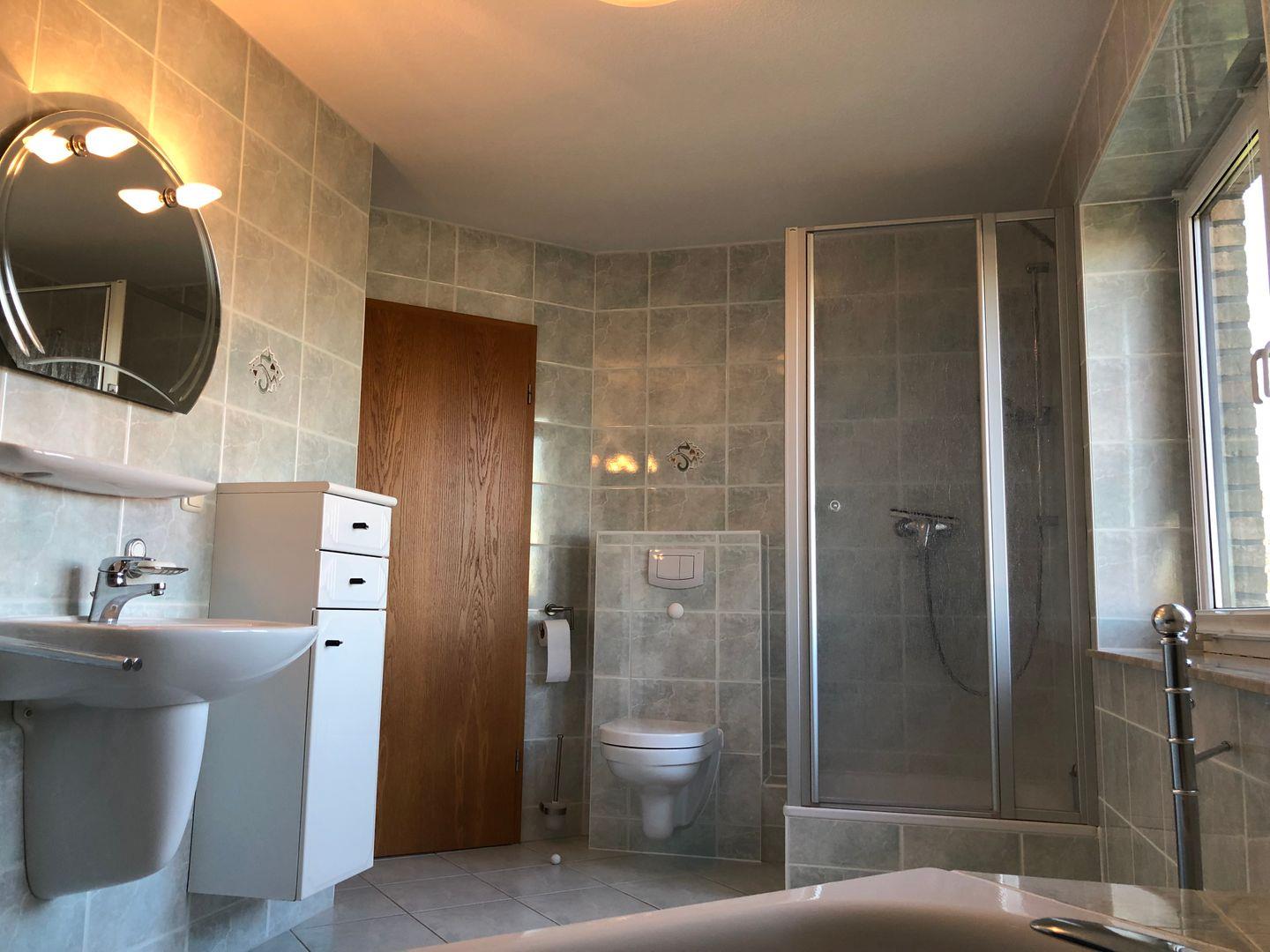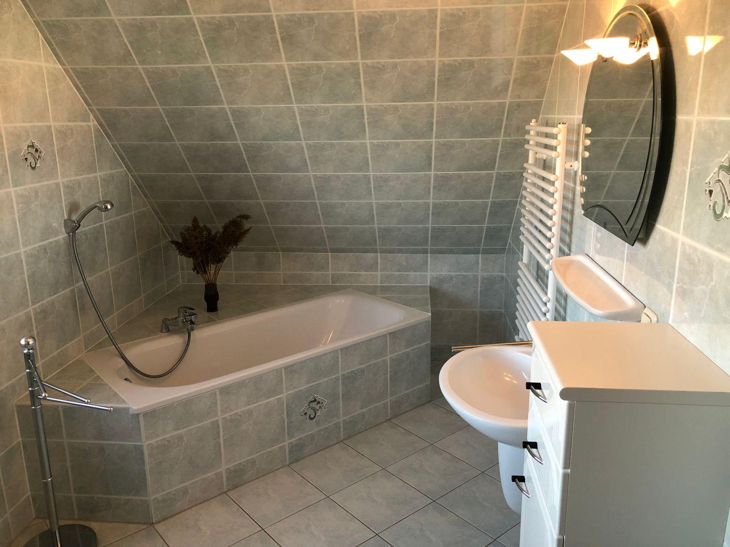 Das geräumige Tageslichtbad mit Badewanne und Dusche sorgt für Komfort, zusätzlich steht Ihnen eine Waschmaschine zur Verfügung – besonders praktisch für längere Aufenthalte.