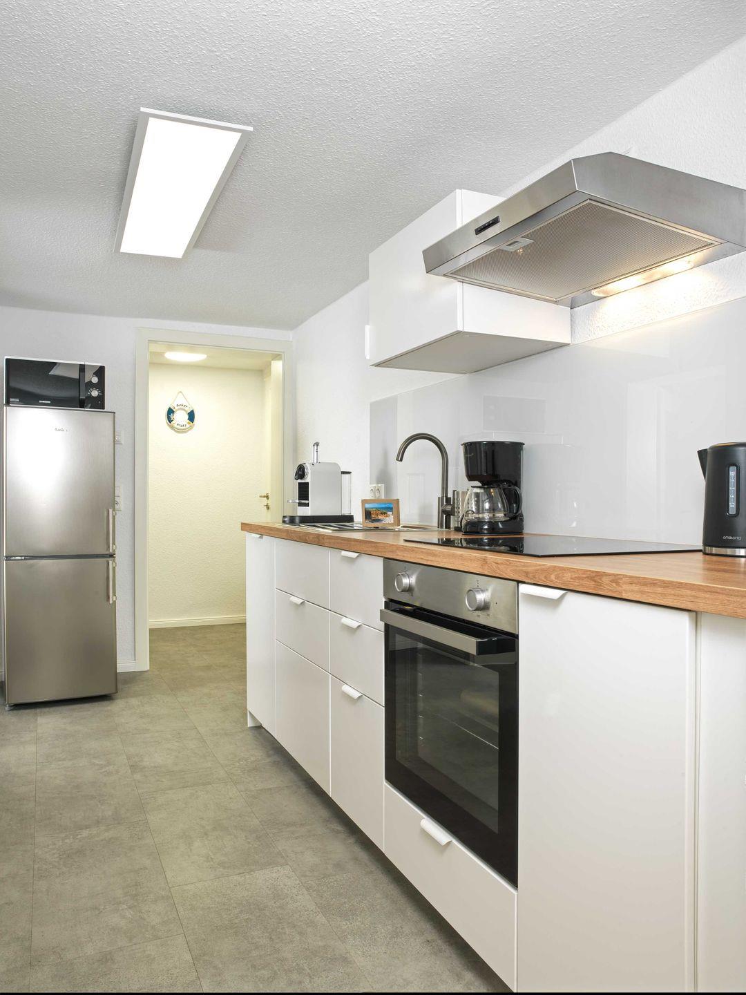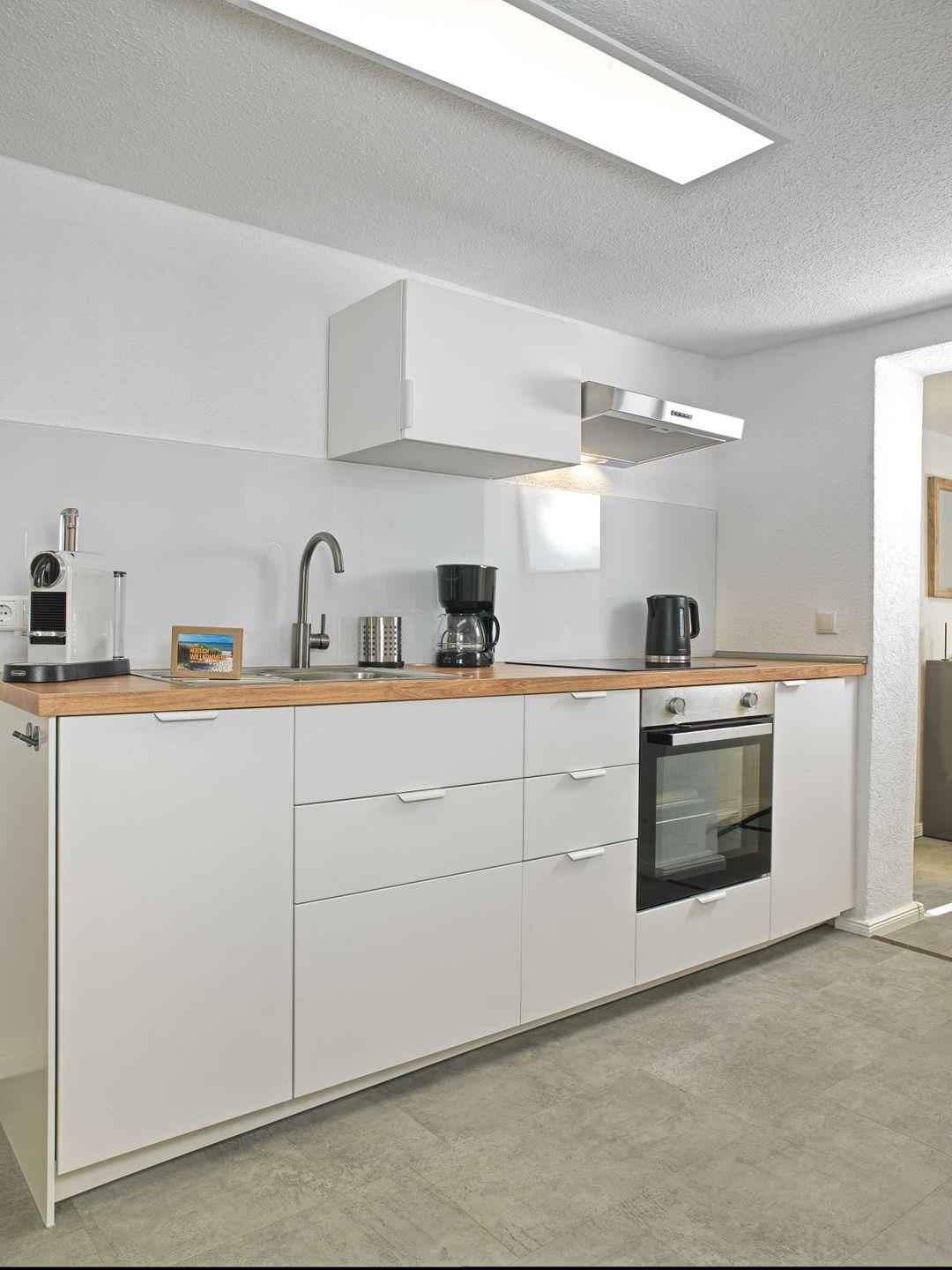Das Wohnzimmer ist mit einem gemütliche Sofa und großen Flat TV ausgestattet. Vom Wohnzimmer und Schlafzimmer aus gelangen Sie auf die Terrasse. Die Küchenzeile ist umfassend ausgestattet: Ein Induktions-Herd mit Backofen, Mikrowelle und Geschirrspüler, Kühlschrank mit extra Gefrierschrank, Kaffeemaschine sowie eine Espressomaschine. Das Badezimmer ist mit einer bodengleichen Dusche ausgestattet, ein Waschbecken mit Spiegelschrank sowie ein WC. Im Schlafzimmer finden Sie ein bequemes Bett für einen erholsamen Schlaf.