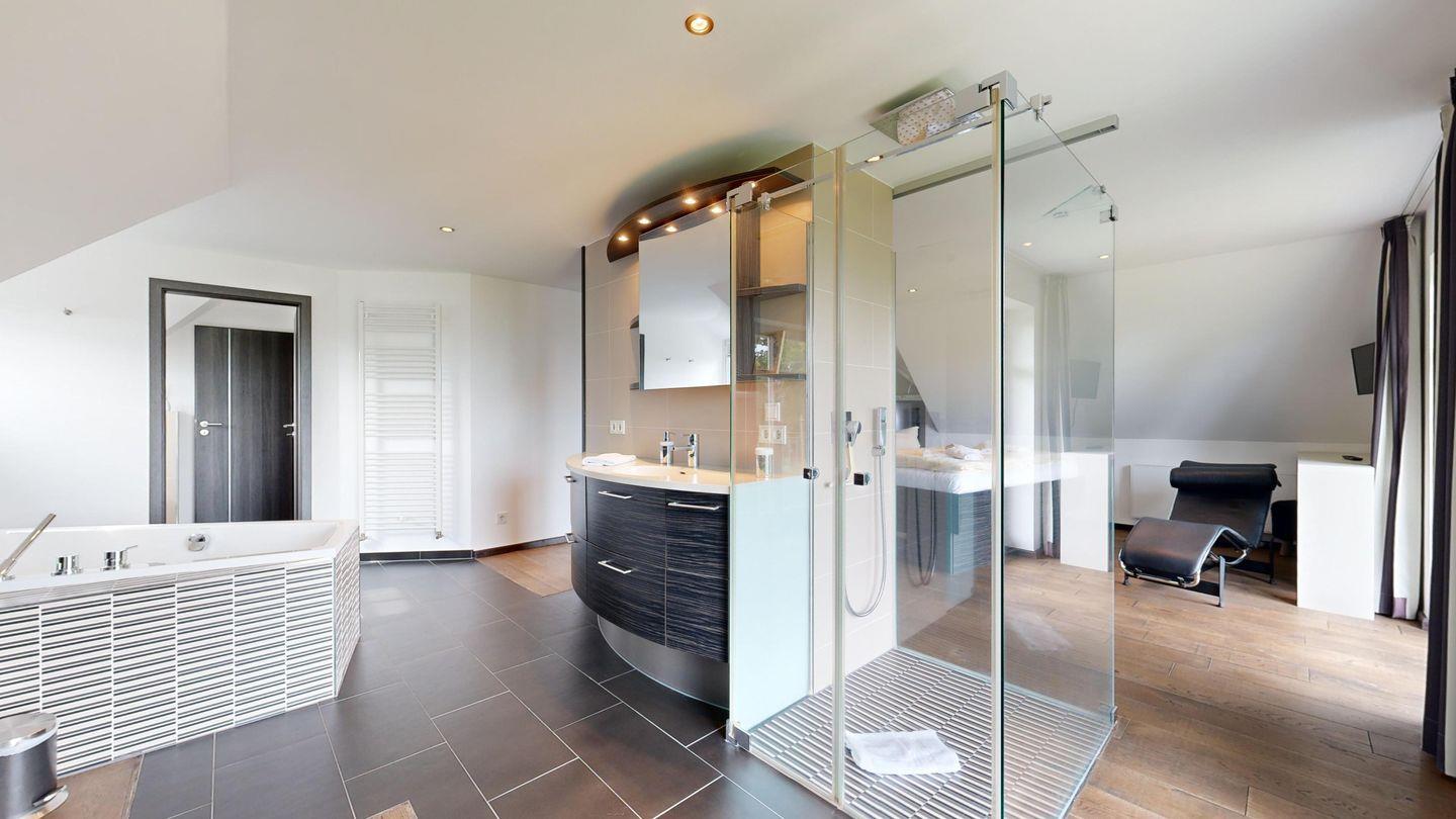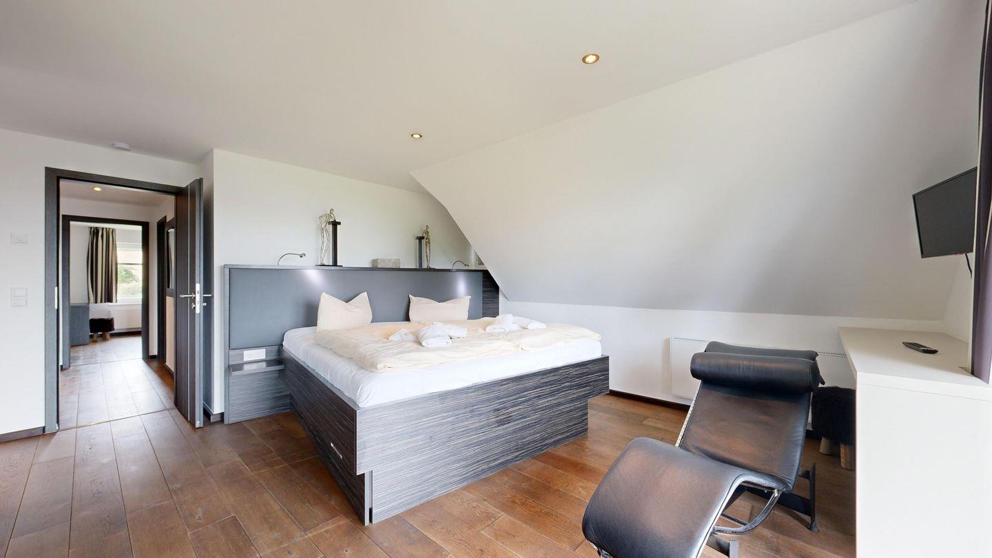 * 1 großes Schlafzimmer (32 m²) mit einem Doppelbett und Meerblick, Sat-TV, integrierte Badewanne, Dusche