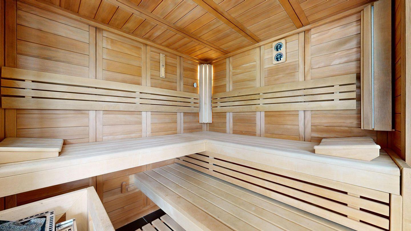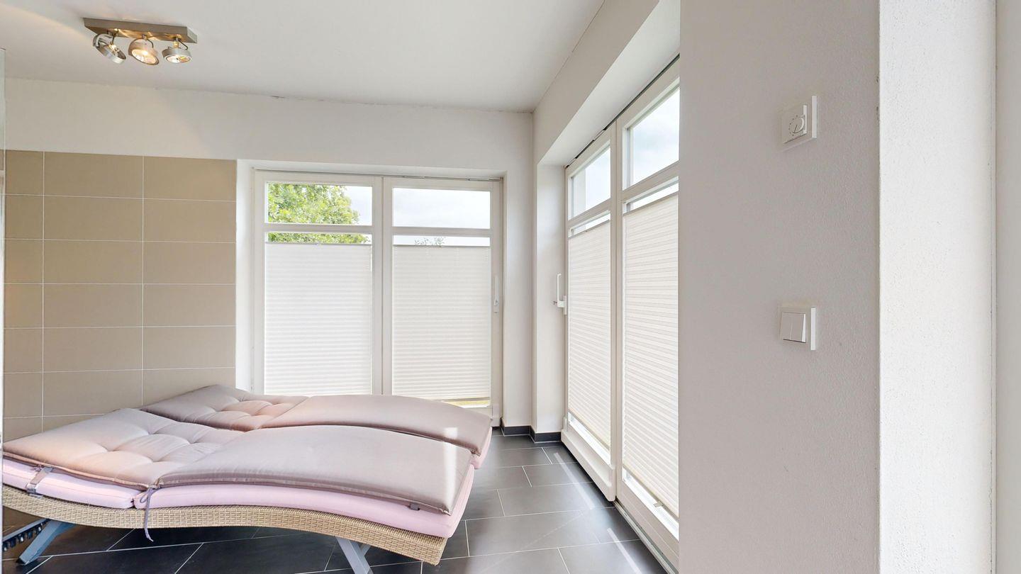 * Nebengebäude mit Saunabereich (ca. 20 m²), Duschen und Liegen, Fahrradabstellraum