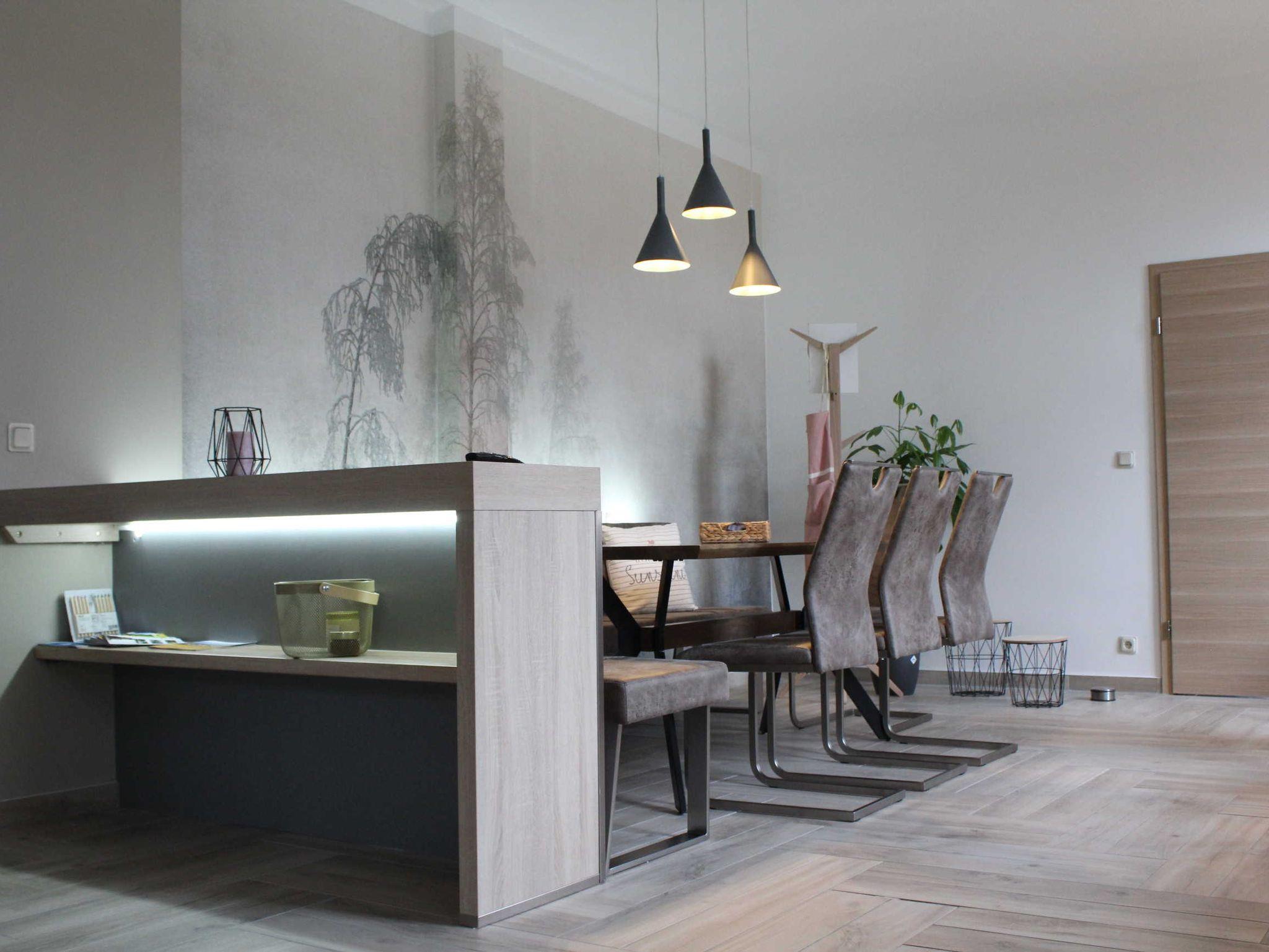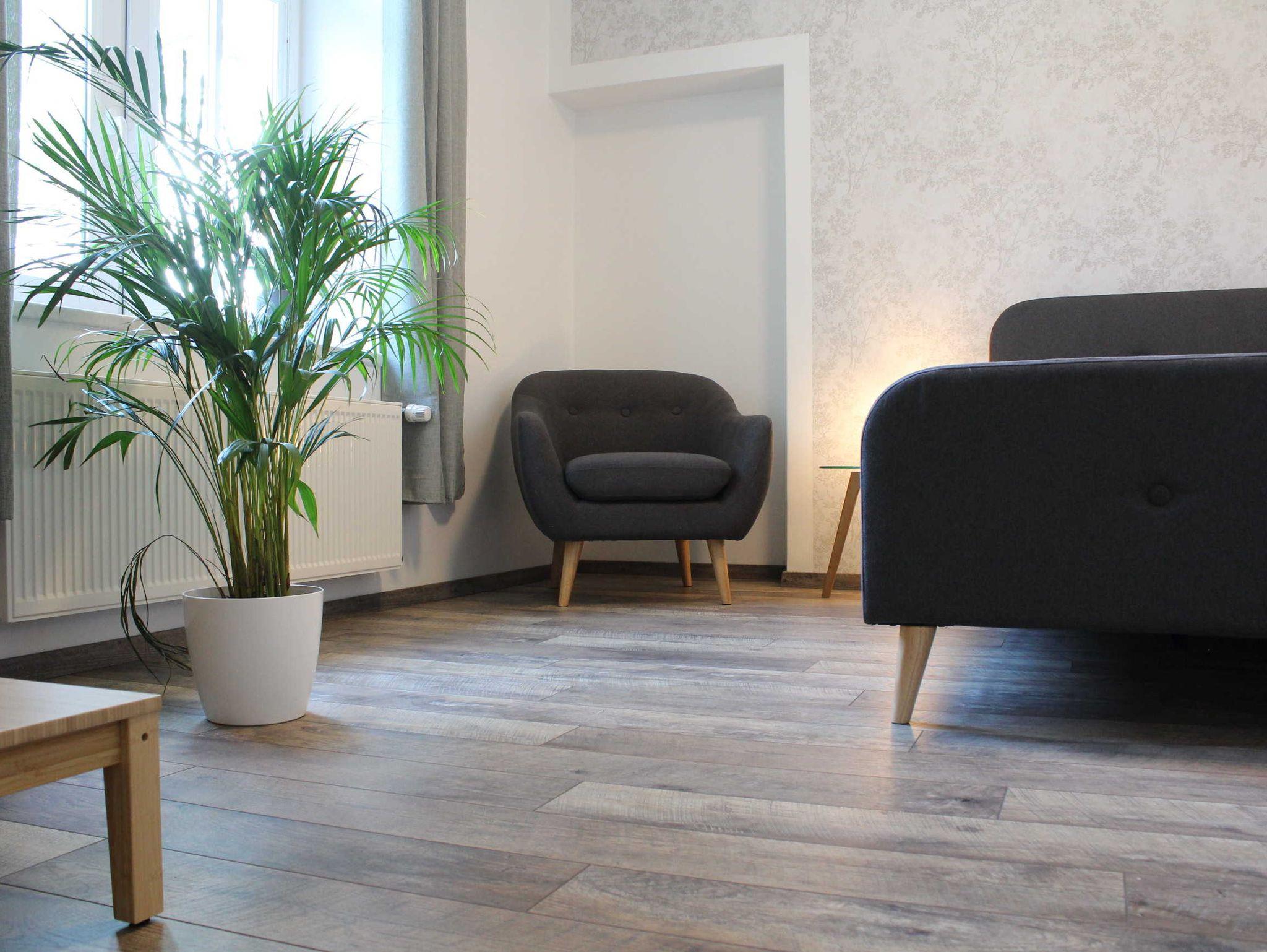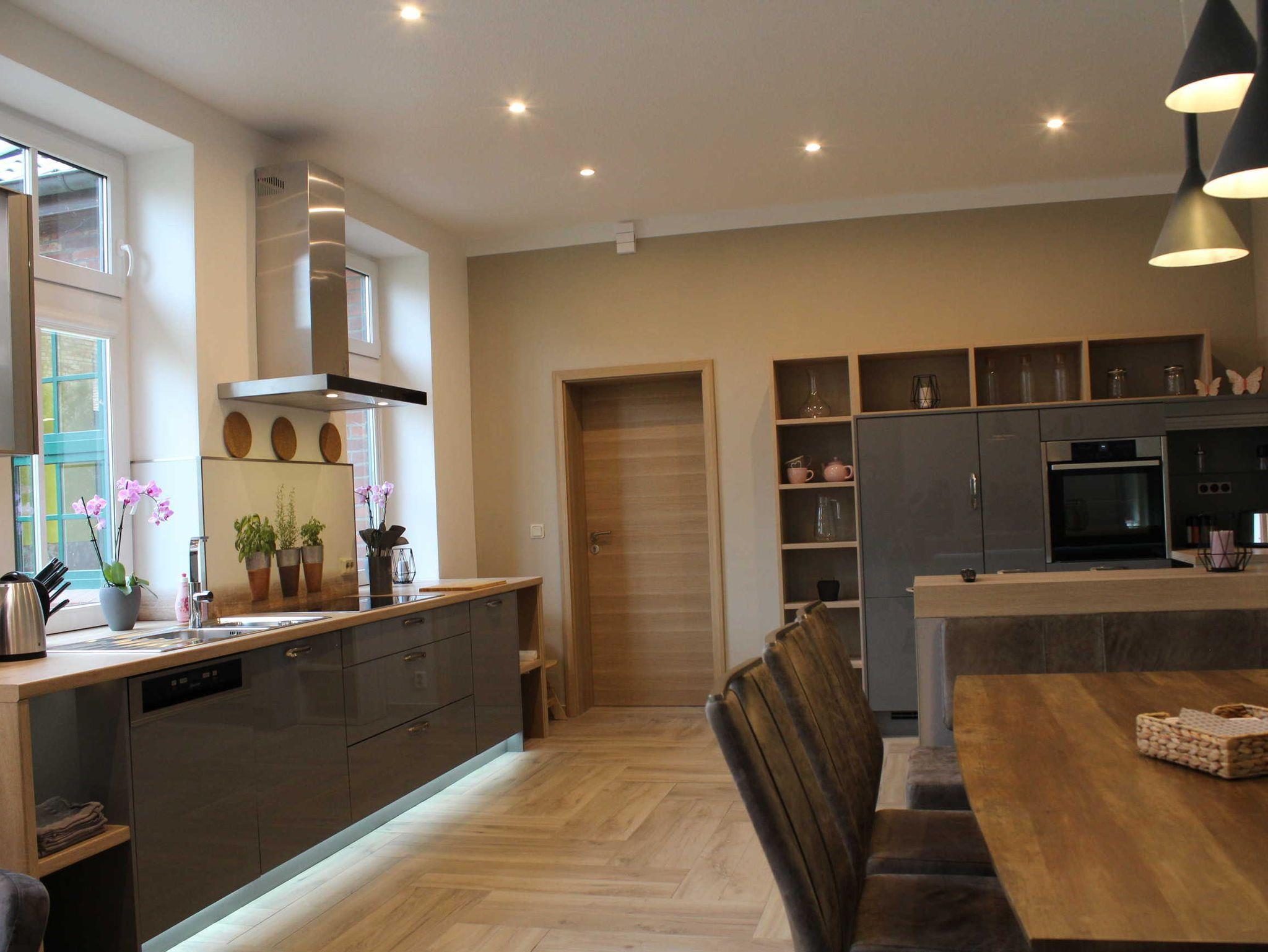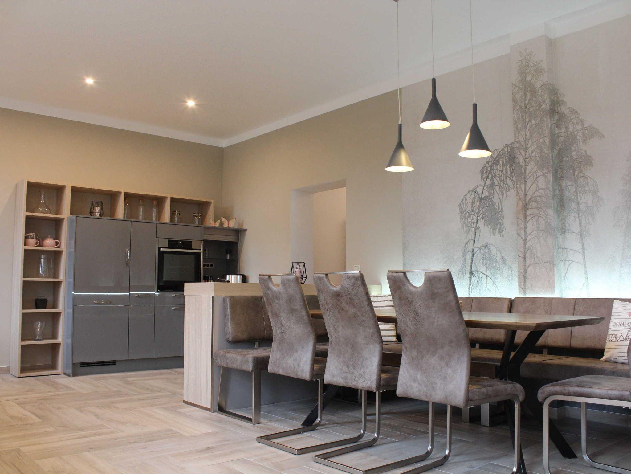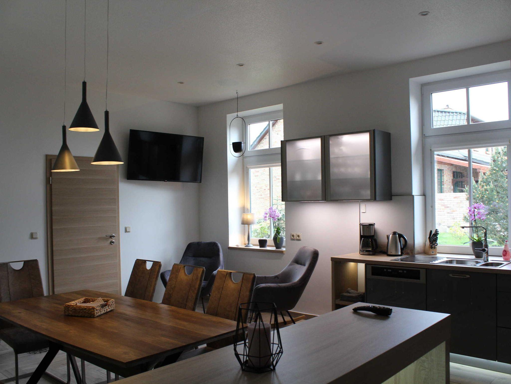 Die geräumige Erdgeschosswohnung - größtenteils mit Fußbodenheizung und hochwertigen Fliesen ausgestattet - wurde 2020 komplett modernisiert. Vom Herzstück der Ferienwohnung, der großzügigen Wohnküche mit Flat-TV gelangen Sie in die drei stilvoll eingerichteten Schlafzimmer, jeweils mit Doppelbett und einer Schlafcouch ausgestattet. In jedem der Schlafräume besteht daher die Möglichkeit zur Aufbettung für eine Person. Von den drei Schlafräumen sind zwei durch eine Durchgangstür verbunden. Bei Nutzung aller Schlafräume ist daher einer ein Durchgangszimmer.