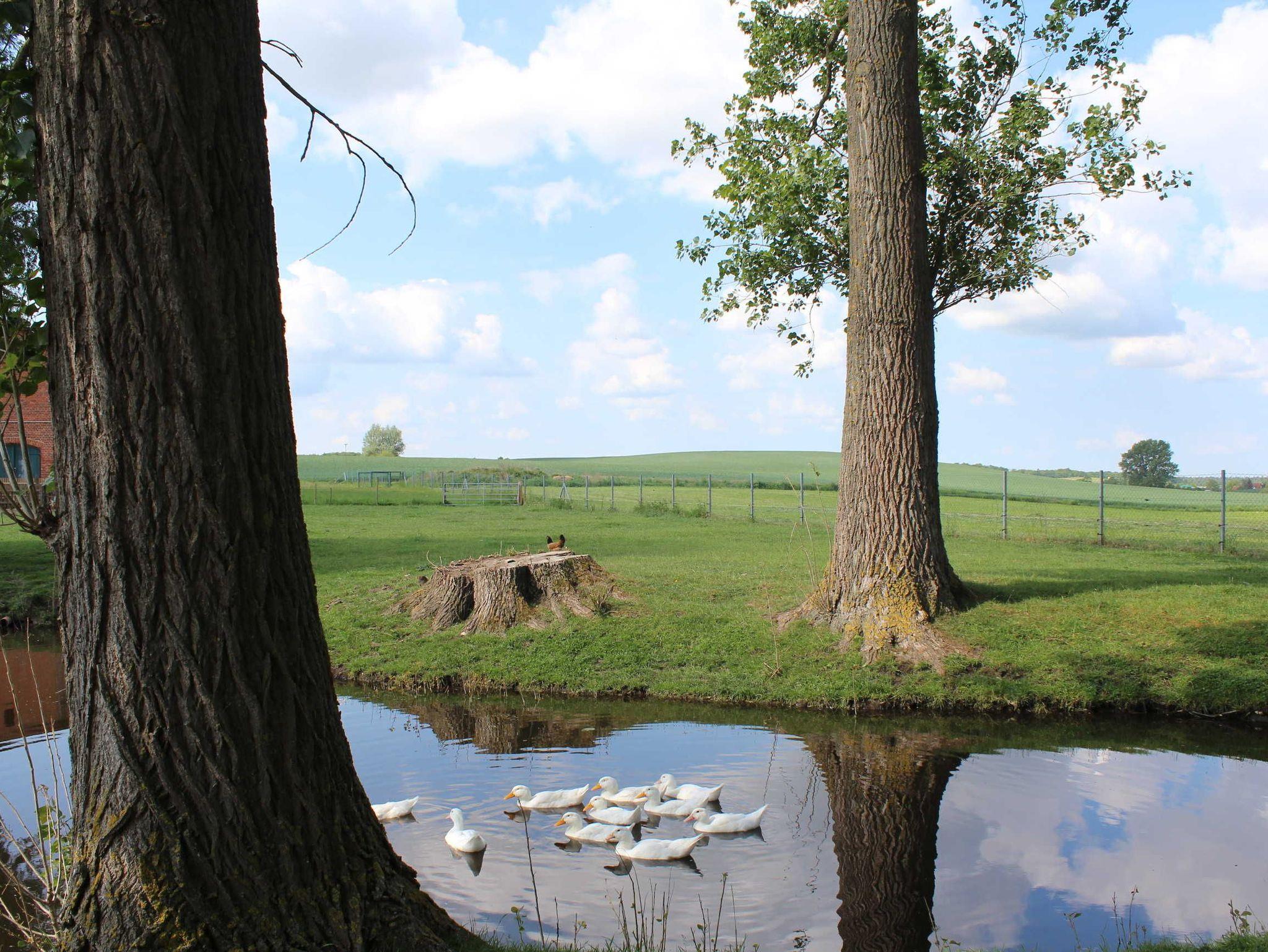 Von der gemütlichen Terrasse gelangen Sie in den gepflegten Garten mit alten Obstgehölzen, und hofeigenem naturbelassenen Teich. Dieser lädt zum Verweilen und Entspannen in Mitten der Natur ein.