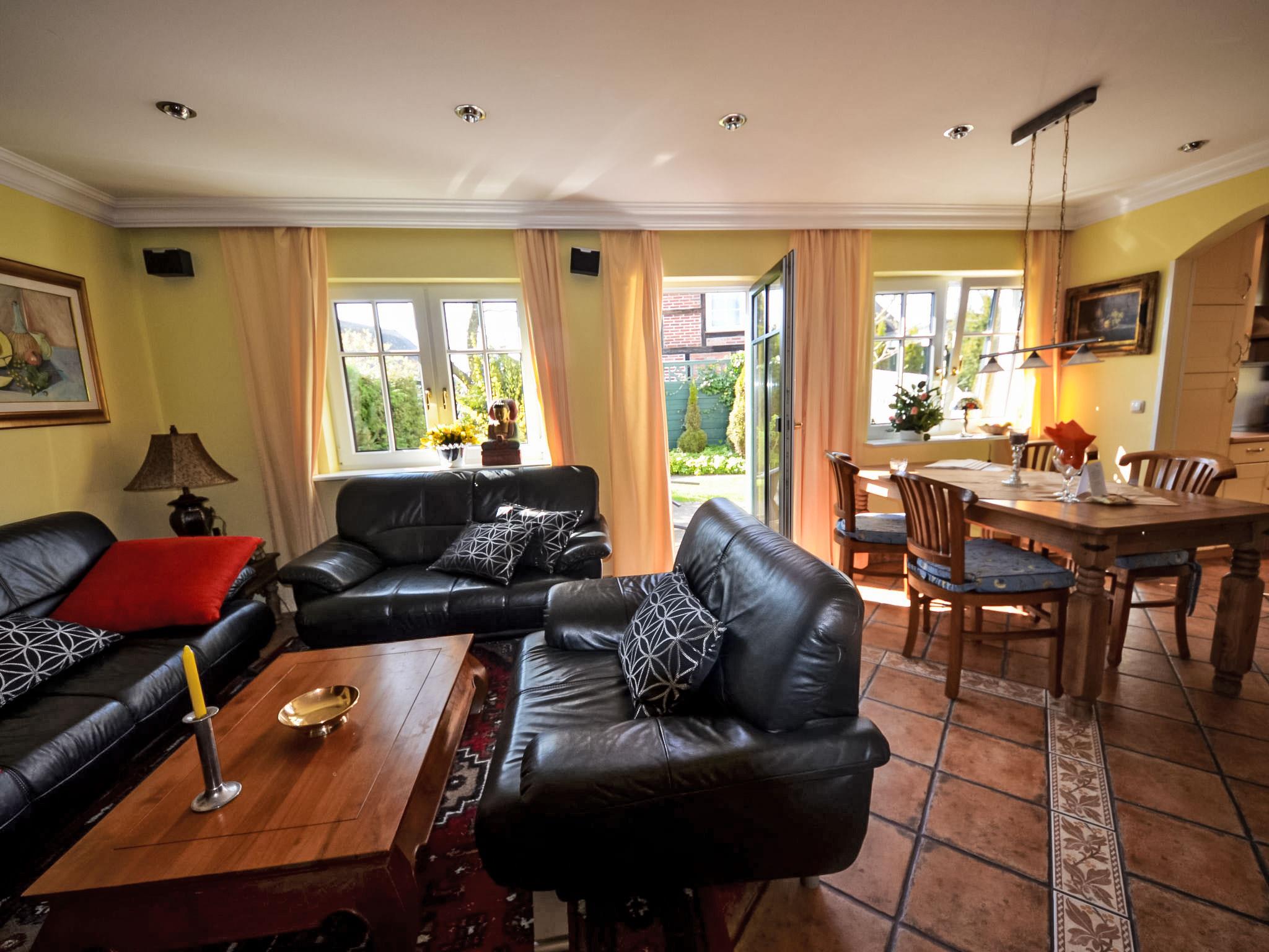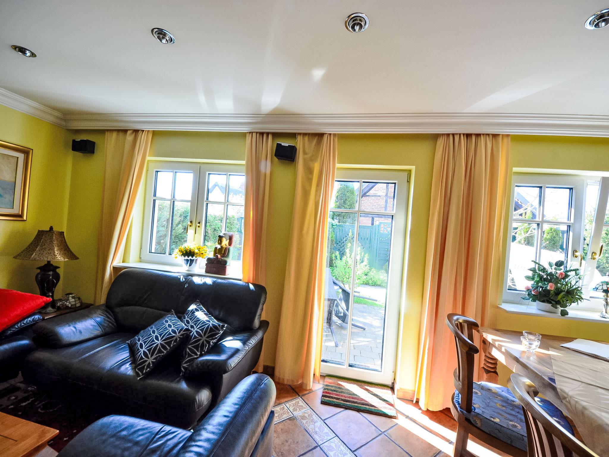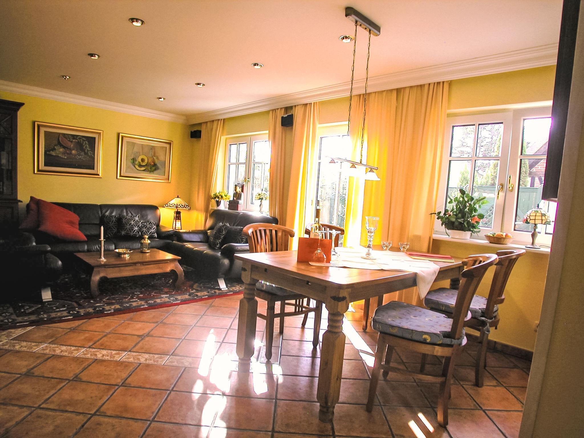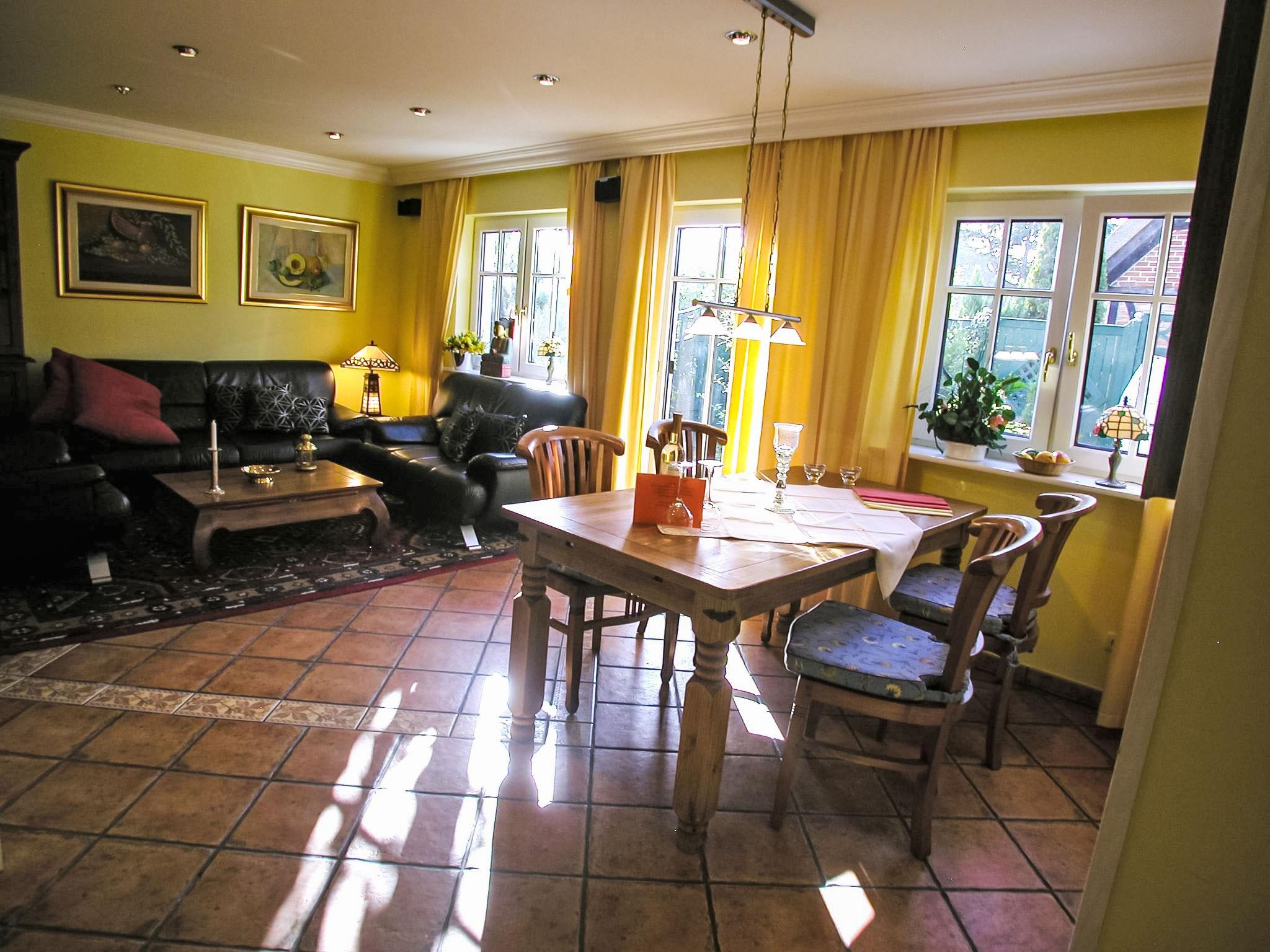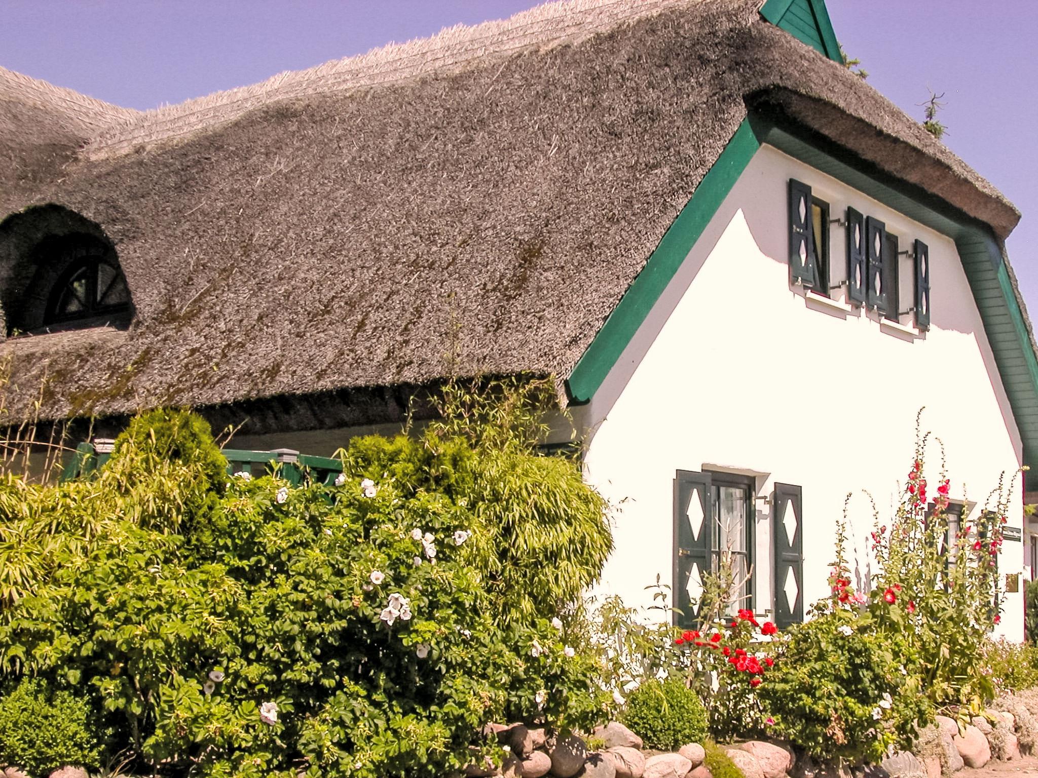 Reihenhaus. Im Ort, 700 m vom Meer, 2 km vom Strand. Im Hause: Zentralheizung. Parkplatz beim Haus. Lebensmittelgeschäft, Restaurant 200 m, Bushaltestelle 600 m, Bahnstation 20 km, Sandstrand 2 km, Freibad 13 km, Hallenbad 13 km, Badebucht 2 km. Golfplatz (18 Loch) 30 km, Reitstall 5 km. Die drei reetgedeckten Reihenhäuser und das dahinter liegende Doppelhaus (DE9098.120.1 und DE9098.120.2) sind hochwertig ausgestattet und die Inneneinrichtung ist bis ins Detail abgestimmt. Jedes Reihenhaus verfügt über einen mindestens 109 cm grossen TV-Bildschirm im Wohn-/Esszimmer.