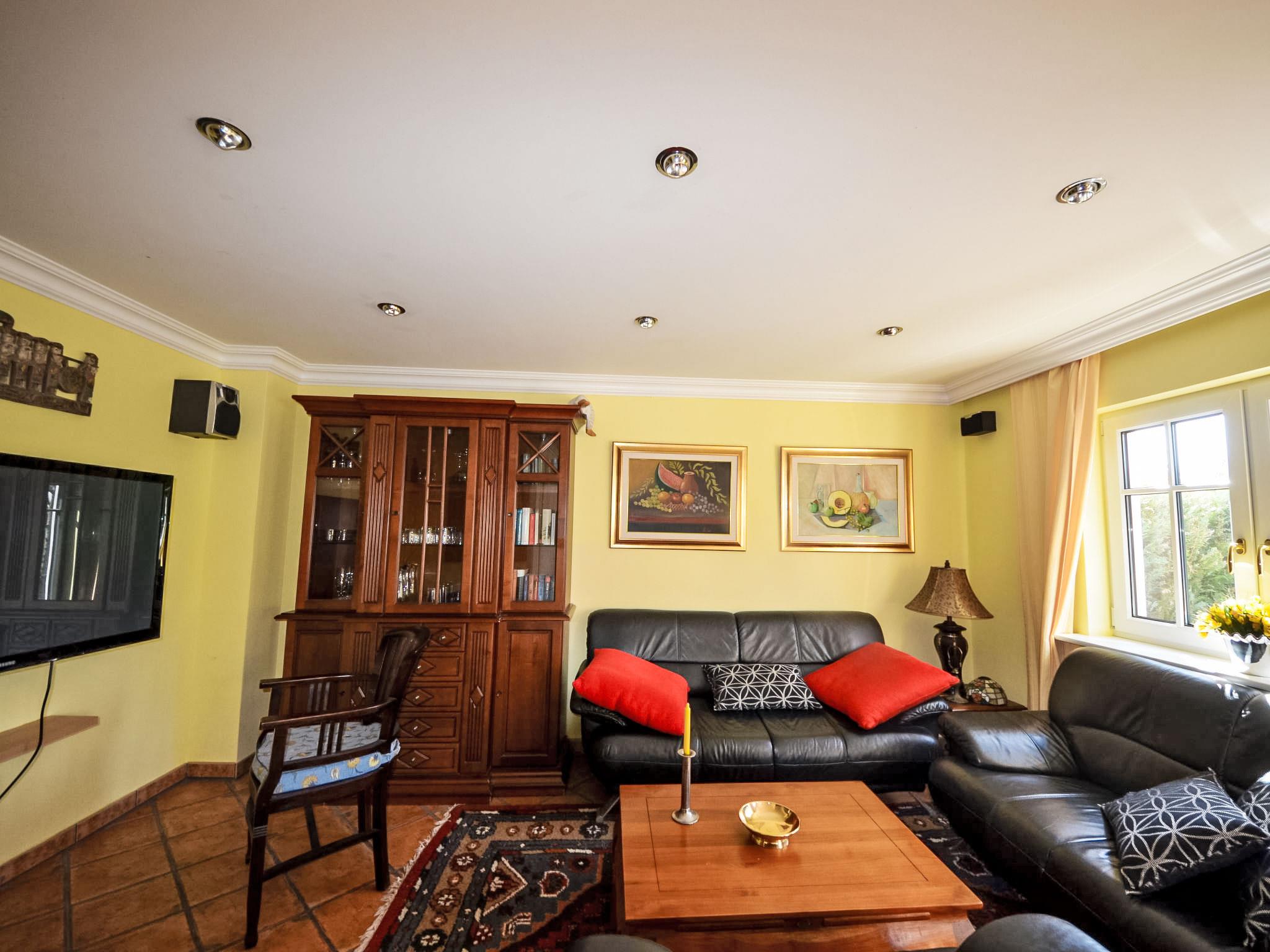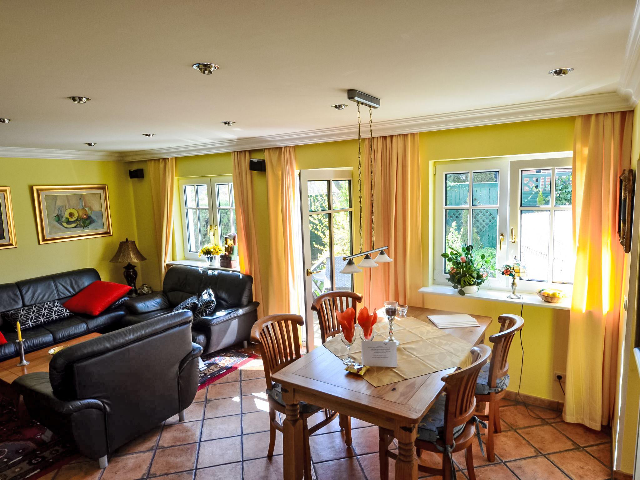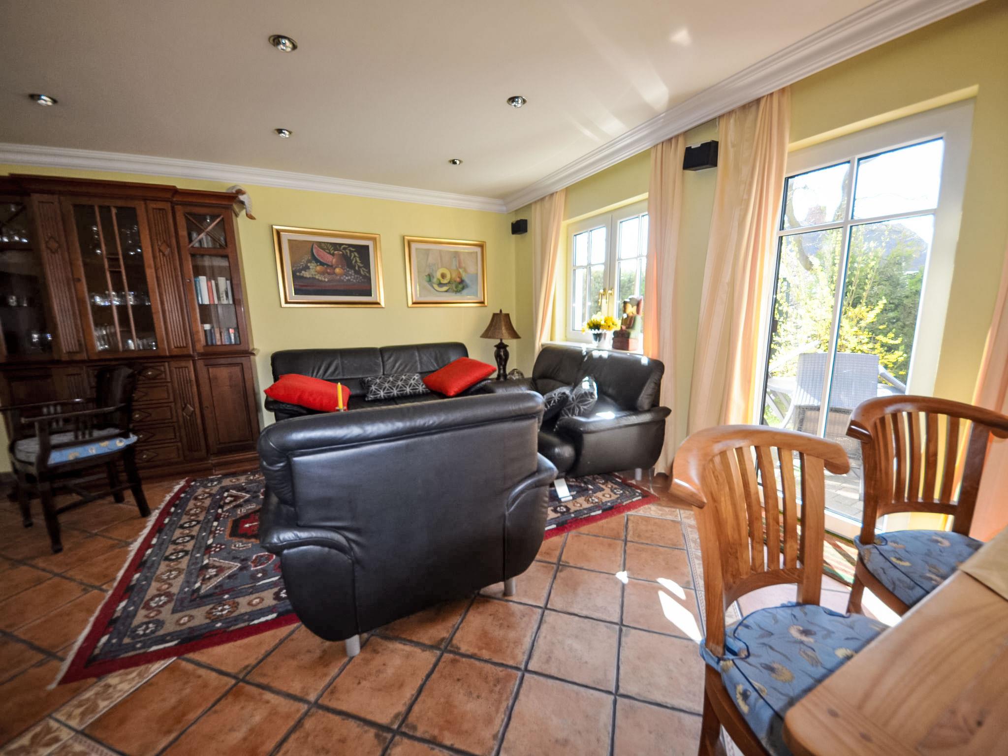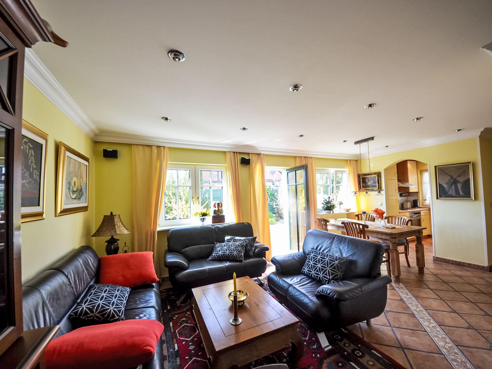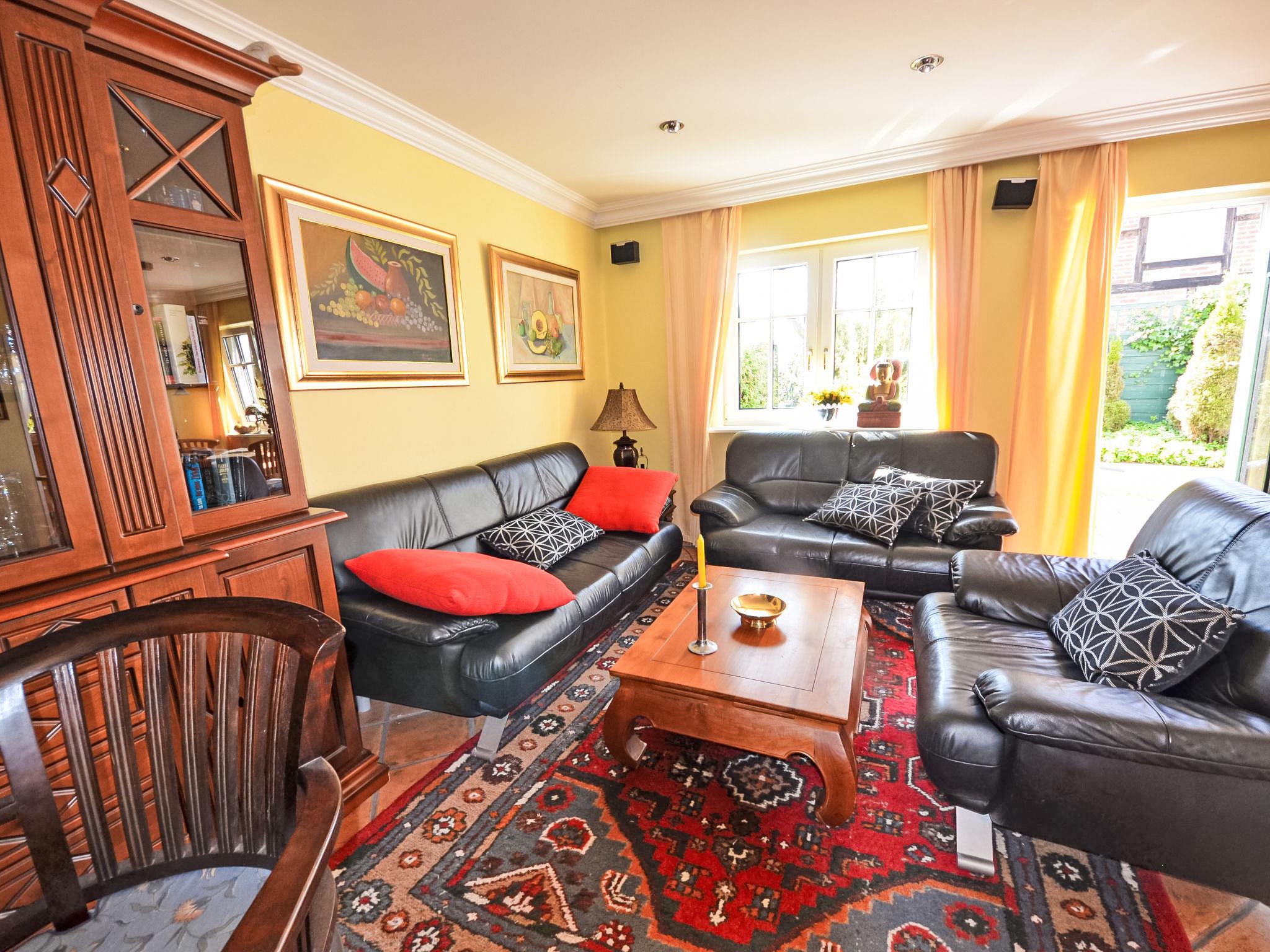 Reihenhaus. Im Ort, 700 m vom Meer, 2 km vom Strand. Im Hause: Zentralheizung. Parkplatz beim Haus. Lebensmittelgeschäft, Restaurant 200 m, Bushaltestelle 600 m, Bahnstation 20 km, Sandstrand 2 km, Freibad 13 km, Hallenbad 13 km, Badebucht 2 km. Golfplatz (18 Loch) 30 km, Reitstall 5 km. Die drei reetgedeckten Reihenhäuser und das dahinter liegende Doppelhaus (DE9098.120.1 und DE9098.120.2) sind hochwertig ausgestattet und die Inneneinrichtung ist bis ins Detail abgestimmt. Jedes Reihenhaus verfügt über einen mindestens 109 cm grossen TV-Bildschirm im Wohn-/Esszimmer.