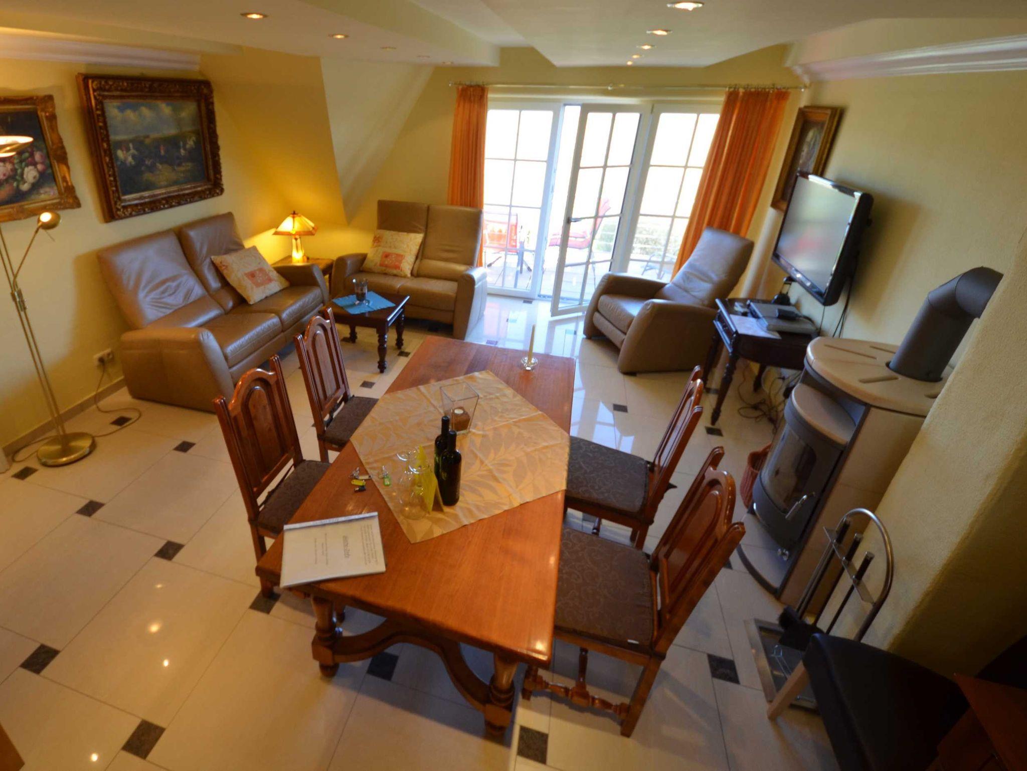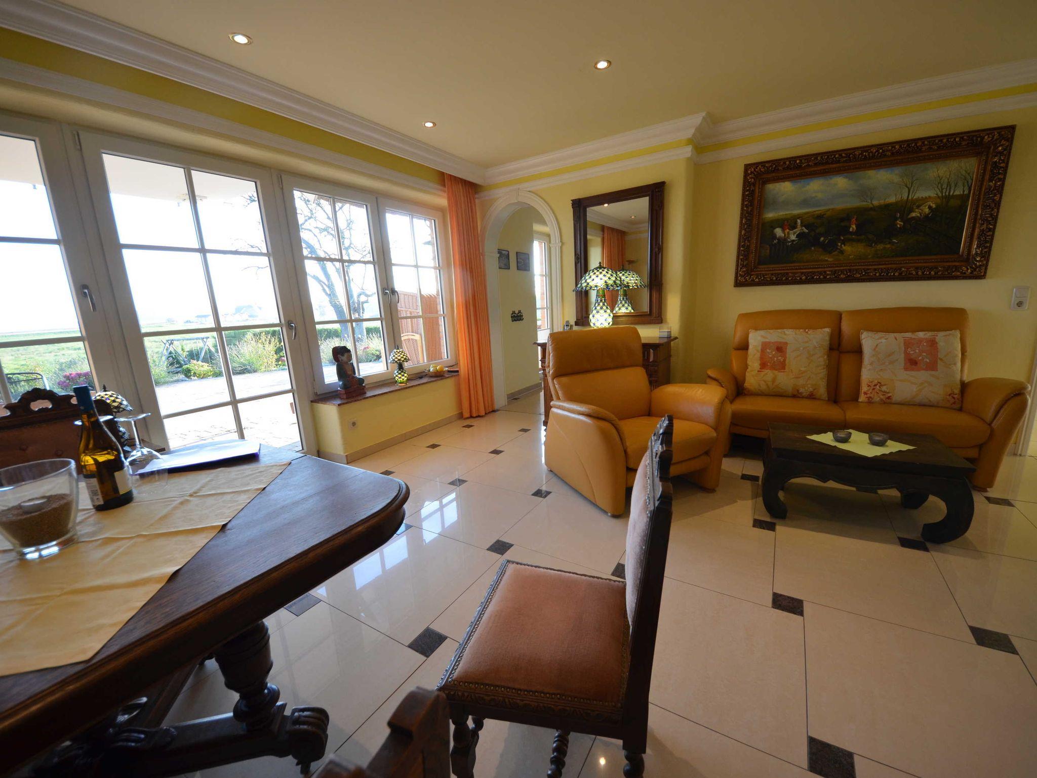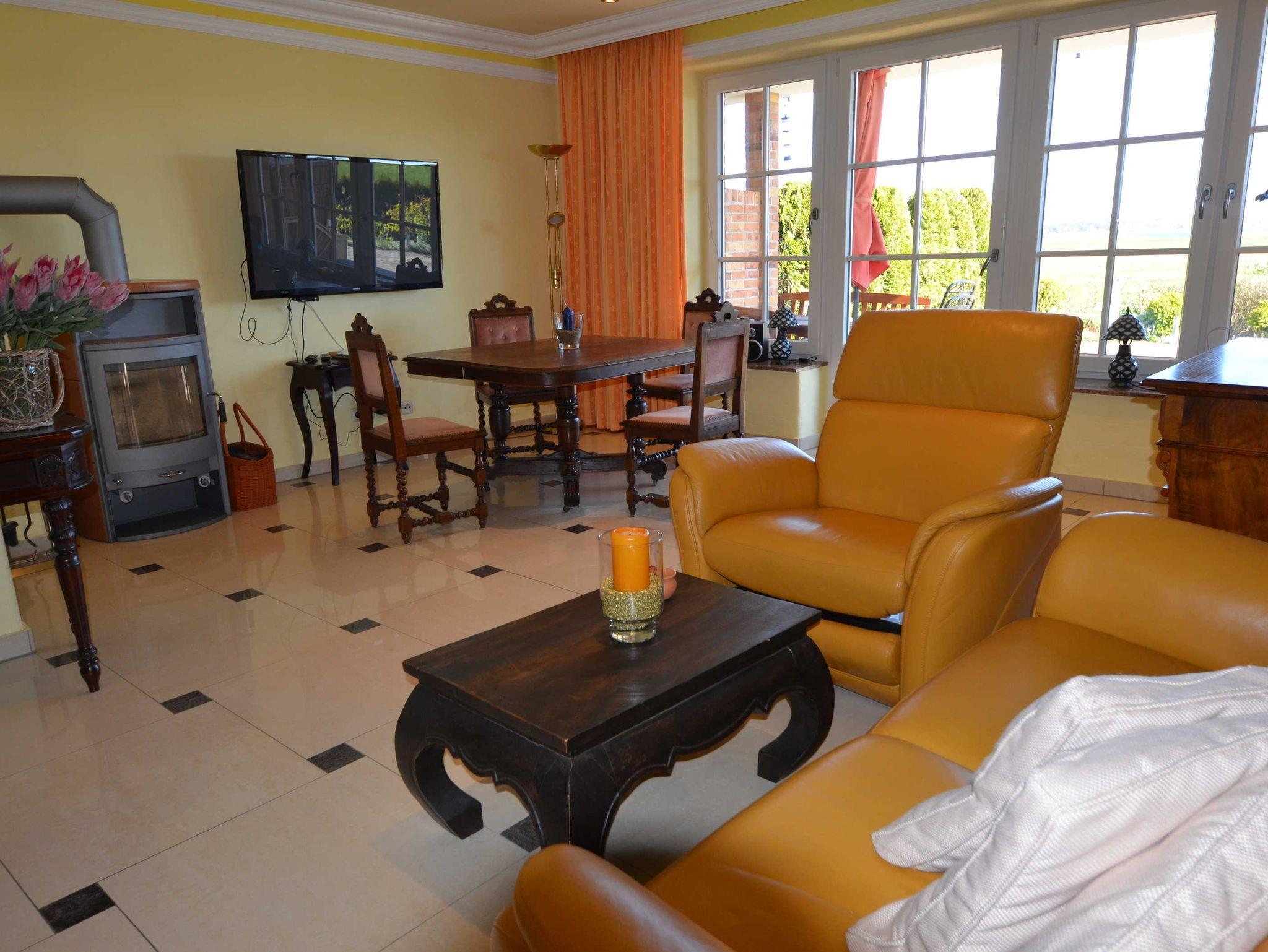 Großzügiges Wohn-/Esszimmer mit Ausgang zur großen 80 m² Terrasse. Schöne Ledergarnitur mit Opiumtisch, große Fensterfronten mit direktem Blick auf die Ostsee, den kleinen Hafen von Groß Zicker und die gegenüber der Bucht liegenden Orte Thiessow und Klein Zicker. Antiker Esstisch mit vier Stühlen, großer Hark-Kaminofen, Gläserschrank, antike Vitrine, kleine Bücherauswahl, Plasma-TV 50 mit 125 cm Großbild, Fußbodenheizung, DVD-Recorder, Stereoanlage, CD-Player, Kinderhochstuhl, Wände dekoriert mit Spiegeln und Gemälden, sehr ansprechende Beleuchtung.