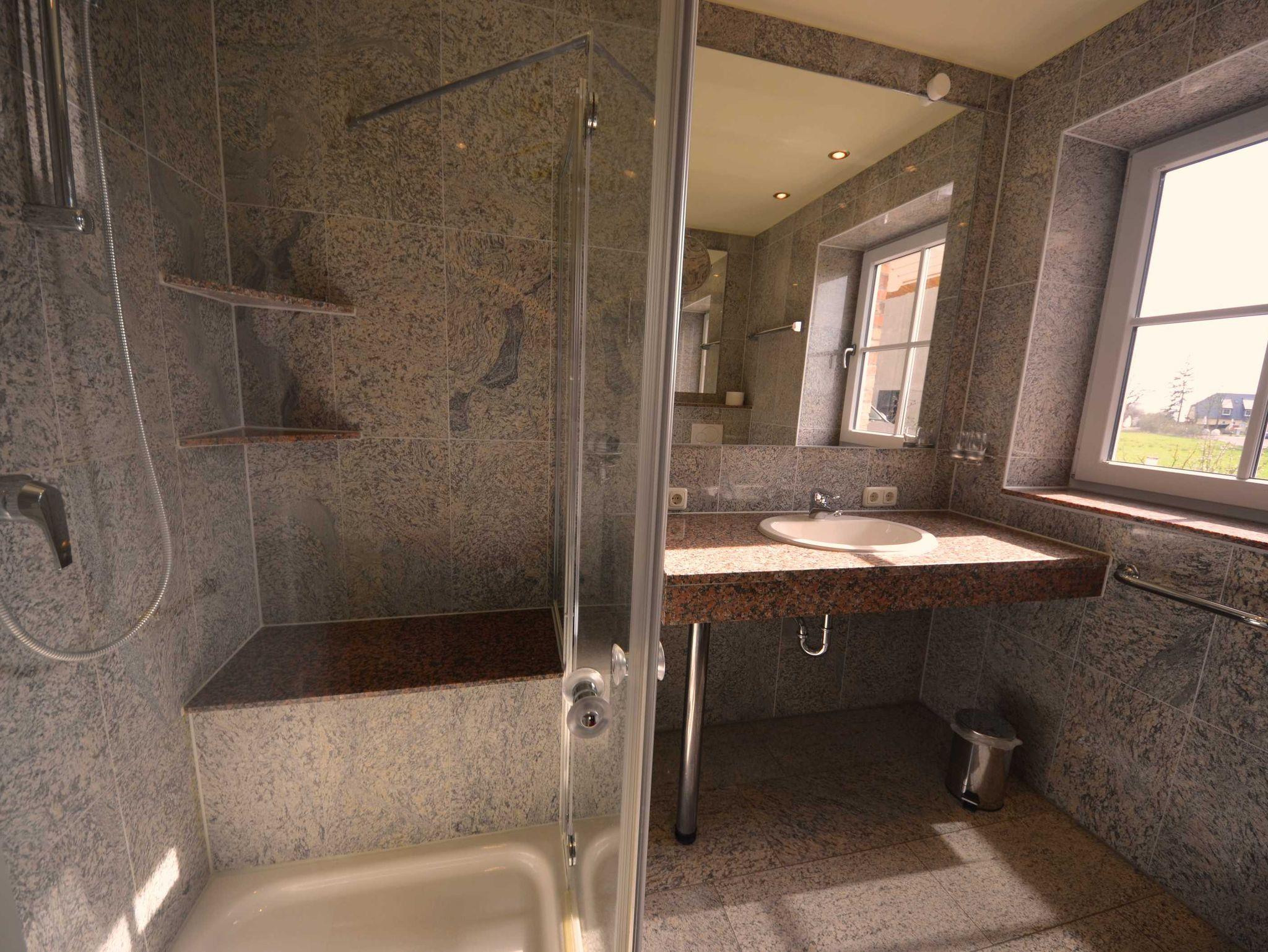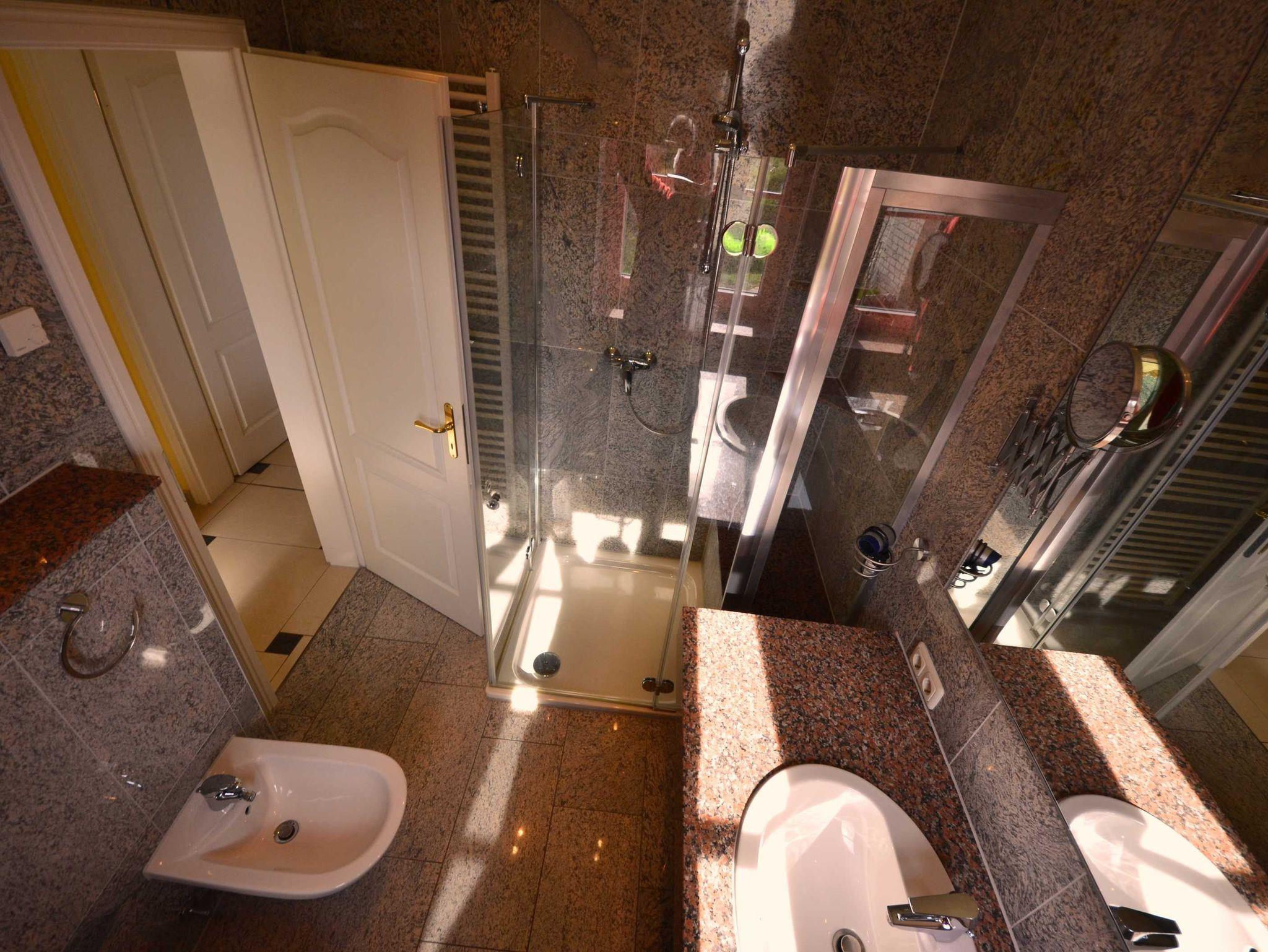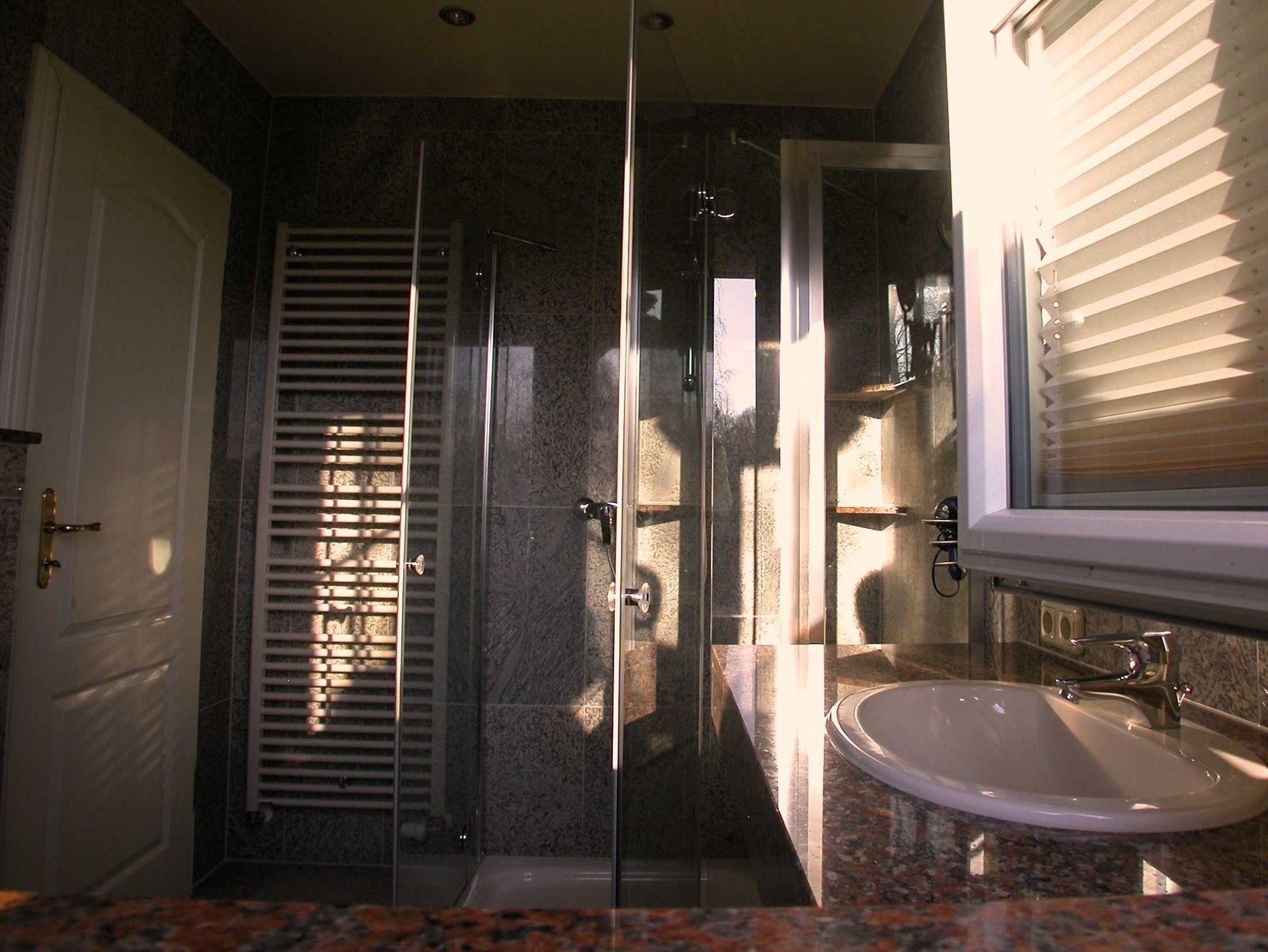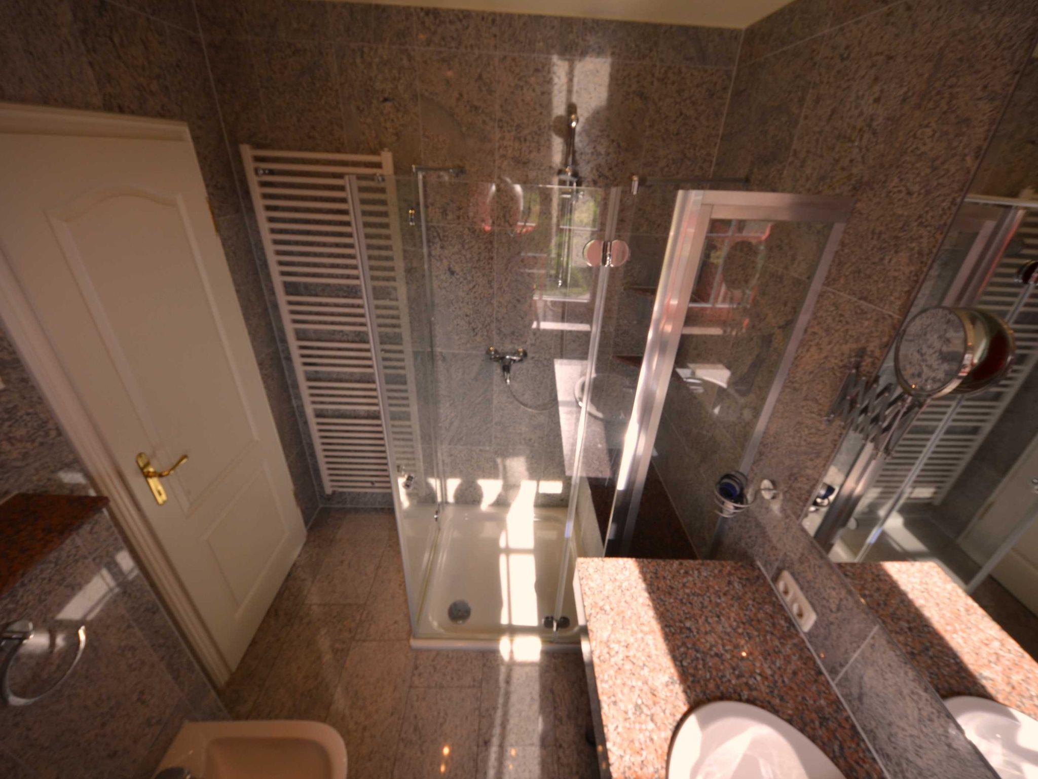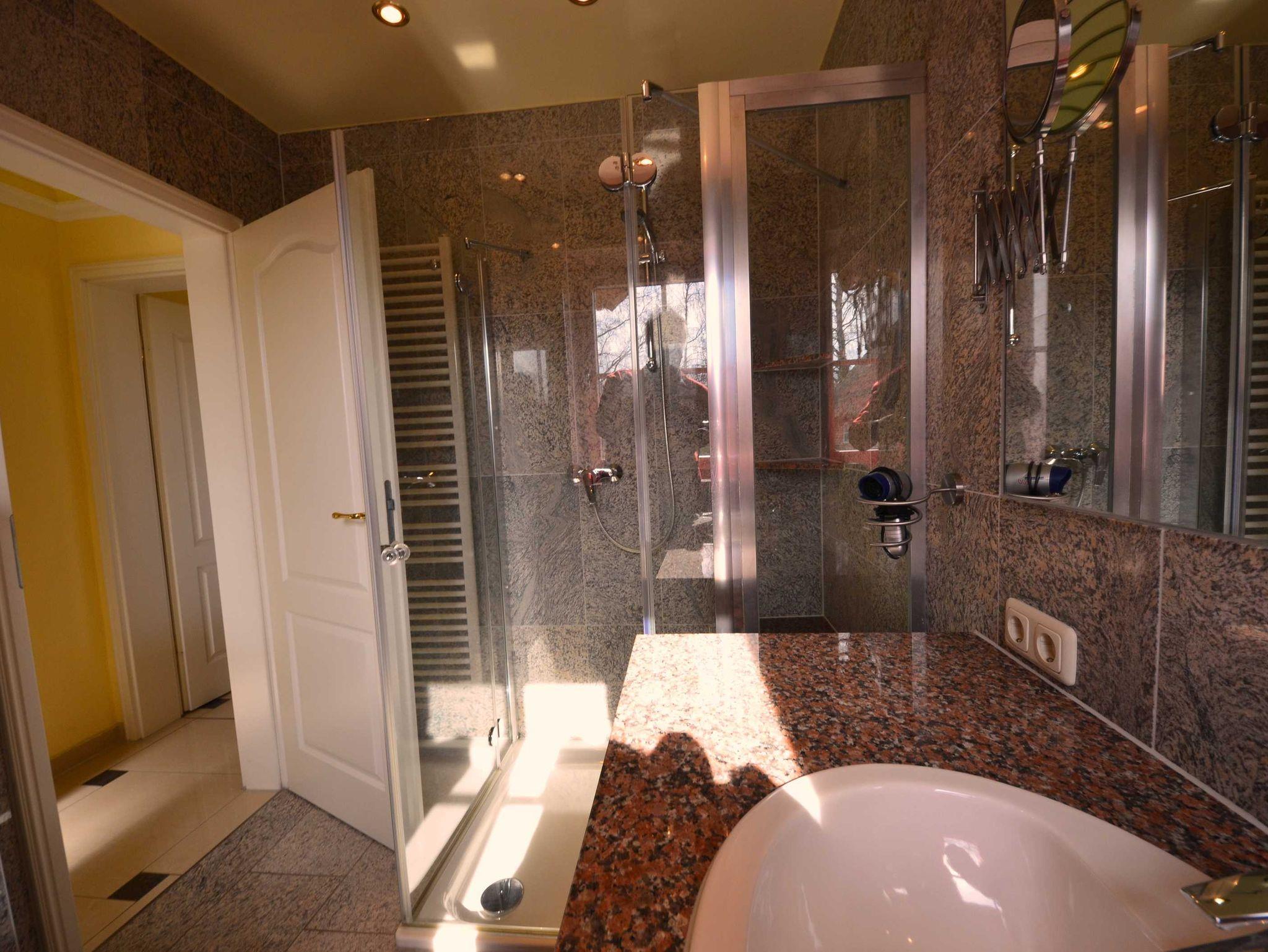 Glas-Dusche mit Sitzbank aus Granit, Fußbodenheizung, Granitabdeckungen, große Spiegel, schöne Sanitärausstattung: Toilette und Bidet, Einbau-Waschbecken mit Granitabdeckungen, beheizbarer Handtuchhalter, Fön, Schminkspiegel.
