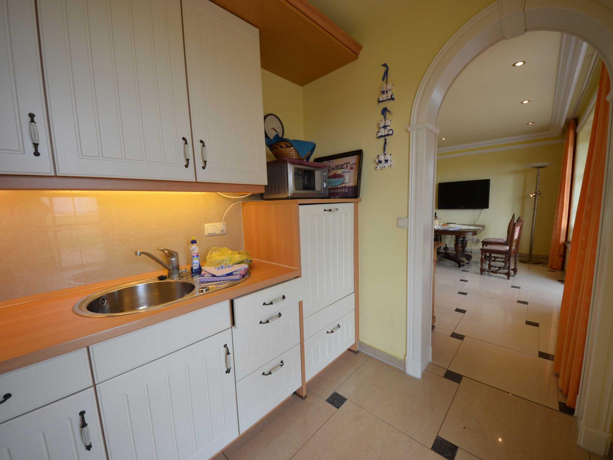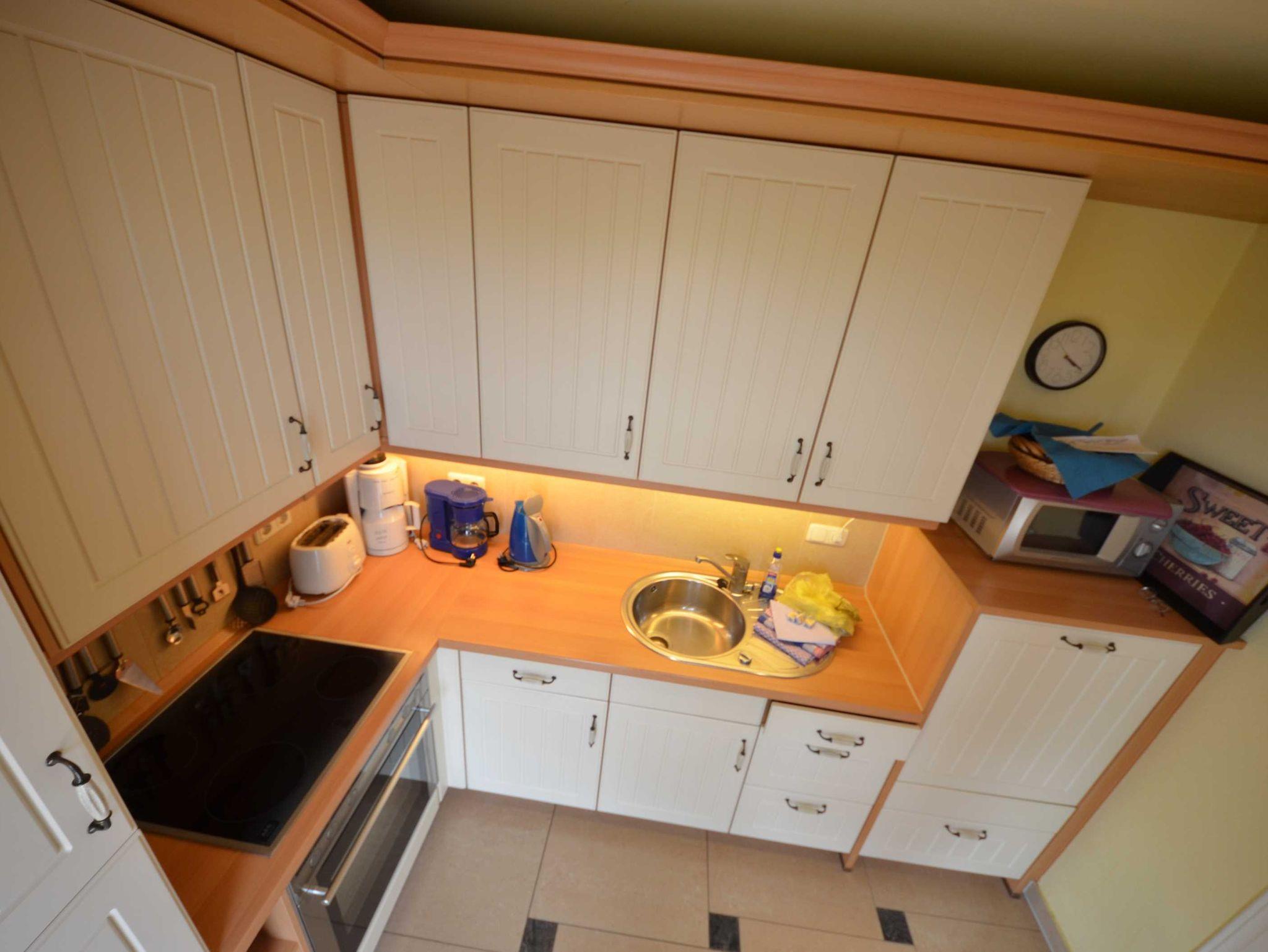 Mit Ausgang zur großen Terrasse, schöne moderne Landhaus-Einbauküche in vanillegelb, Geschirrspüler höher gelegt, Mikrowelle, Herd mit Cerankochfeld und Backofen, Turmhaube, Kühlschrank mit 38 LGefrierteil, zwei Kaffeemaschinen, Wasserkocher, Eierkocher, Toaster, Waffeleisen, Mixer, ausreichend Edelstahltöpfe, Schnellkochtopf, Gewürze usw., sehr schönes Geschirr, Auswahl an Gläsern (ca. 50 Stk.)