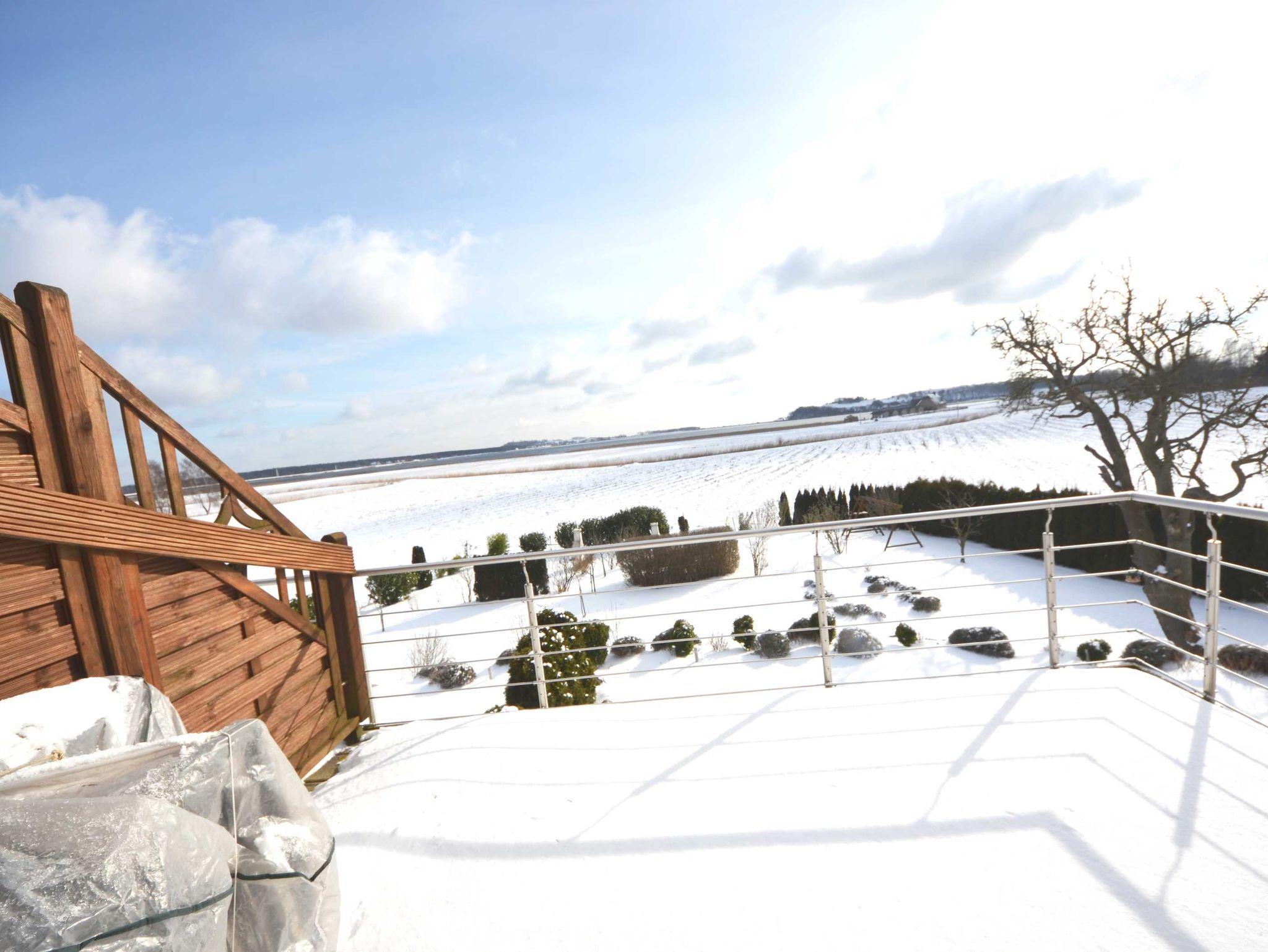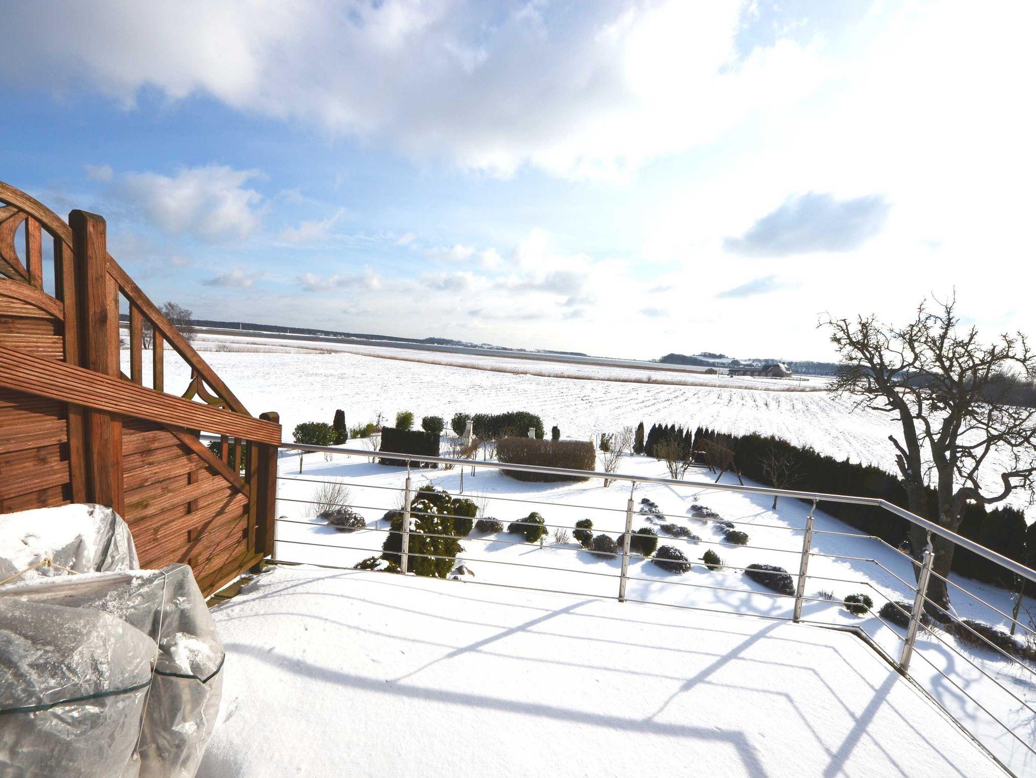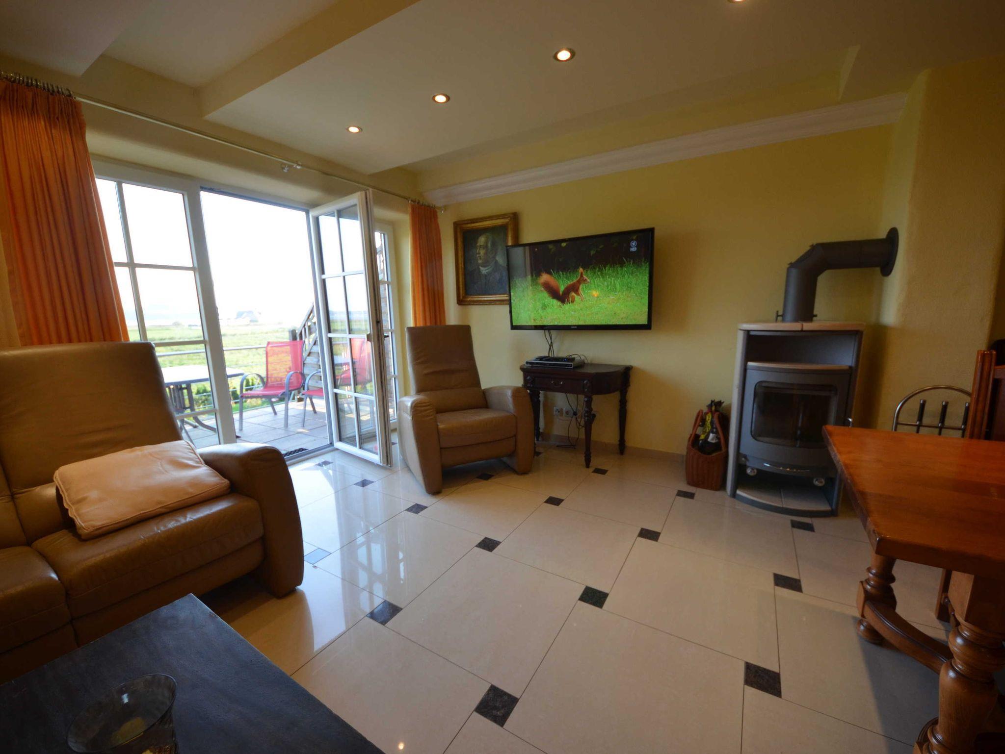 Wohnzimmer mit Essbereich und großem Hark-Kaminofen, wunderschöne 80 m² Terrasse mit fantastischem Blick auf die Ostsee, eigener Strandkorb auf der Terrasse, Gartenmöbel, Landhaus-Küche, zwei Schlafzimmer, ein Granit-Bad, Abstellraum. Fußbodenheizung in Wohnzimmer, Küche, Flur und Bad.