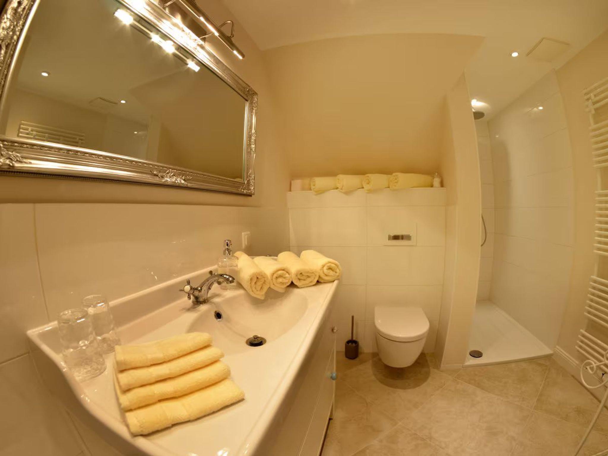 Flur mit Garderobe, Spiegel,Schuhablage.Einbauschrank mit Reinigungsuntersilien.Neues Bad mit ebenerdig begehbarer Dusche und Regenbrause,Waschbecken,WC, beheizbaren Handtuchhalter,großer Spiegel und ausreichende Ablagefläche und Stauraum,Haarfön.