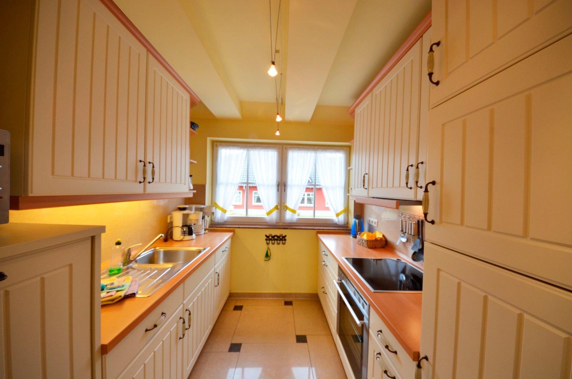 sehr dekorative Landhaus-Einbauküche in vanillegelb, Geschirrspüler höhergelegt, Mikrowelle, Herd mit Ceran-Kochfeld und Backofen, Flachschirm-Dunstabzugshaube, großer Kühlschrank mit 38Ltr. Gefrierteil. 2 Kaffeemaschinen, Wasserkocher, Eierkocher, Toaster, Waffeleisen, Mixer, ausreichend Edelstahl-Töpfe Schnellkochtopf, Gewürze, sehr schönes Geschirr, Auswahl an Gläsern