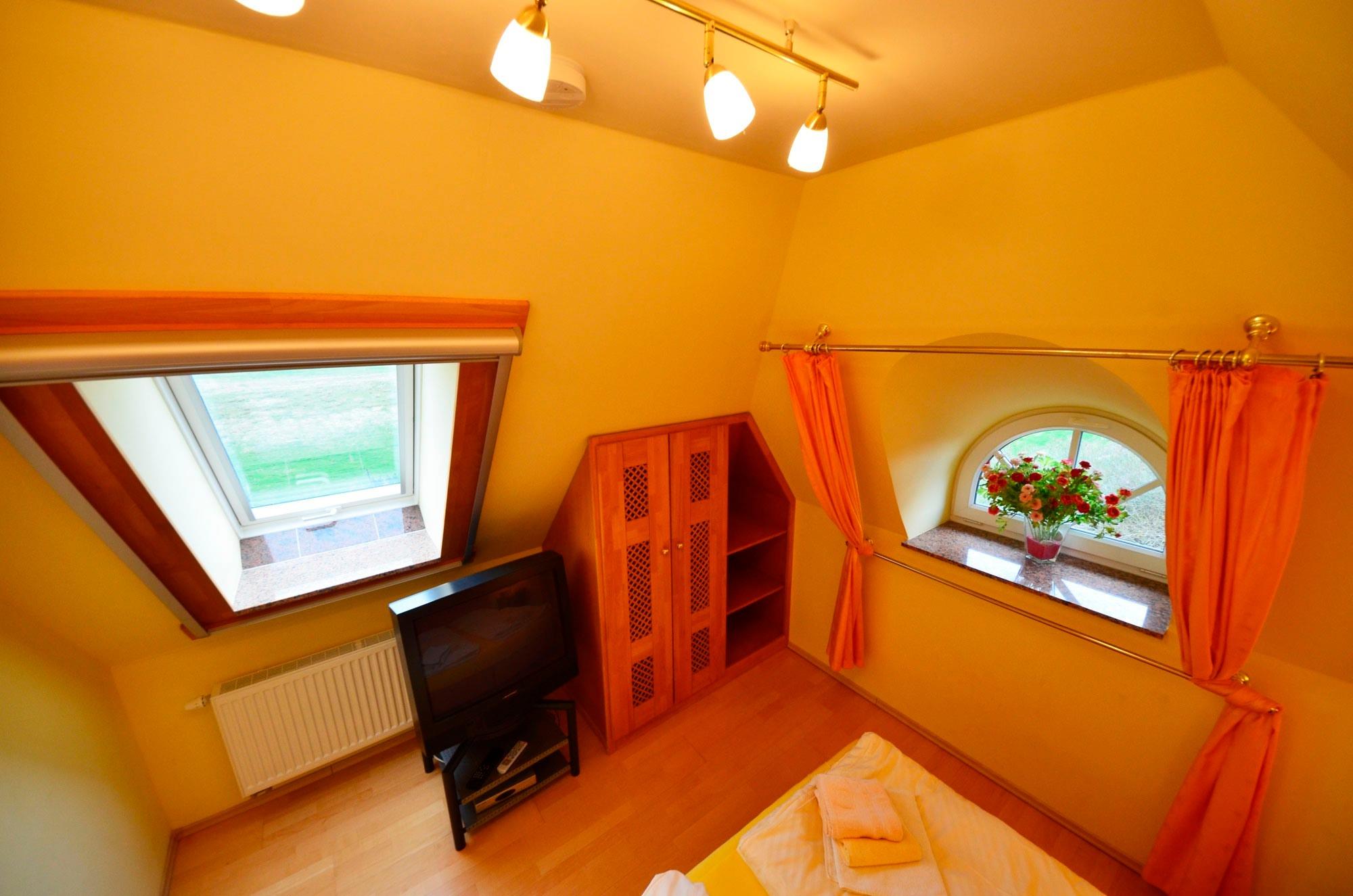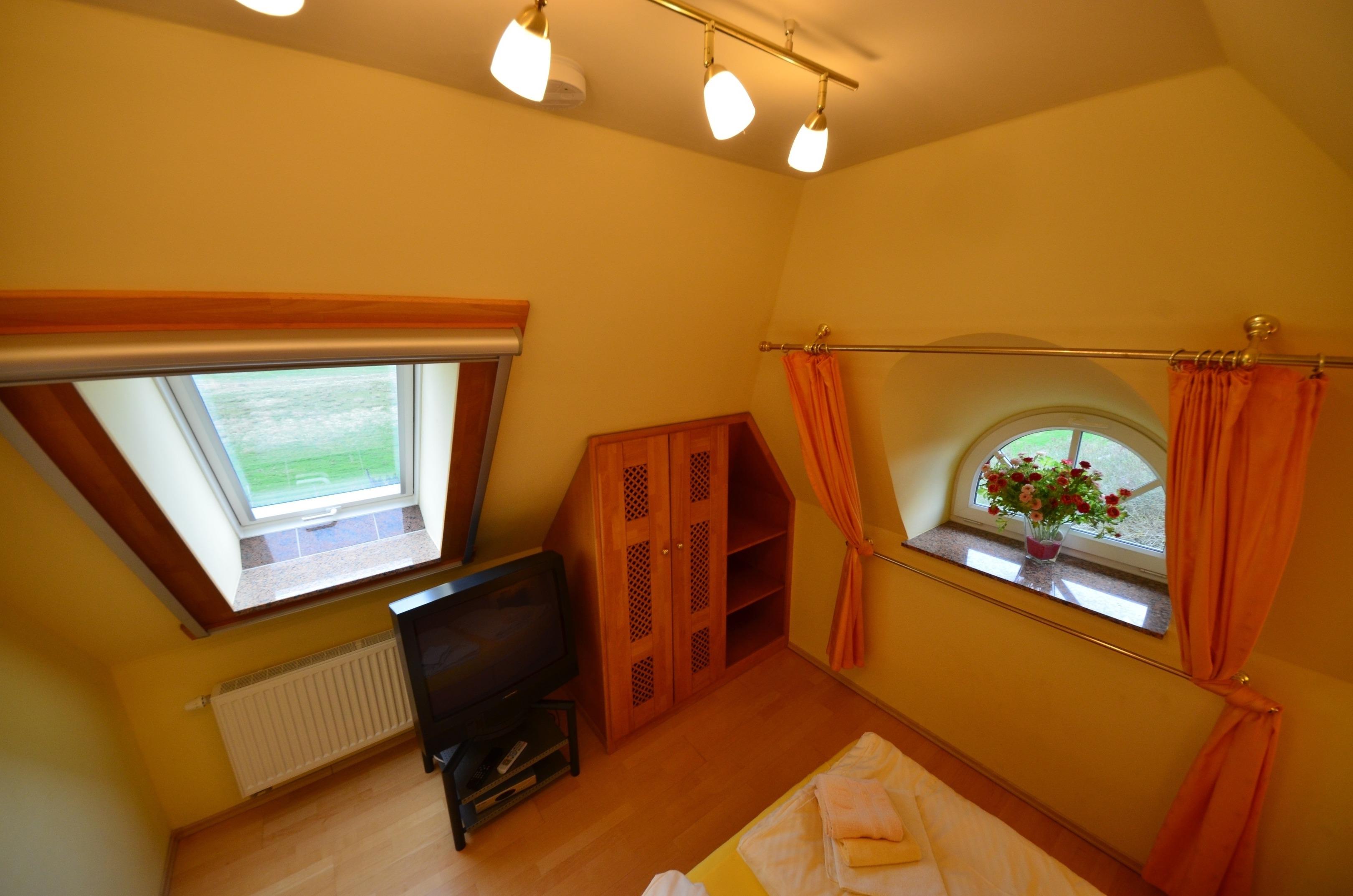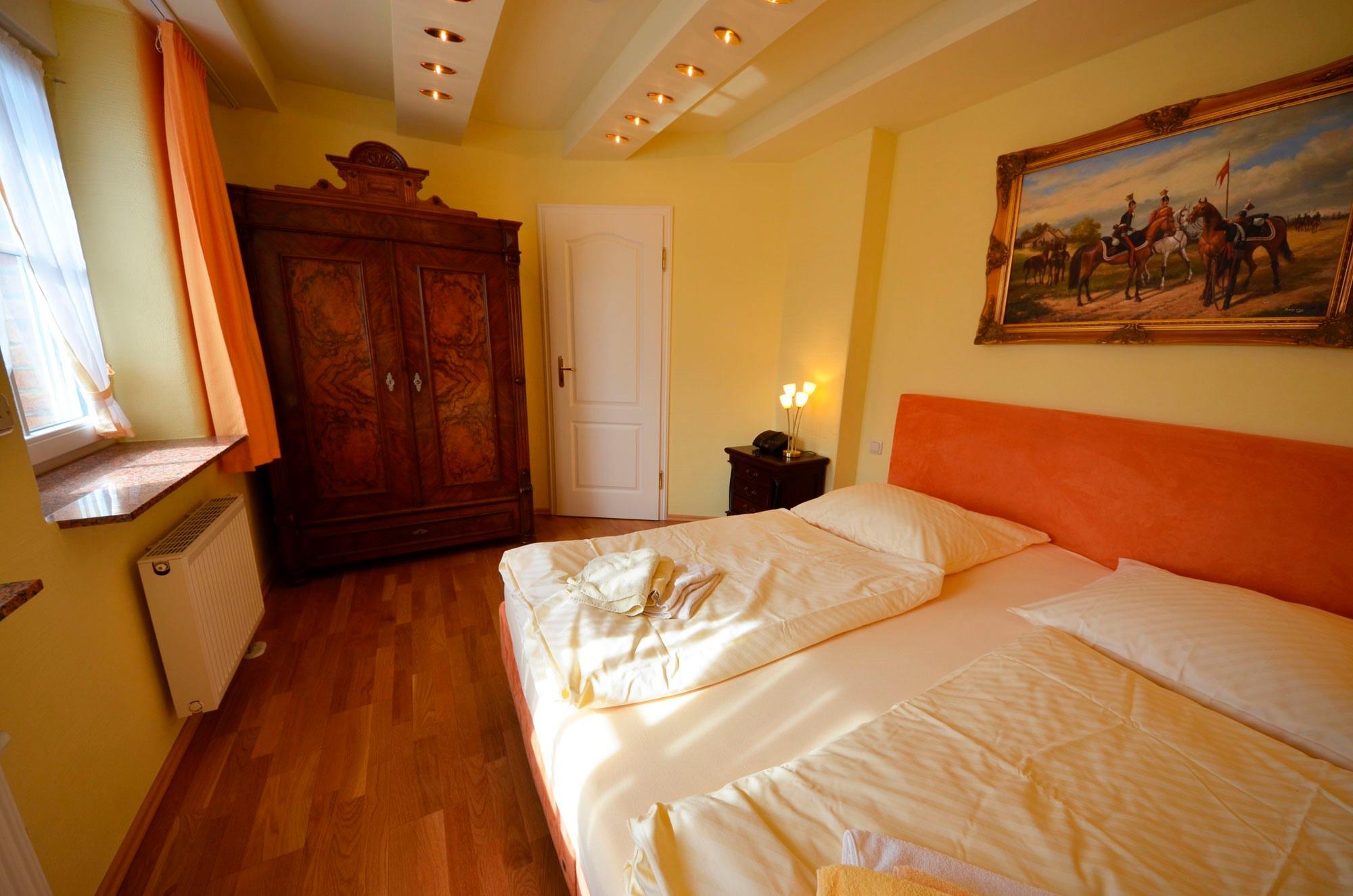 Radiowecker, Wände mit Bildern dekoriert, antiker - Gründerzeit Wäsche/Kleiderschrank, elektrische Rolläden, Fenster mit Mückenschutz