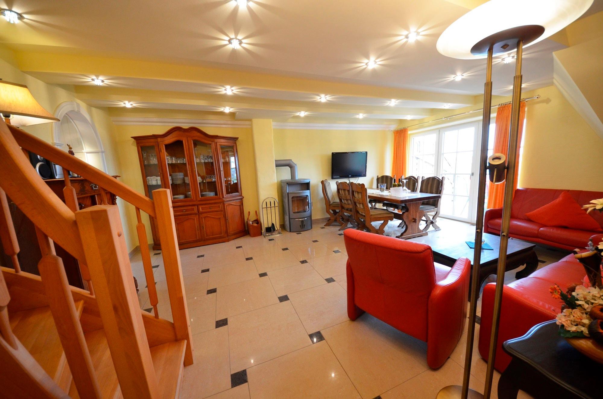 Großzügiges Wohn-Esszimmer mit Ausgang zum großen Balkon mit direktem traumhaften Blick auf die Ostsee, den kleinen Hafen von Groß Zicker und die gegenüber der Bucht liegenden Orte Thiessow und Klein Zicker. Schöne Ledergarnitur mit Opiumtisch. Speisetafel mit 6 Stühlen, großer Hark-Kaminofen, antike Vitrinen, kleine Bücherauswahl, Plasma-TV mit 125 cm Großbild, Fußbodenheizung, DVD-Recorder, Stereoanlage, CD-Player, Kinderhochstuhl, Wände dekoriert mit Spiegeln und Gemälden, sehr ansprechende Beleuchtung