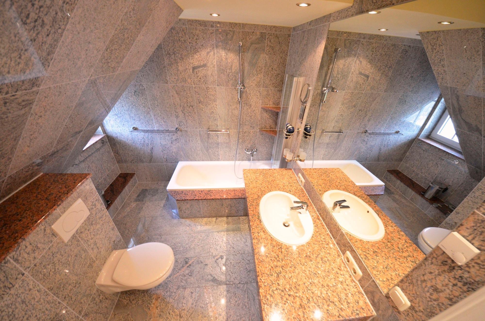 1x Badewanne mit Glas-Duschabtrennung, Toilette und Bidet, 1x Duschbad, Granitverkleidung, Fußbodenheizung, Granit-Abdeckungen, große Spiegel, schöne Sanitärausstattung, Einbau-Waschbecken, beheizbarer Handtuchhalter, Fön, Schminkspiegel, dekorative Beleuchtung