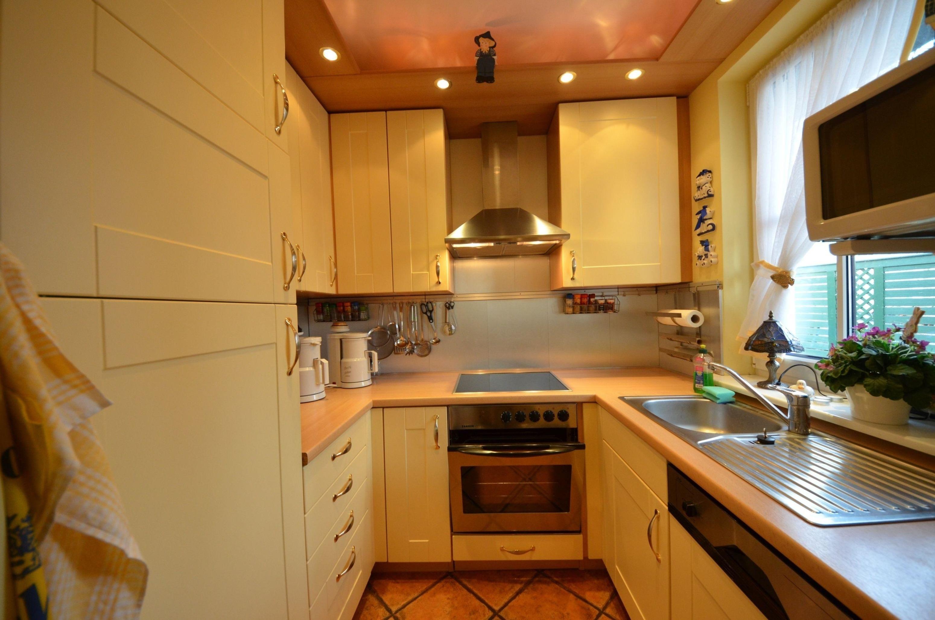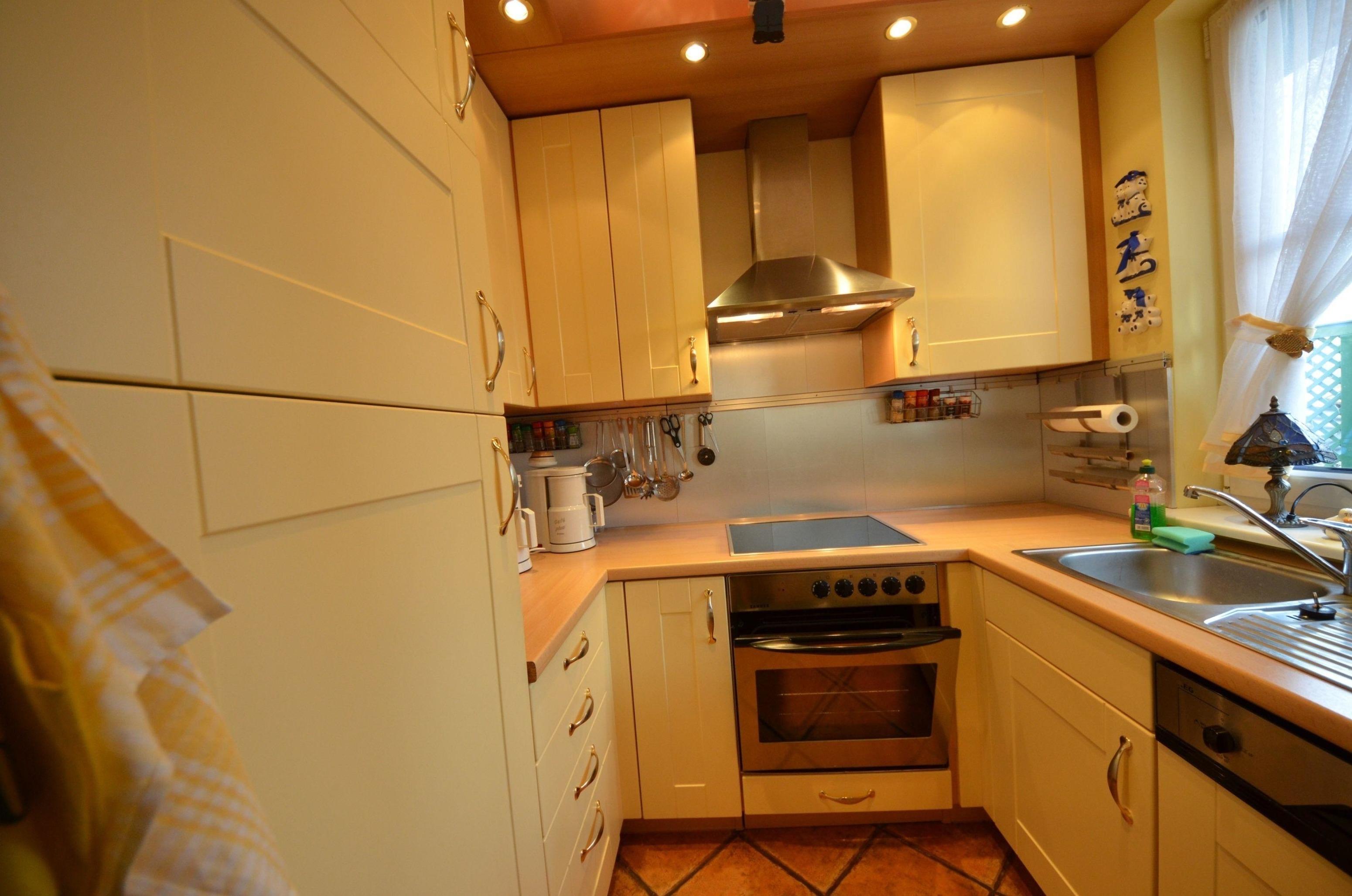 Fußbodenheizung, moderne Einbauküche in arktisgelb, Geschirrspüler, Mikrowelle, Herd mit Ceran - Kochfeld Turmhaube und Backofen, Kühlschrank mit Gefrierteil,