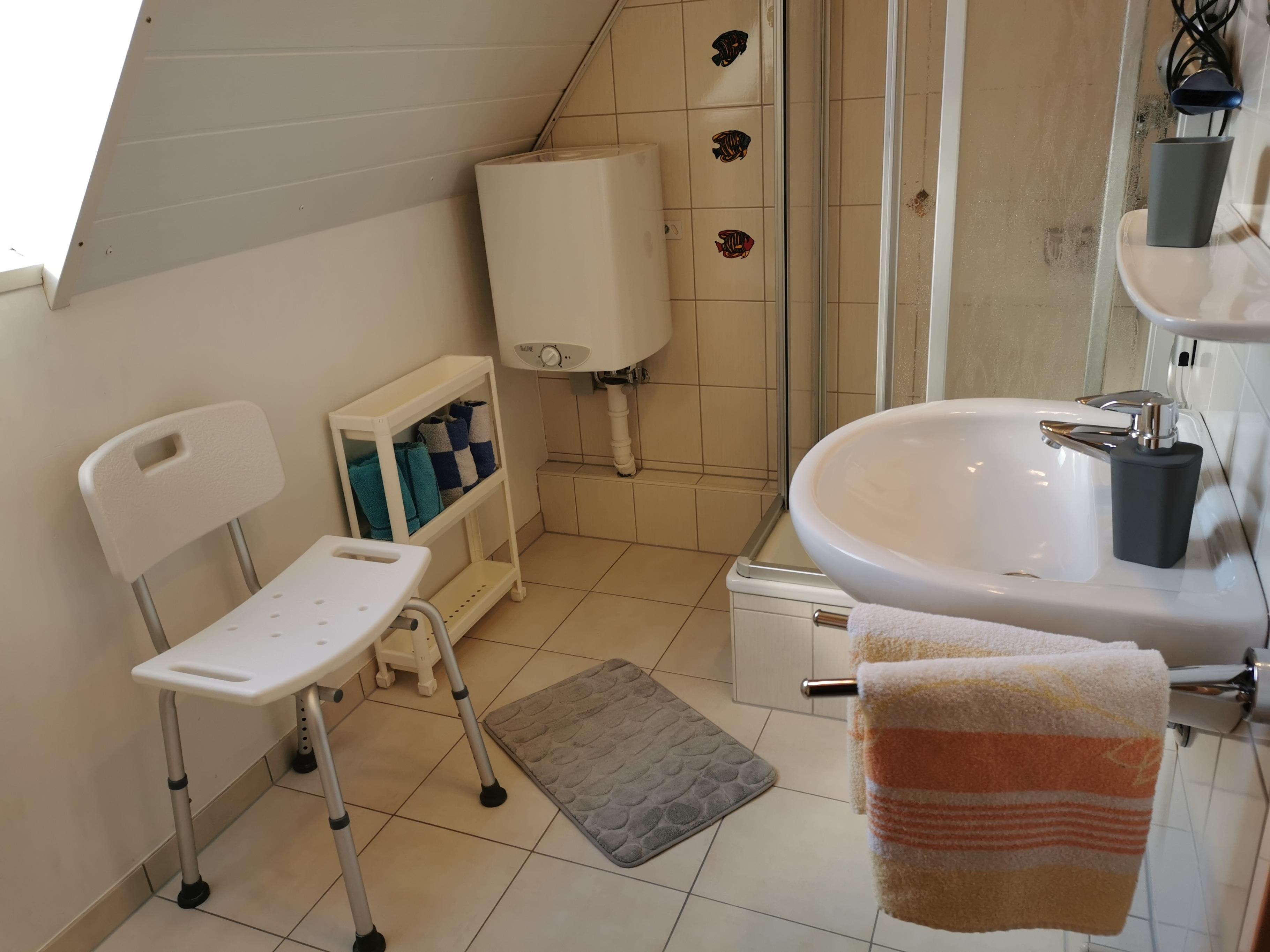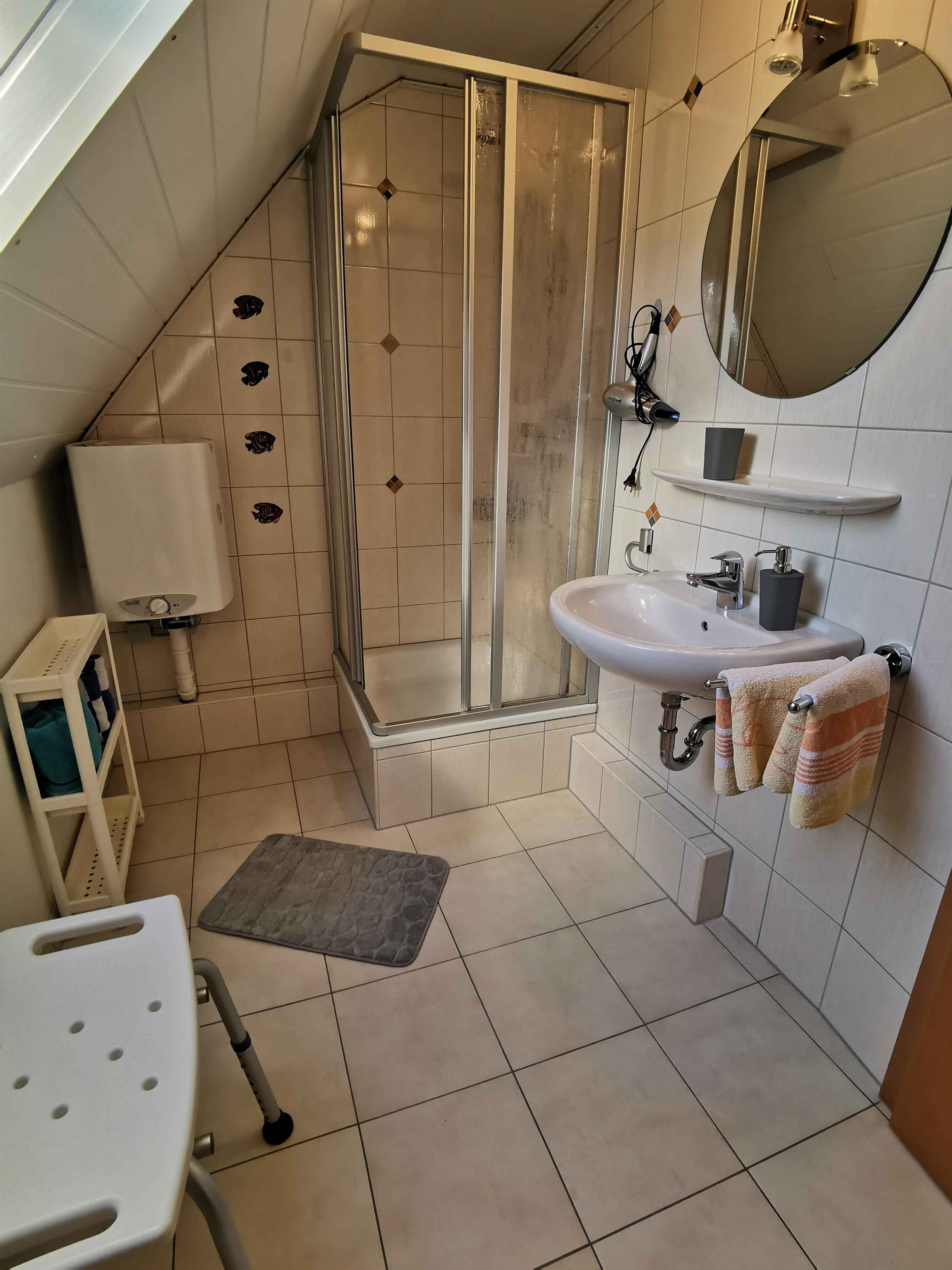 Das saubere Badezimmer ist einer Dusche ausgestattet,