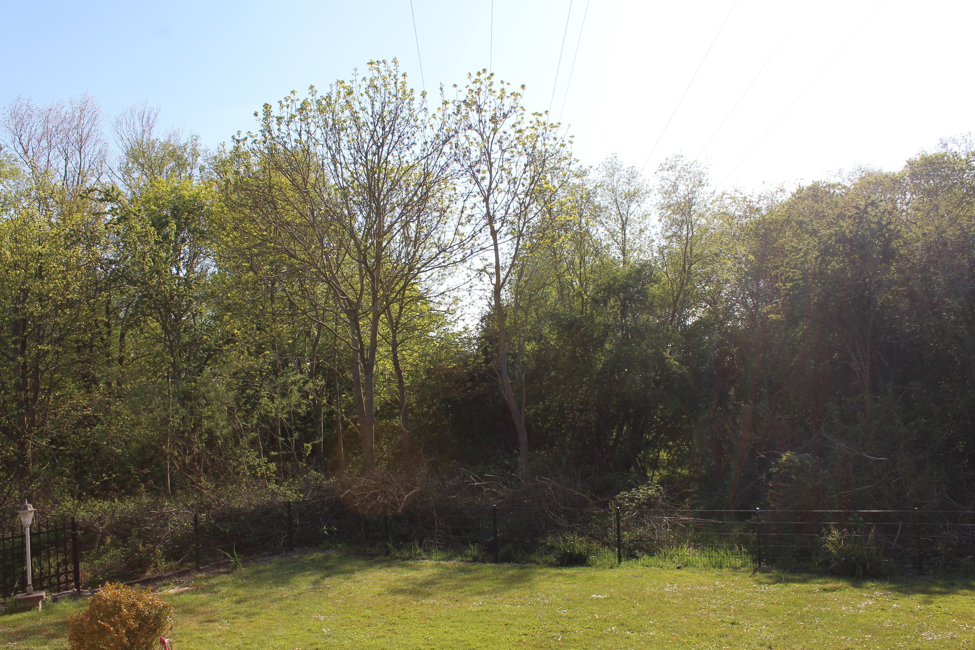 Der Garten ist eingezäunt und hat noch eine Terrasse mit einer Markise.