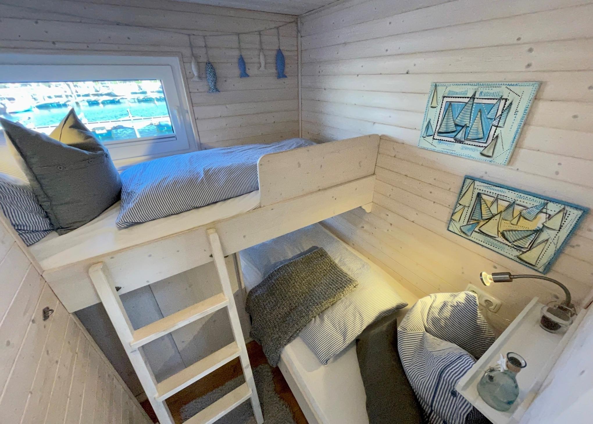 Ein Raum mit Doppelbett (160x200 cm) und im zweiten Schlafraum zwei Einzelbetten (90x200 cm) davon eins als Hochbett mit Leiter und Rausfallschutz.