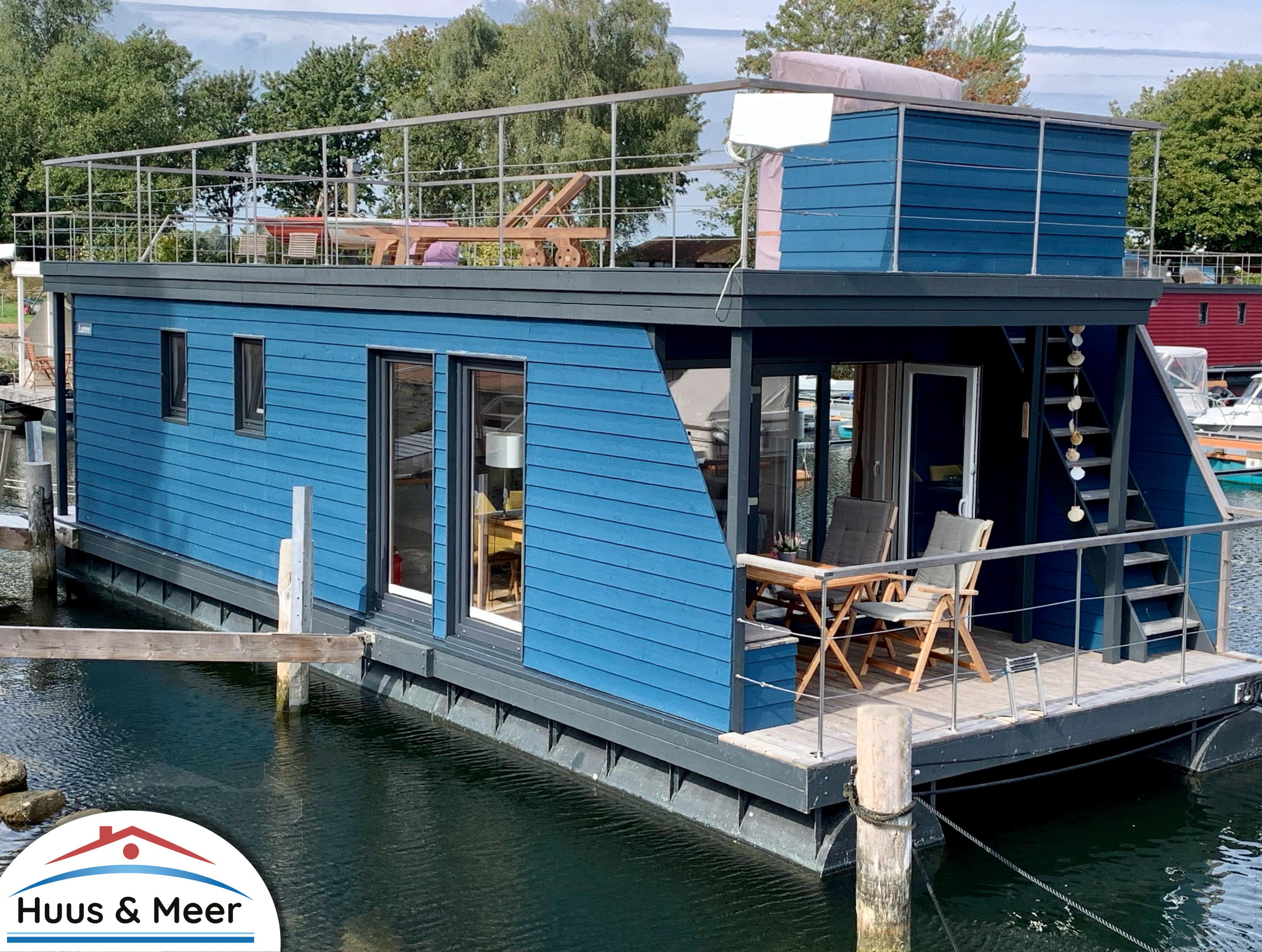 Modernes Hausboot "Lumme" in Großenbrode mit Dachterrasse und Hafenblick für erholsamen Strandurlaub.