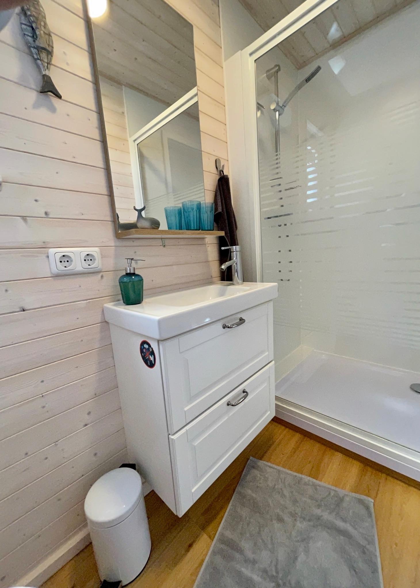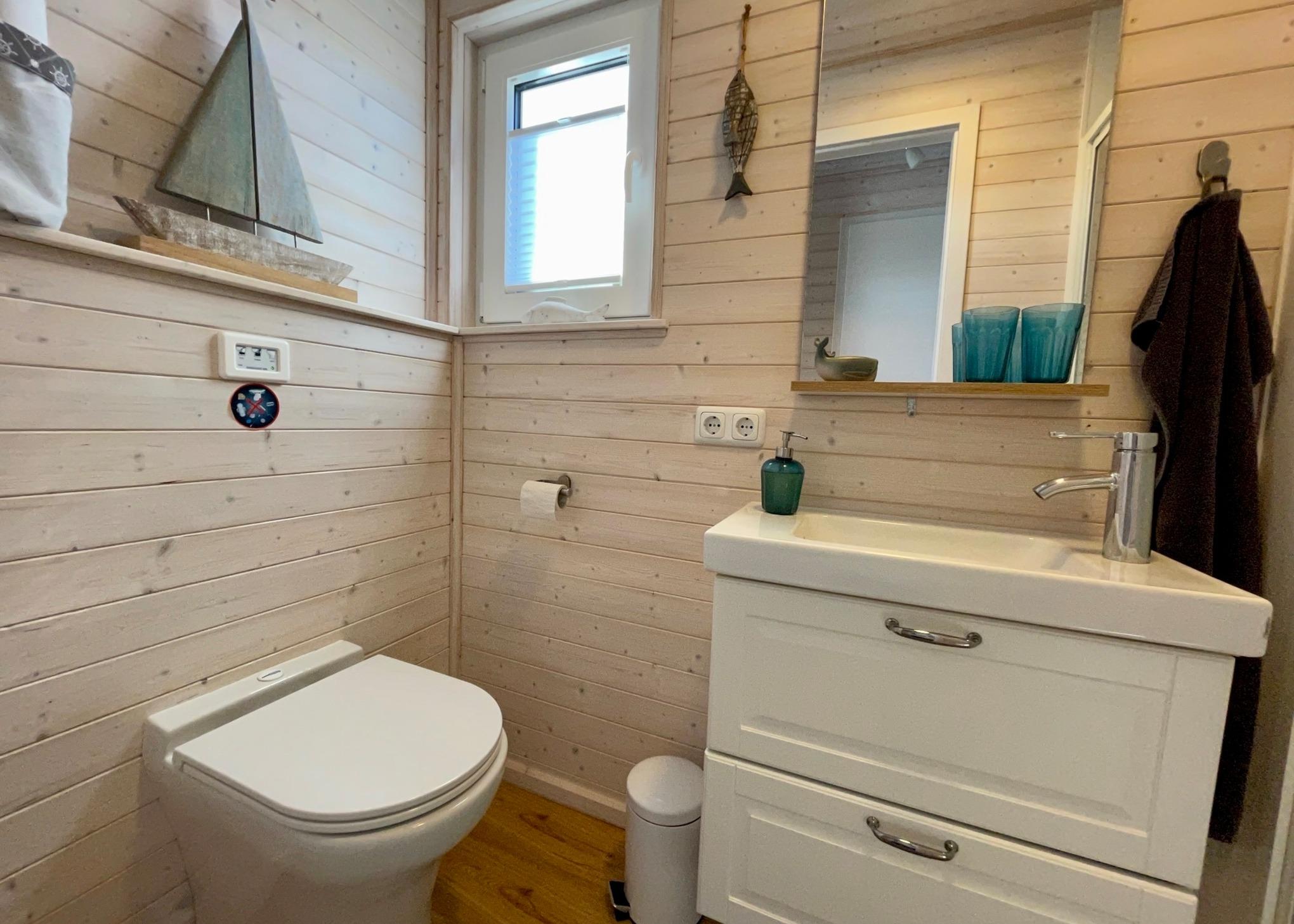 Das Badezimmer verfügt über WC, Dusche und Handwaschbecken.