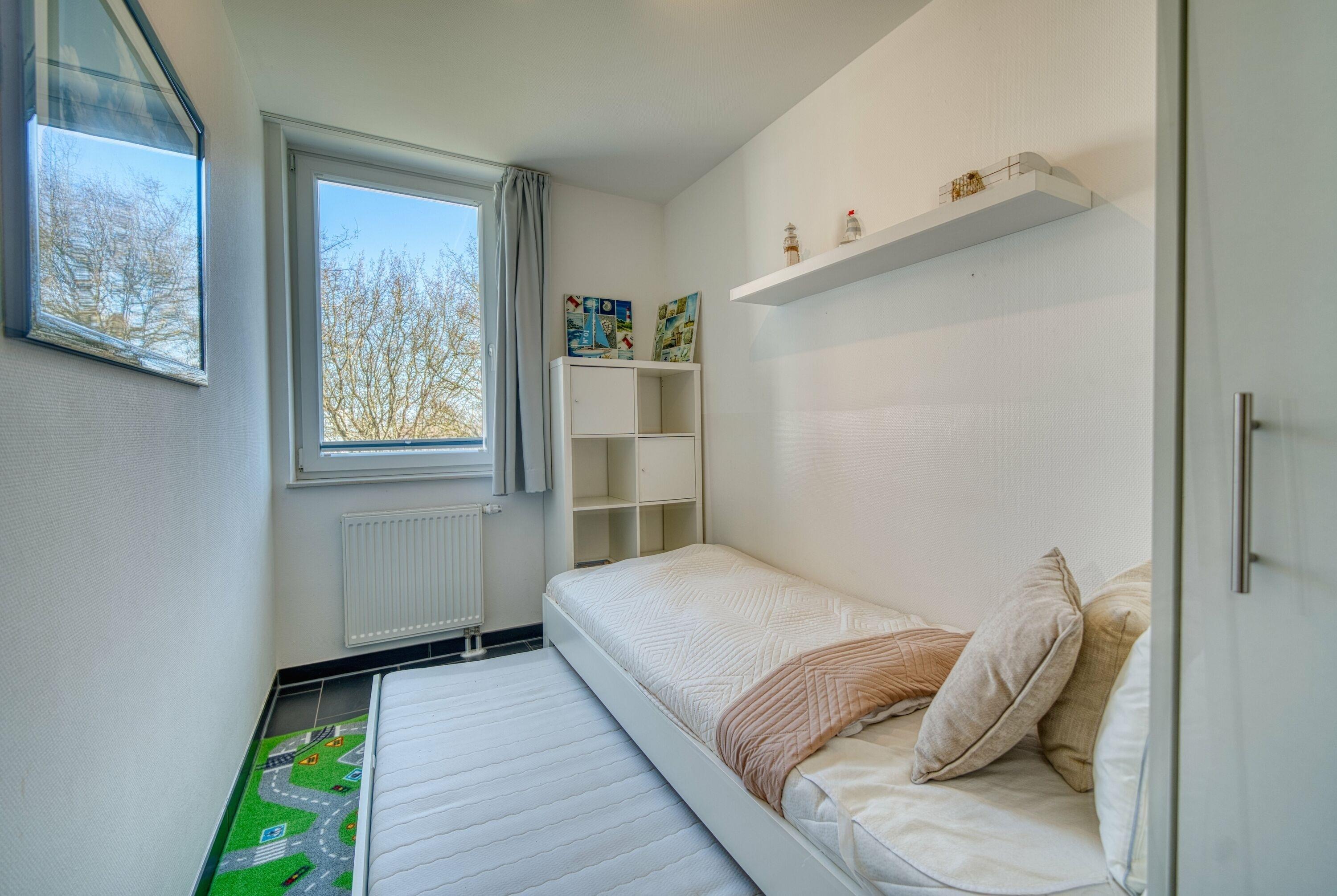 Zwei Schlafzimmer: eines mit Doppelbett (160 × 200 cm), eines mit zwei Einzelbetten als Ausziehbetten (je 90 × 200 cm).