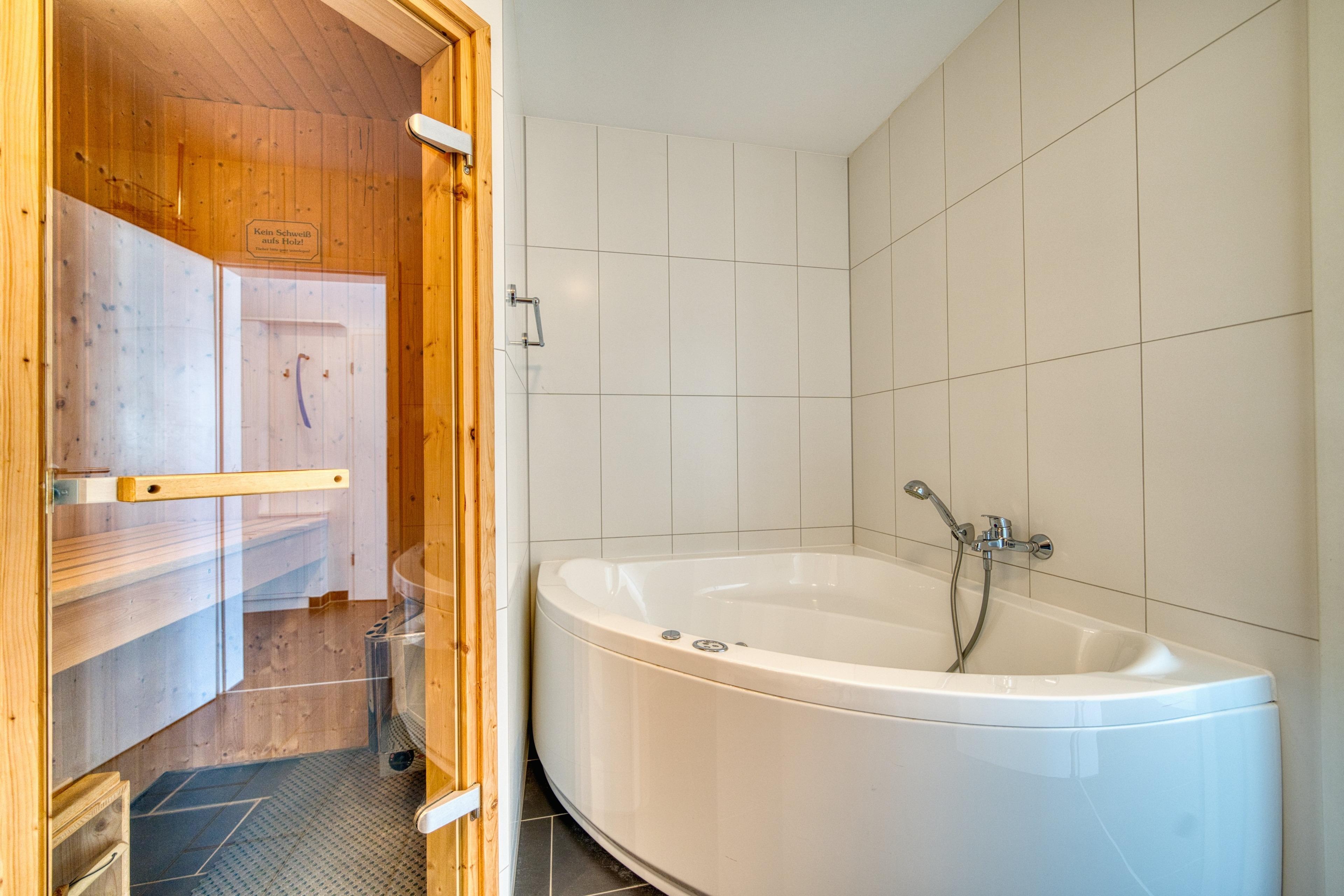 Badezimmer mit Dusche, Whirlpool und Sauna. Fußbodenheizung in Wohnräumen, Küche und Bad.