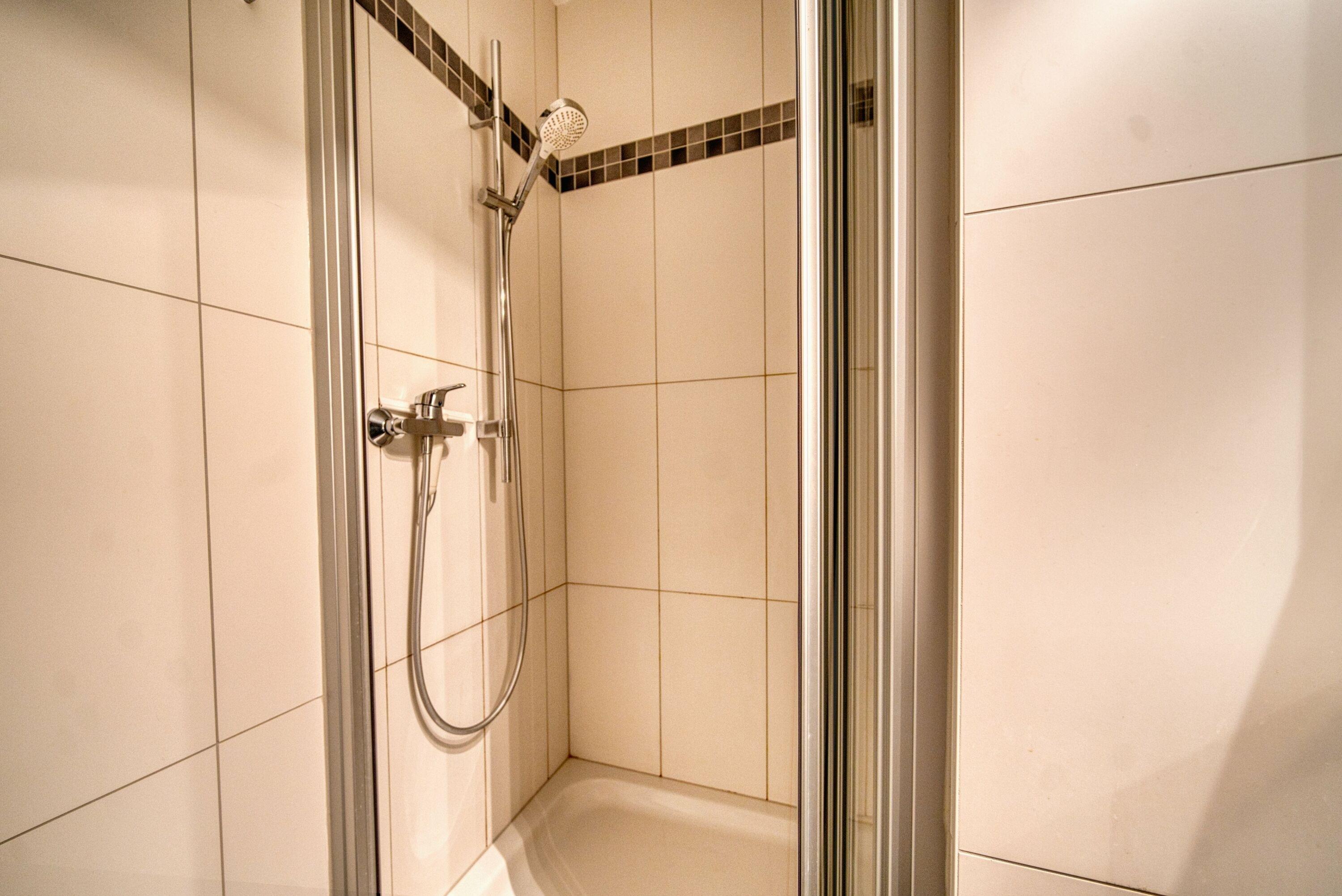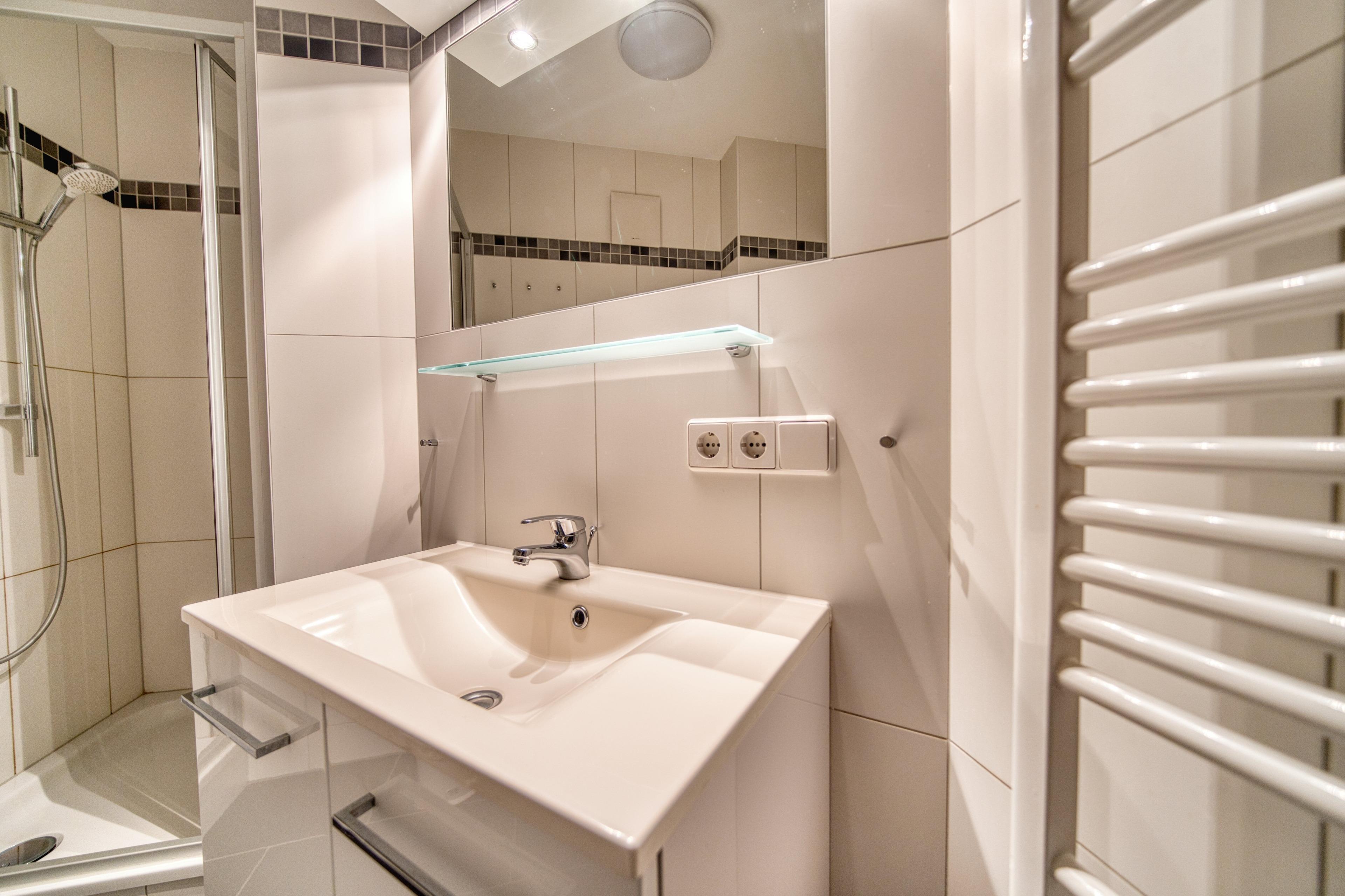Badezimmer mit Dusche und Regendusche. Fußbodenheizung in Wohnräumen, Küche und Bad.