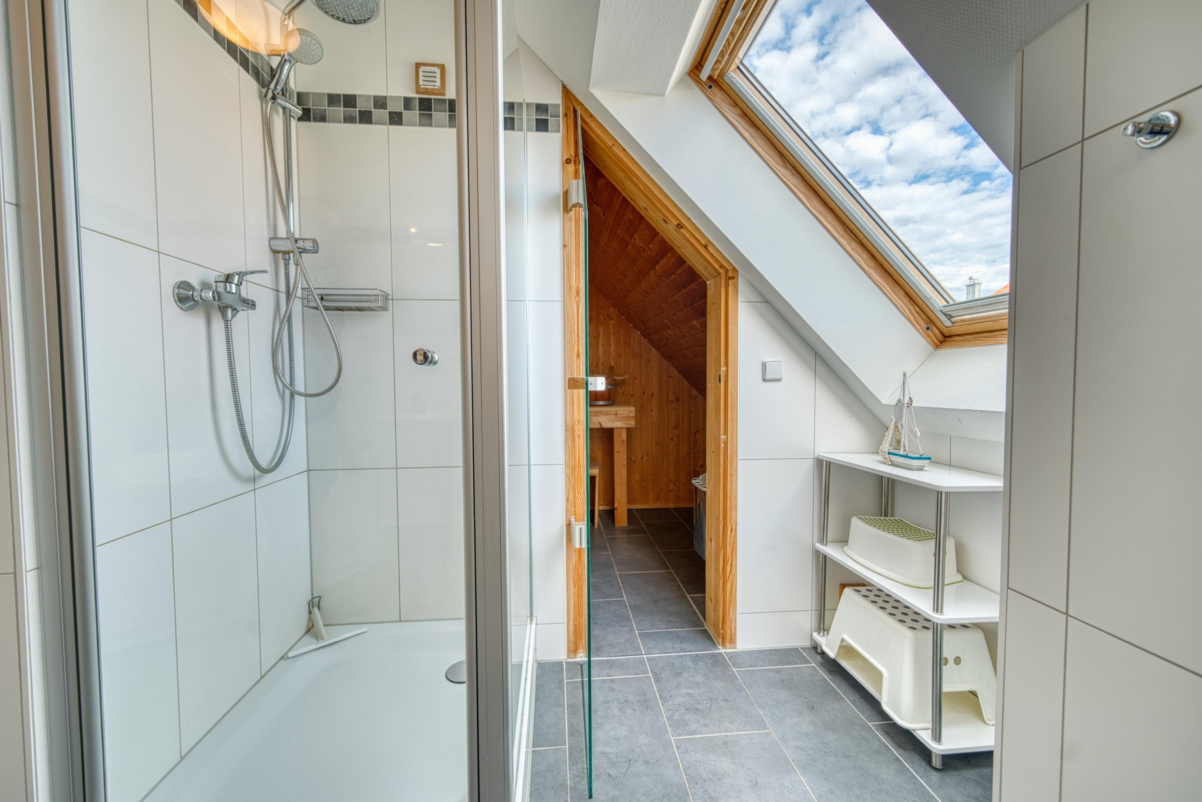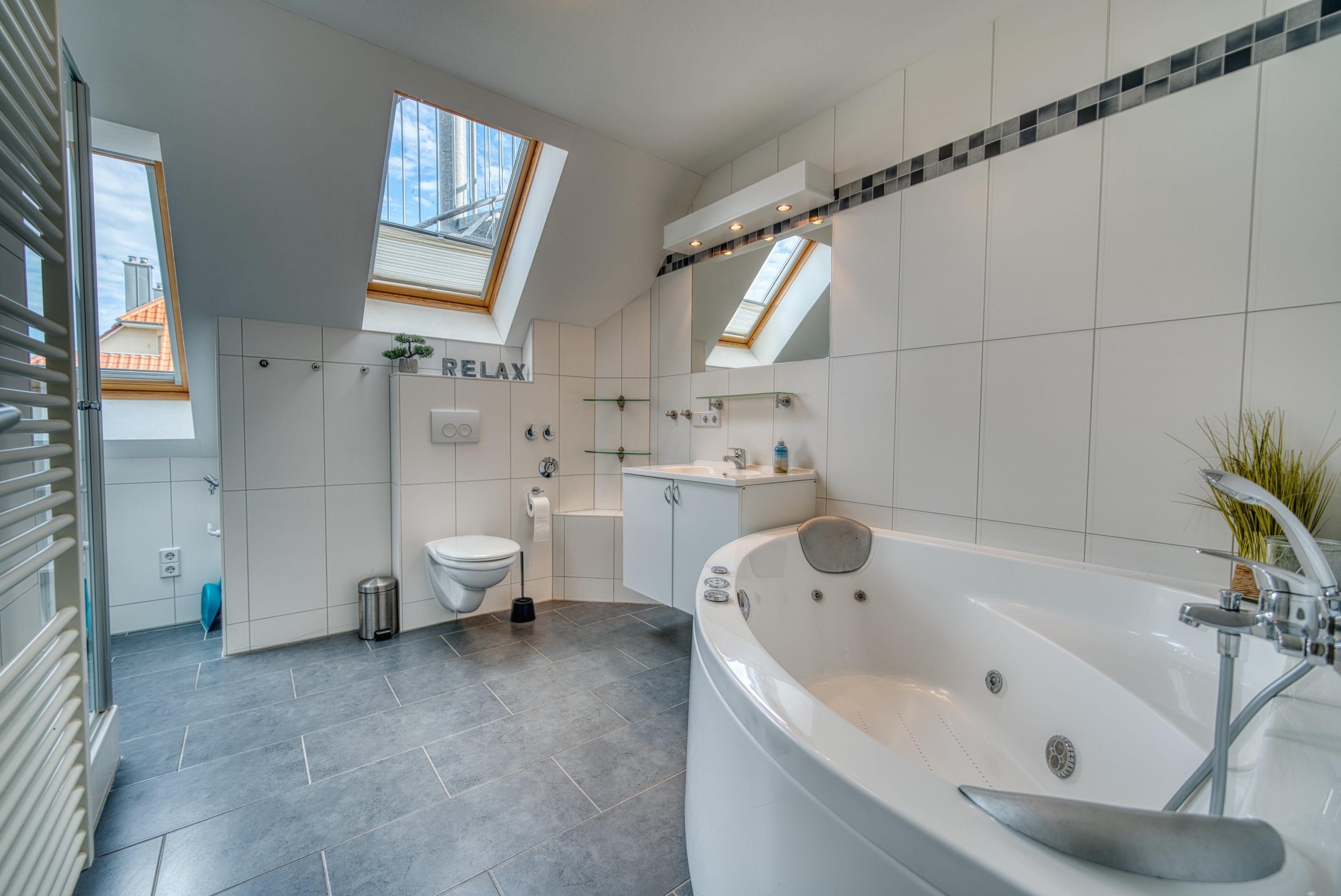 Badezimmer mit Regendusche, Whirlpool und Sauna. Fußbodenheizung in Wohnräumen, Küche und Bad.