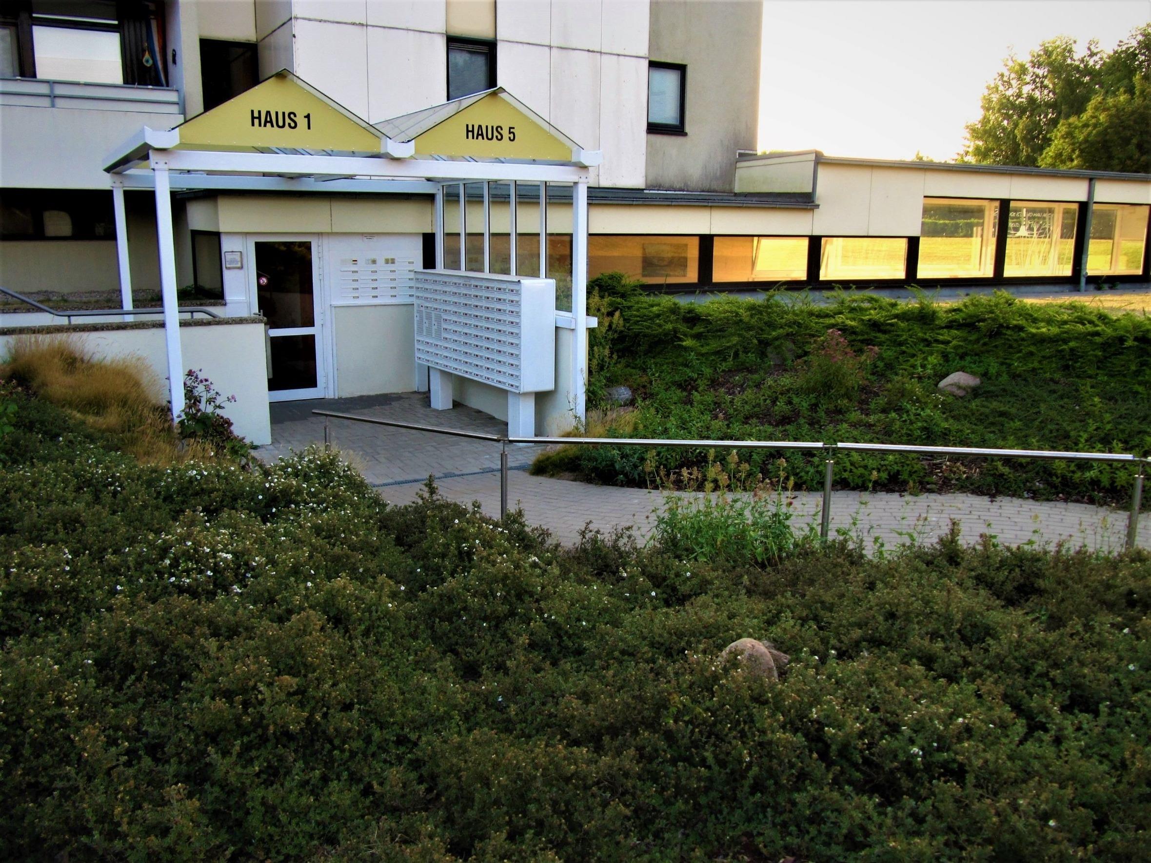 Die Anlage hat einen eigenen Parkplatz mit Schranke. Den Haupteingang von Haus 1 finden Sie am Westflügel des Gebäudes, im Übergang zum Haus 5. Von dort gelangen Sie über einen Flur zu den Aufzügen. Die Ferienwohnung liegt im 4. Stock.