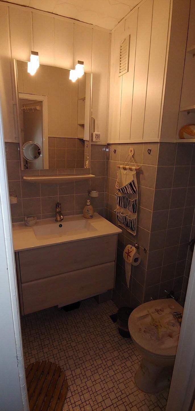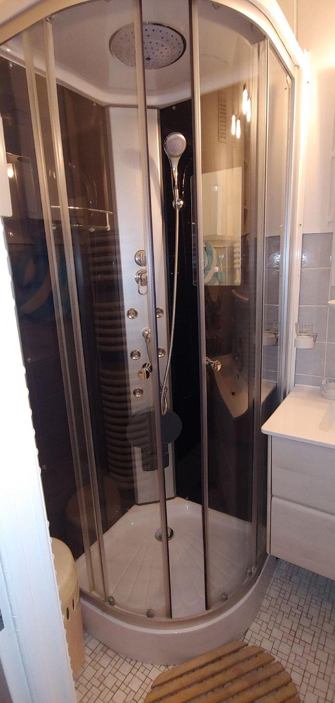 Im Badezimmer erwartet Sie eine Halbrunddusche mit Holzausstieg. Im Waschbeckenunterschrank können Sie Ihre Waschutensilien unterbringen. Der Spiegel über dem Waschbecken wird mit zwei Lampen beleuchtet. Ein Föhn ist vorhanden.