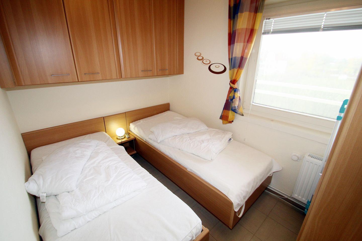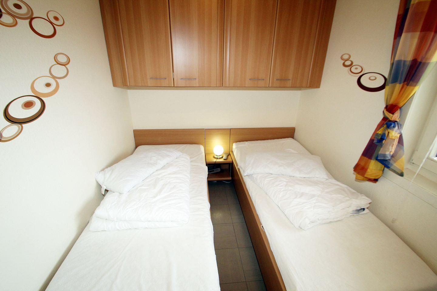 Im separaten Schlafzimmer sorgen zwei Einzelbetten (je 80*190 cm) mit offenem Fußende für eine angenehme Nacht. Das Fenster ist mit einer Jalousie zum Verdunkeln sowie einem Fliegengitter versehen. Über den Betten sorgen weitere Schränke zusätzlich zum Kleiderschrank für genügend Verstaumöglichkeiten Ihres Kofferinhaltes - auch für längere Aufenthalte.