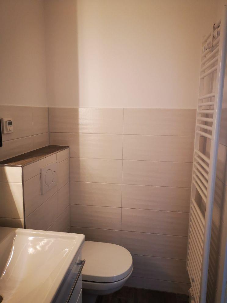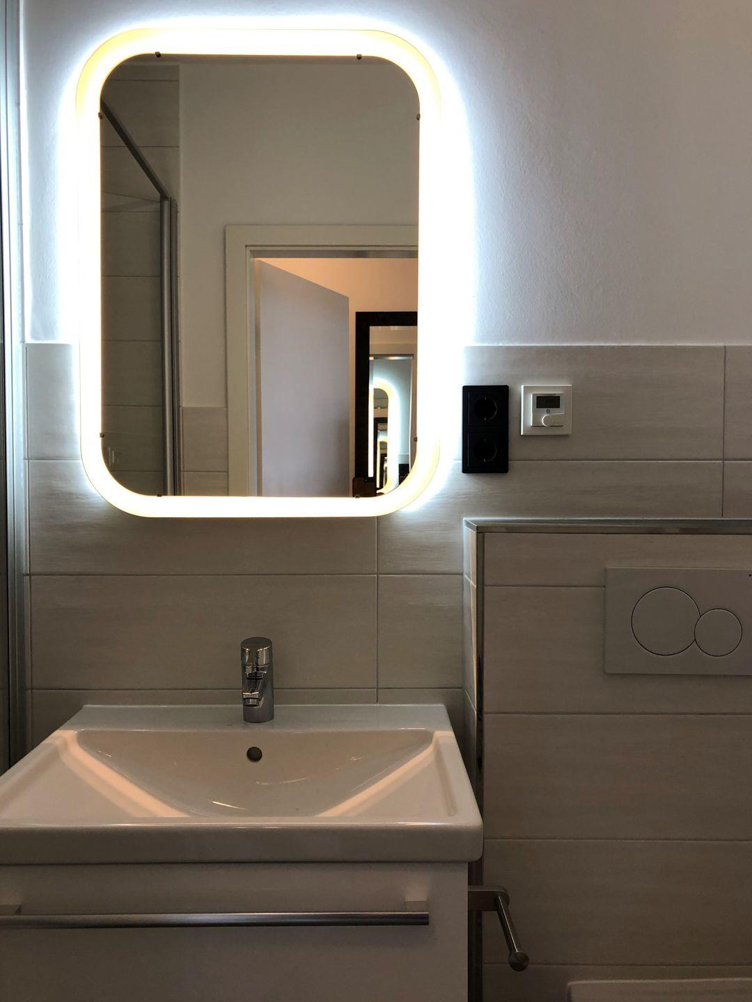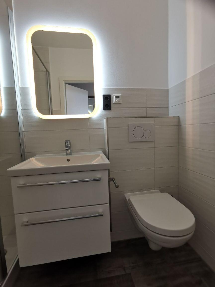 Das neue, hell geflieste Bad verfügt über eine besonders geräumige Dusche mit Glaswänden und extra flachem Einstieg. Handtuchheizkörper, Steckdosen, ein Waschbeckenunterschrank mit Schubladen sowie ein beleuchteter Spiegelschrank sind weitere Annehmlichkeiten die Ihnen dieses Duschbad im Urlaub bietet.
