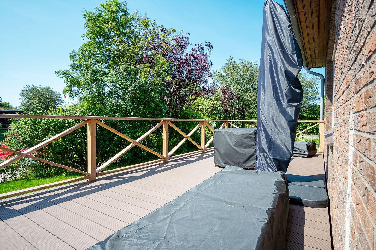 Besonders hervorzuheben ist die traumhafte Terrasse, welche aufgrund der guten Sonnenlage den ganzen Tag zum Sonnenbaden einlädt. Hier stehen für Sie Gartenmöbel, ein große Markise und Relax-liegen bereit, der vorhandene Grill rundet das Angebot für einen chilligen Sommerabend ab. Das ganze Haus bietet ausreichend Sichtschutz durch die vorhandenen Jalousien und Rollläden.