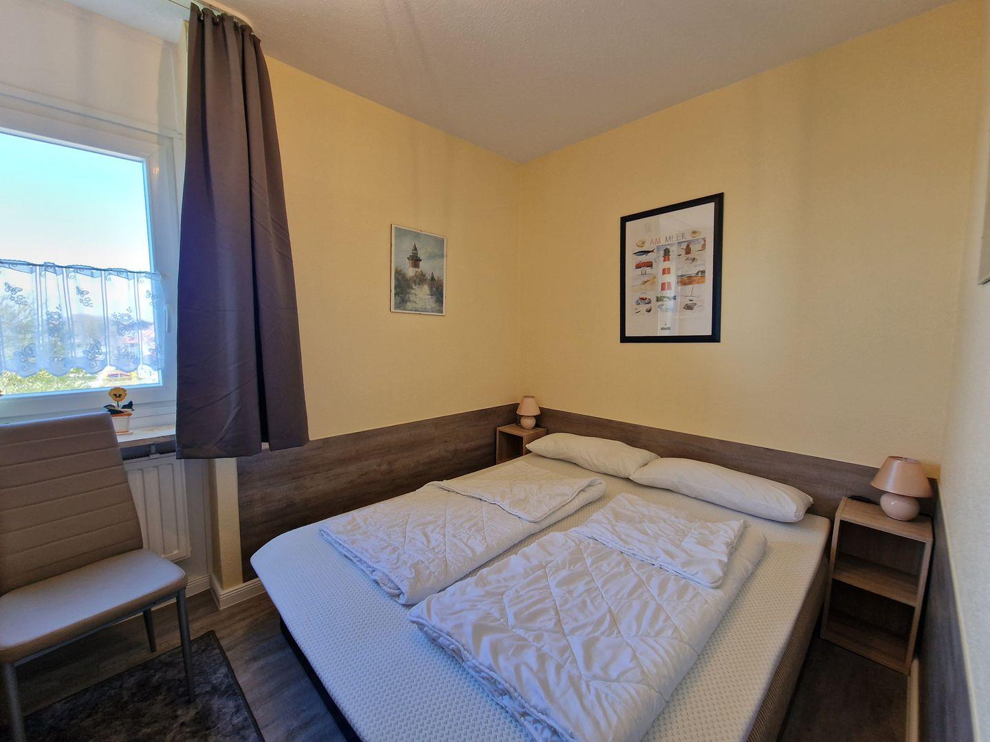 In dem separaten Schlafzimmer mit Ausblick auf den gesamten Südstrand mit Promenade befindet sich ein Doppelbett und ein Kleiderschrank.