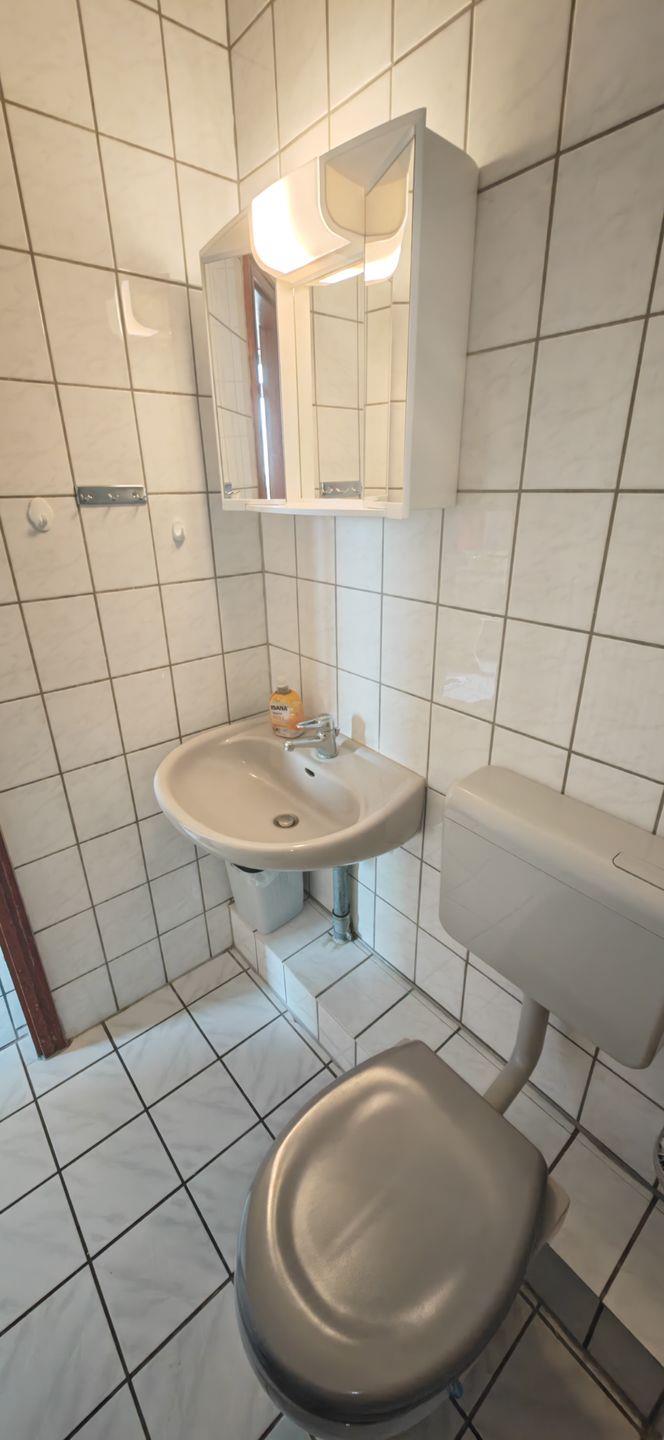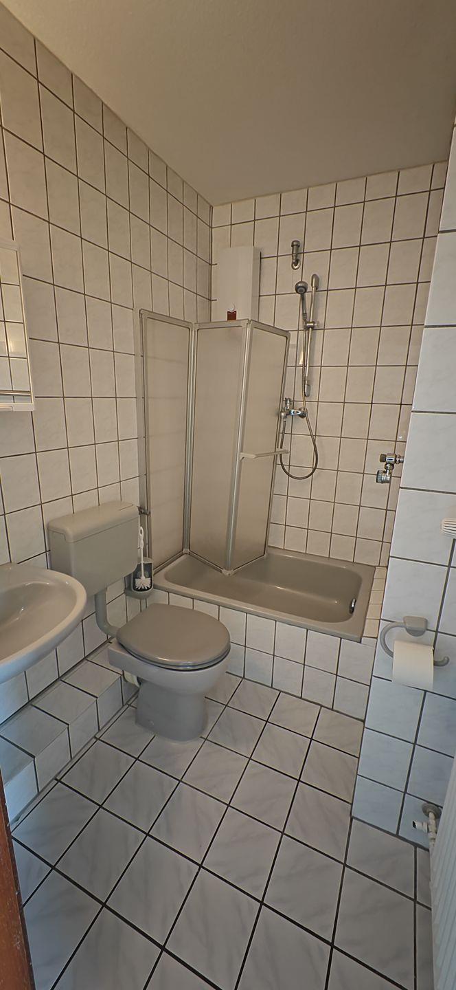 Im zentral gelegenen Bad befindet sich eine Duschwanne mit stabiler Abtrennung, Waschbecken und WC.